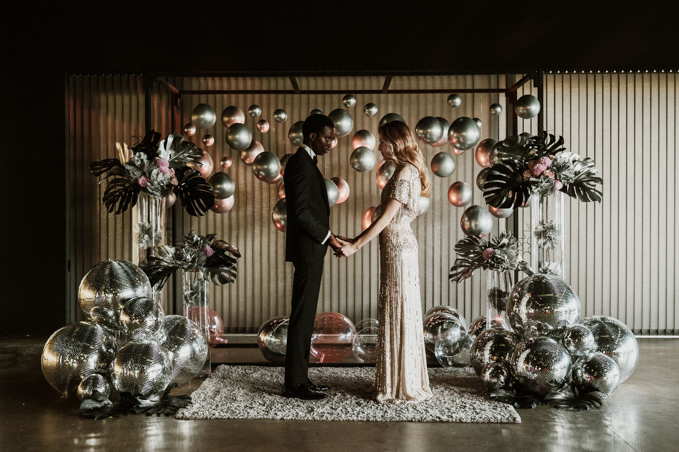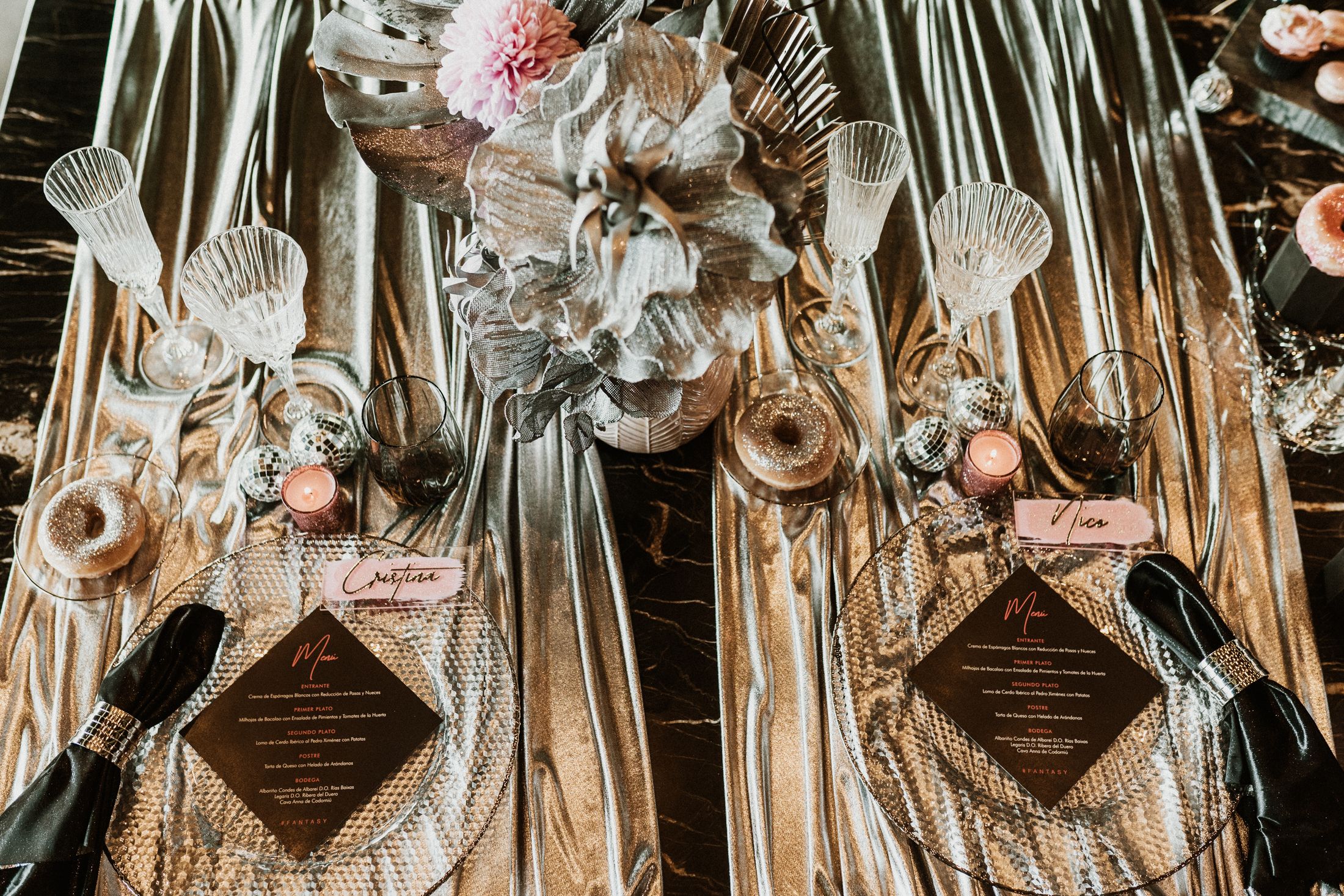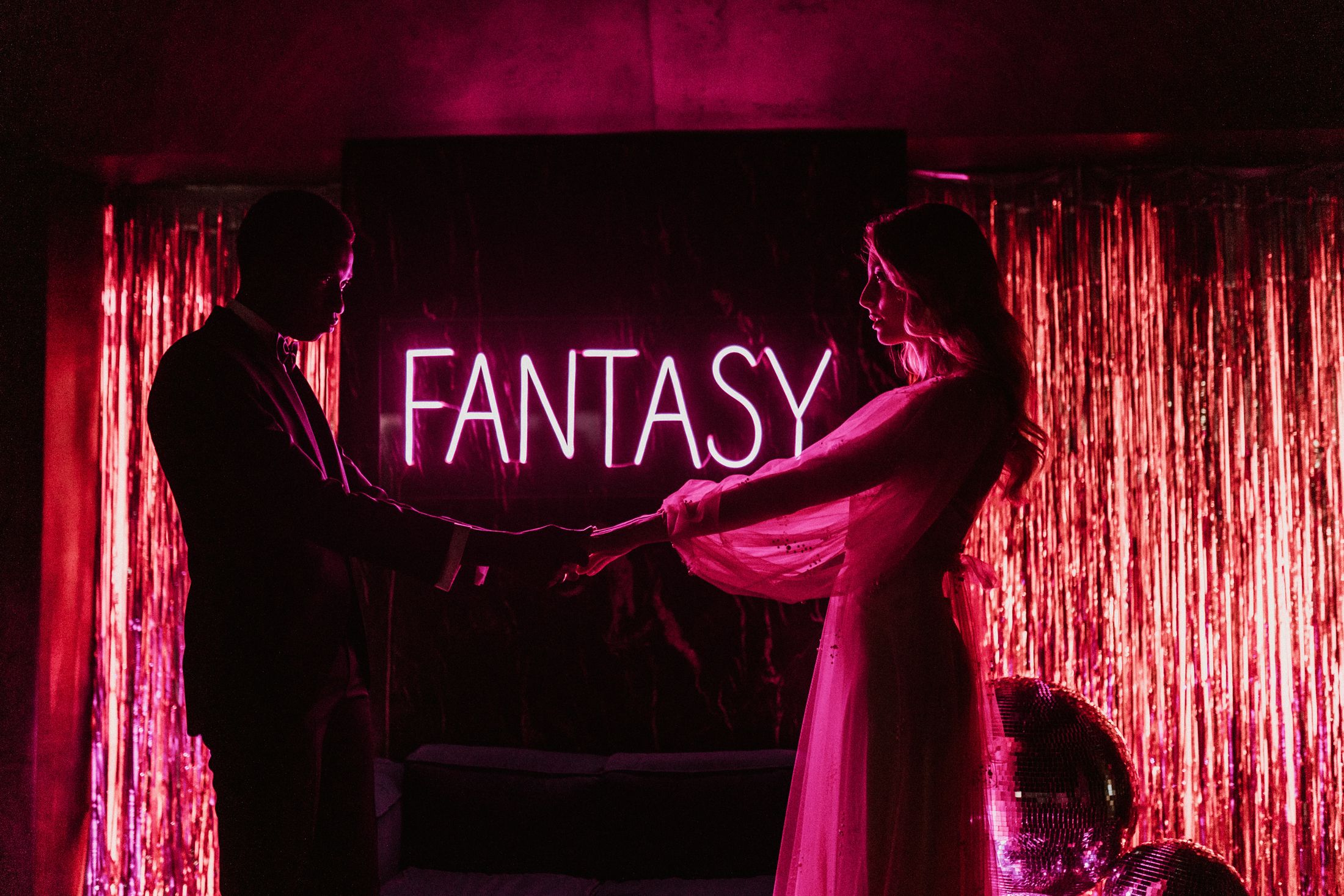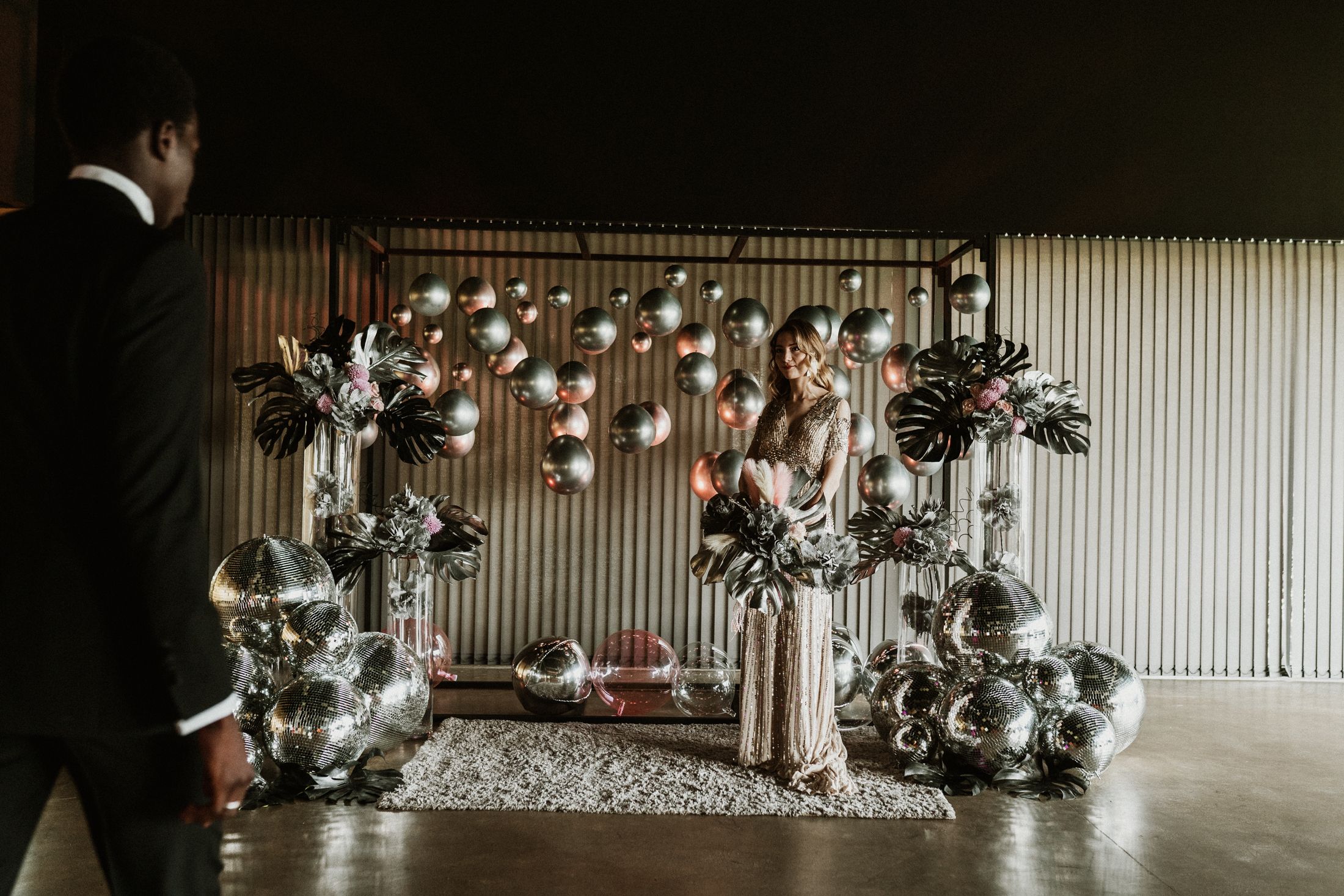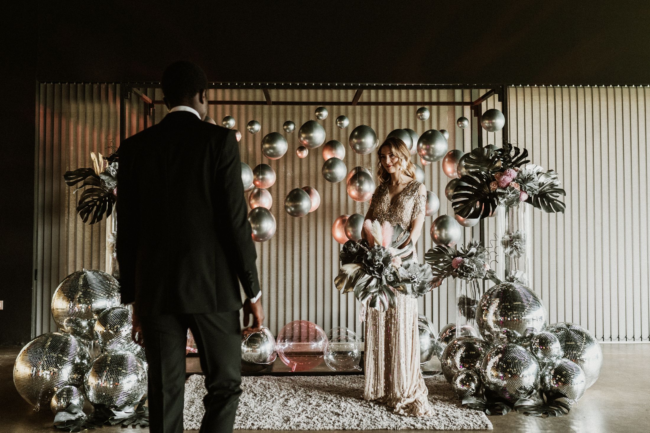 Fantasy wedding shoot inspired by the lights of disco balls, the glitter, the colour pink and the frenetic rhythm of the parties. It is a session with strength, character, full of optical illusions and sensations, transmits joy, elegance and is a tribute to many times and transcendental and relevant aesthetics such as art deco, the time of agitation social and the excesses along with the crazy 70's in which Saturday Night Fever made us dance non-stop. Something new, extraordinary, beautiful, simple, but with the ability to envelop you in a real fantasy.