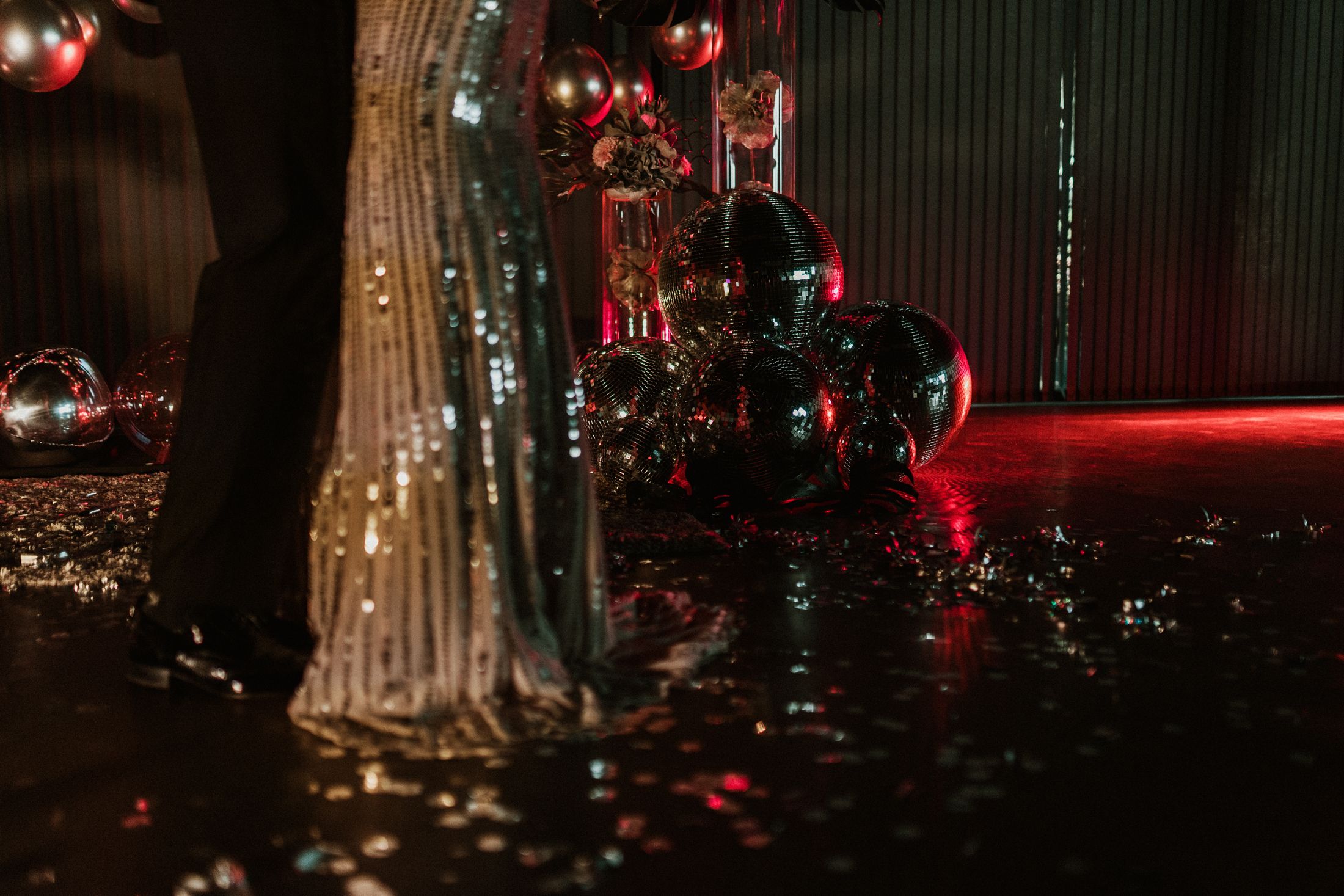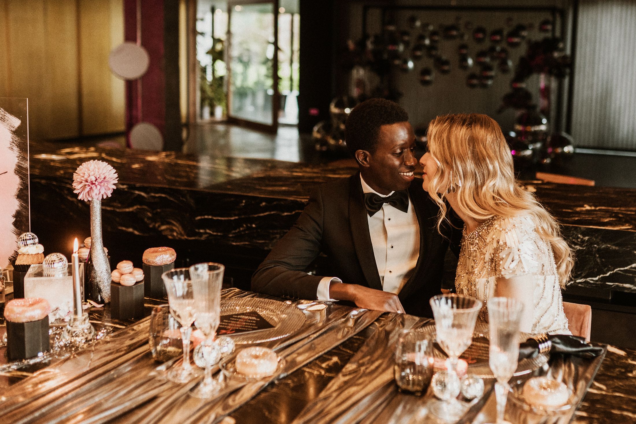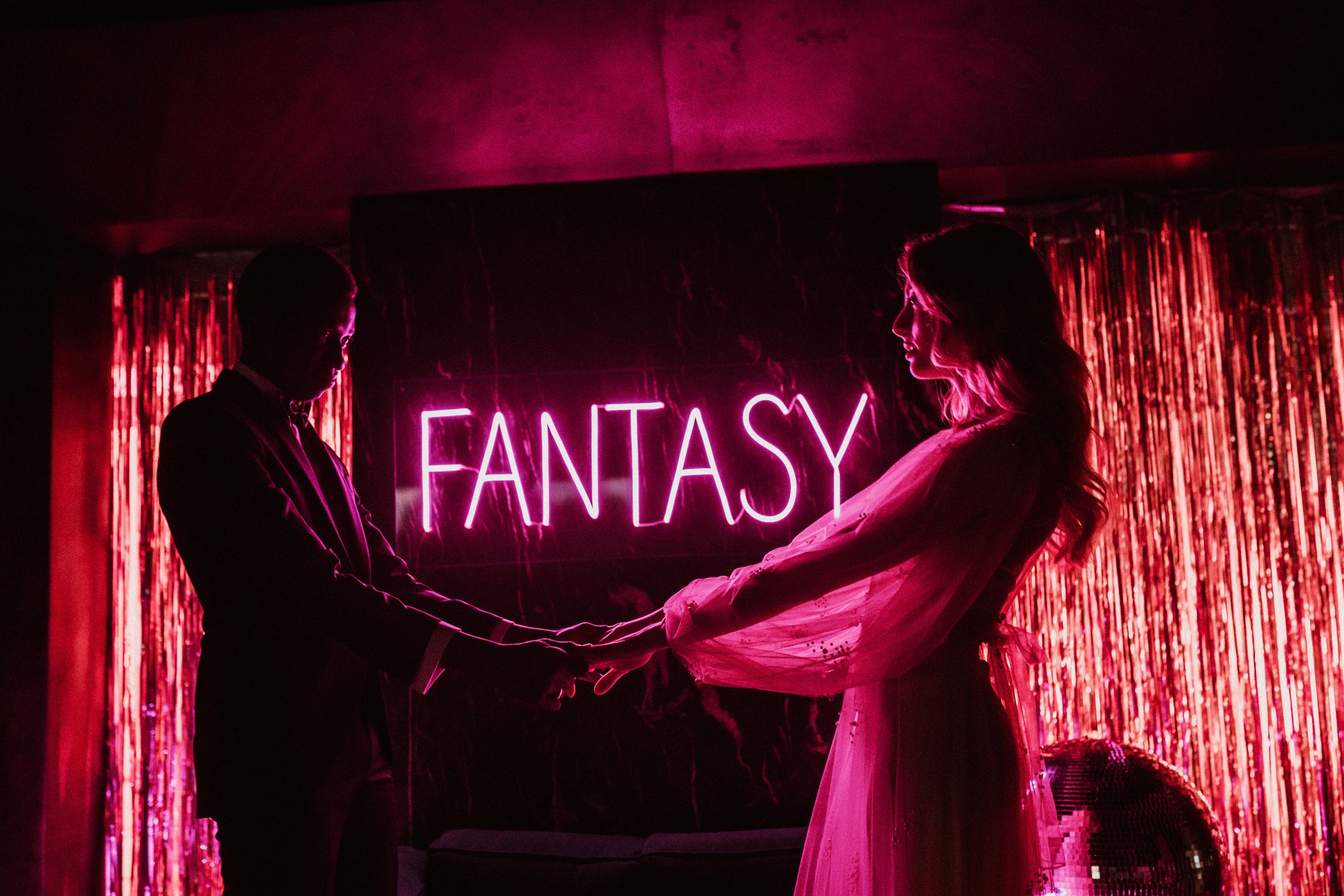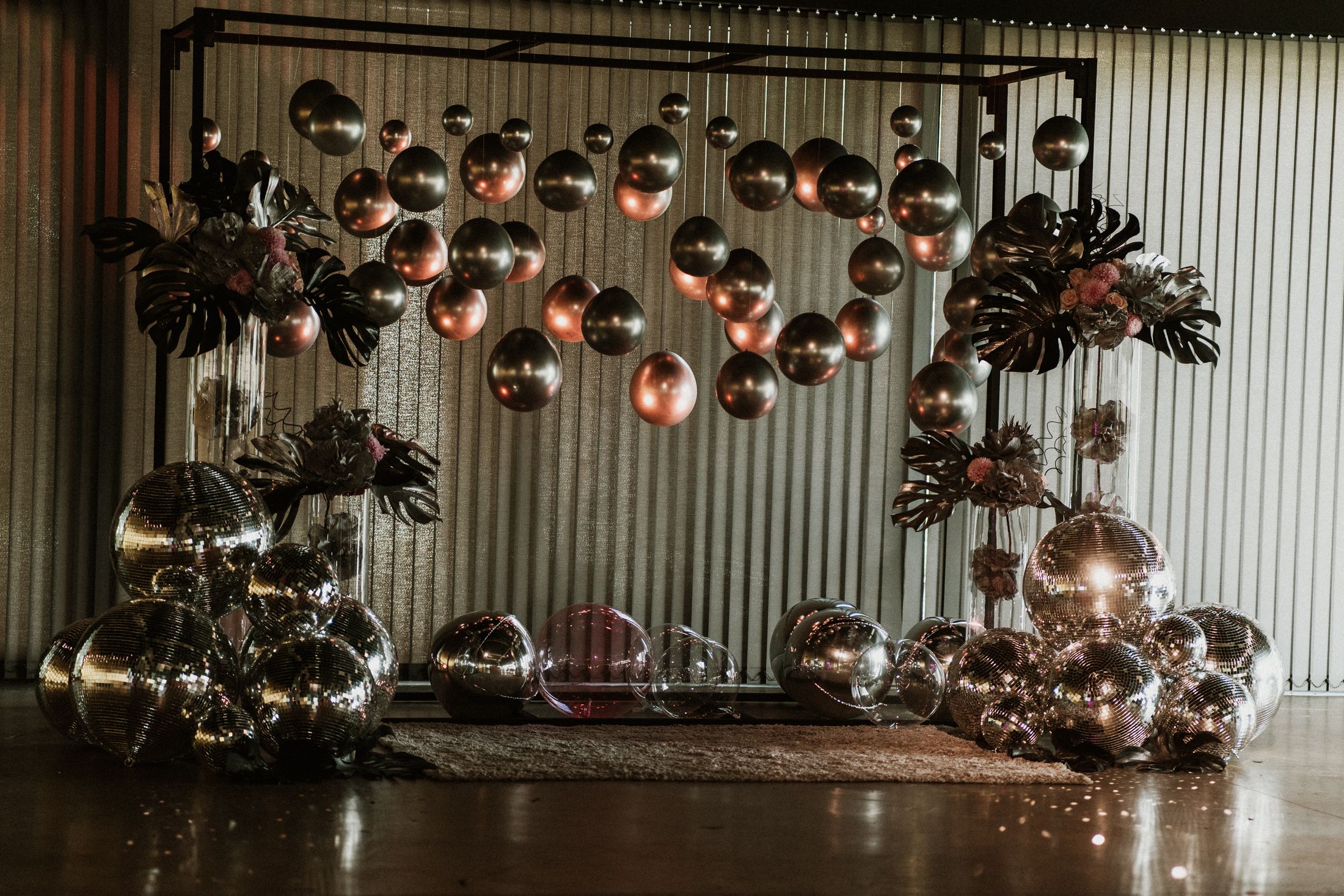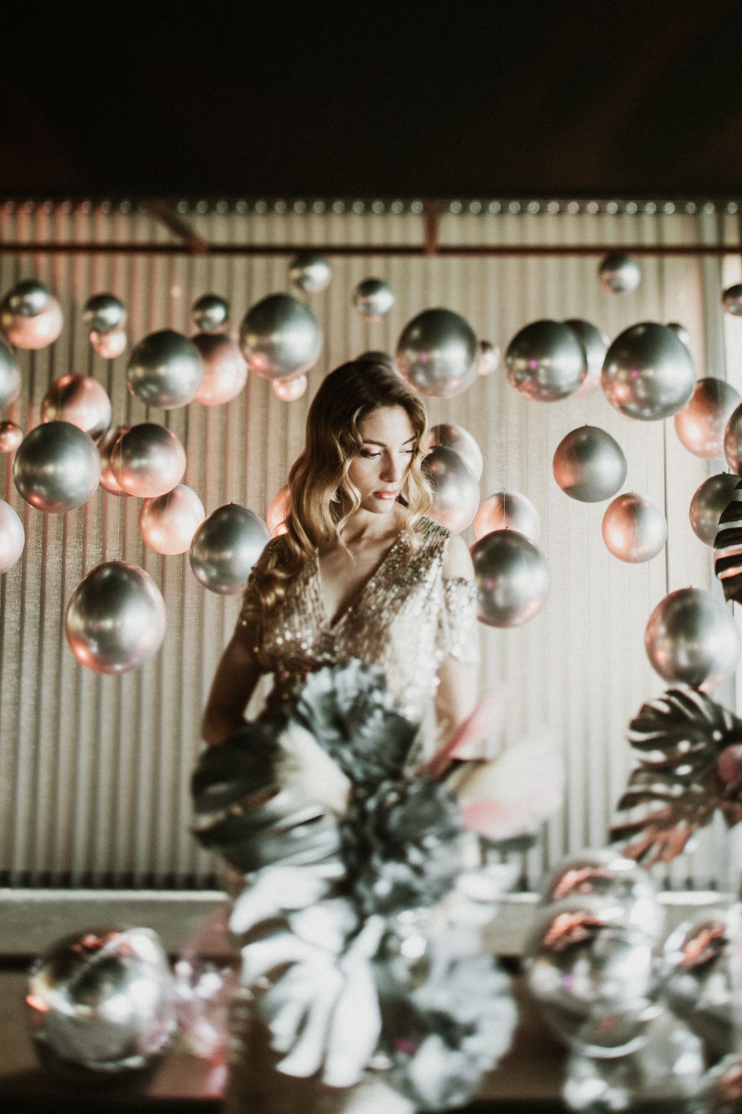Fantasy wedding shoot inspired by the lights of disco balls, the glitter, the colour pink and the frenetic rhythm of the parties. It is a session with strength, character, full of optical illusions and sensations, transmits joy, elegance and is a tribute to many times and transcendental and relevant aesthetics such as art deco, the time of agitation social and the excesses along with the crazy 70's in which Saturday Night Fever made us dance non-stop. Something new, extraordinary, beautiful, simple, but with the ability to envelop you in a real fantasy.