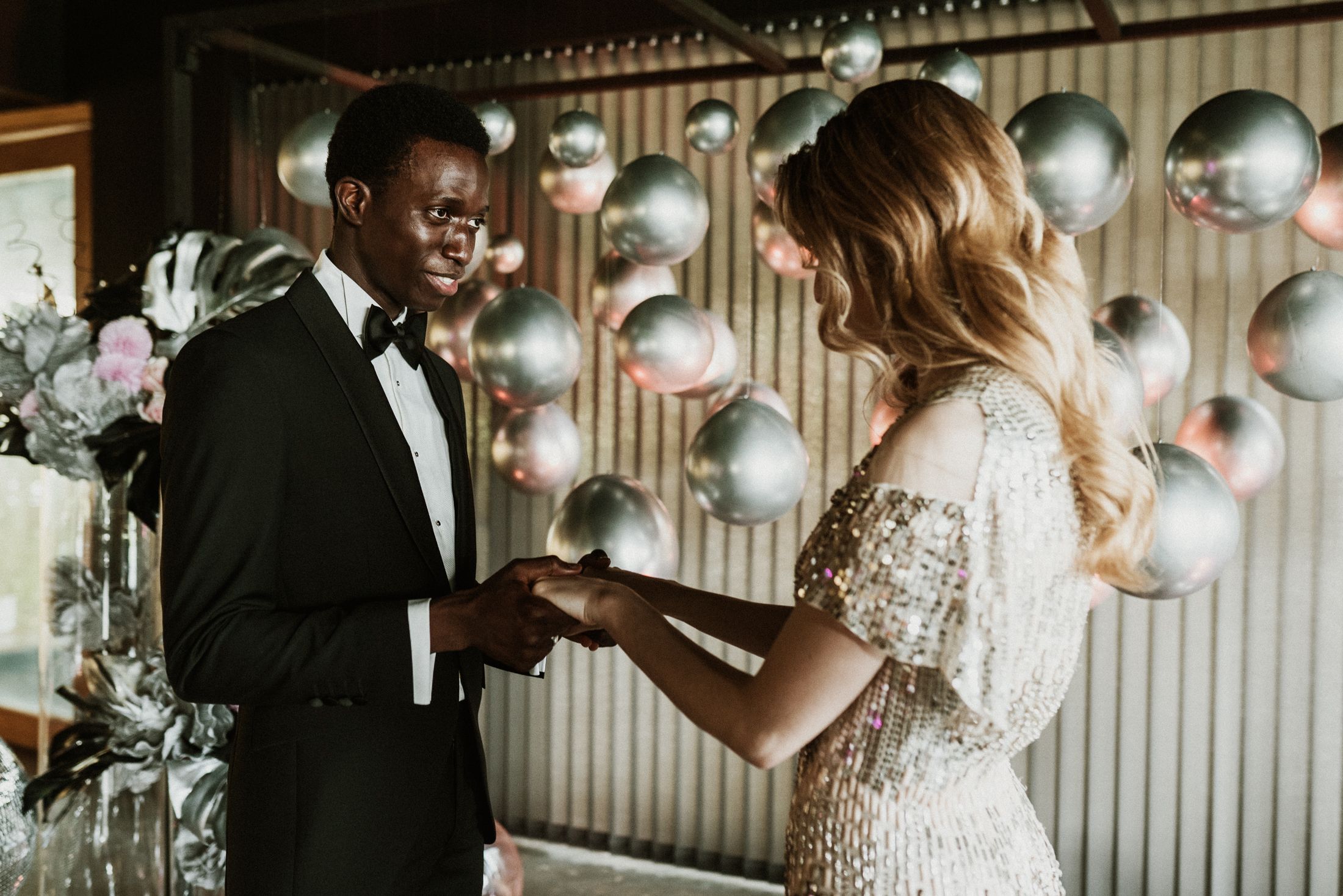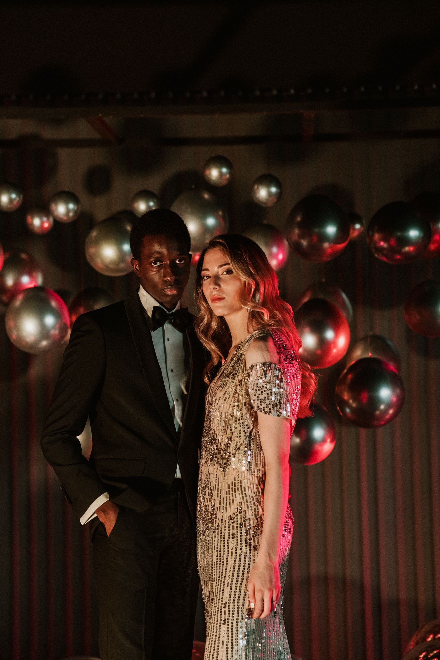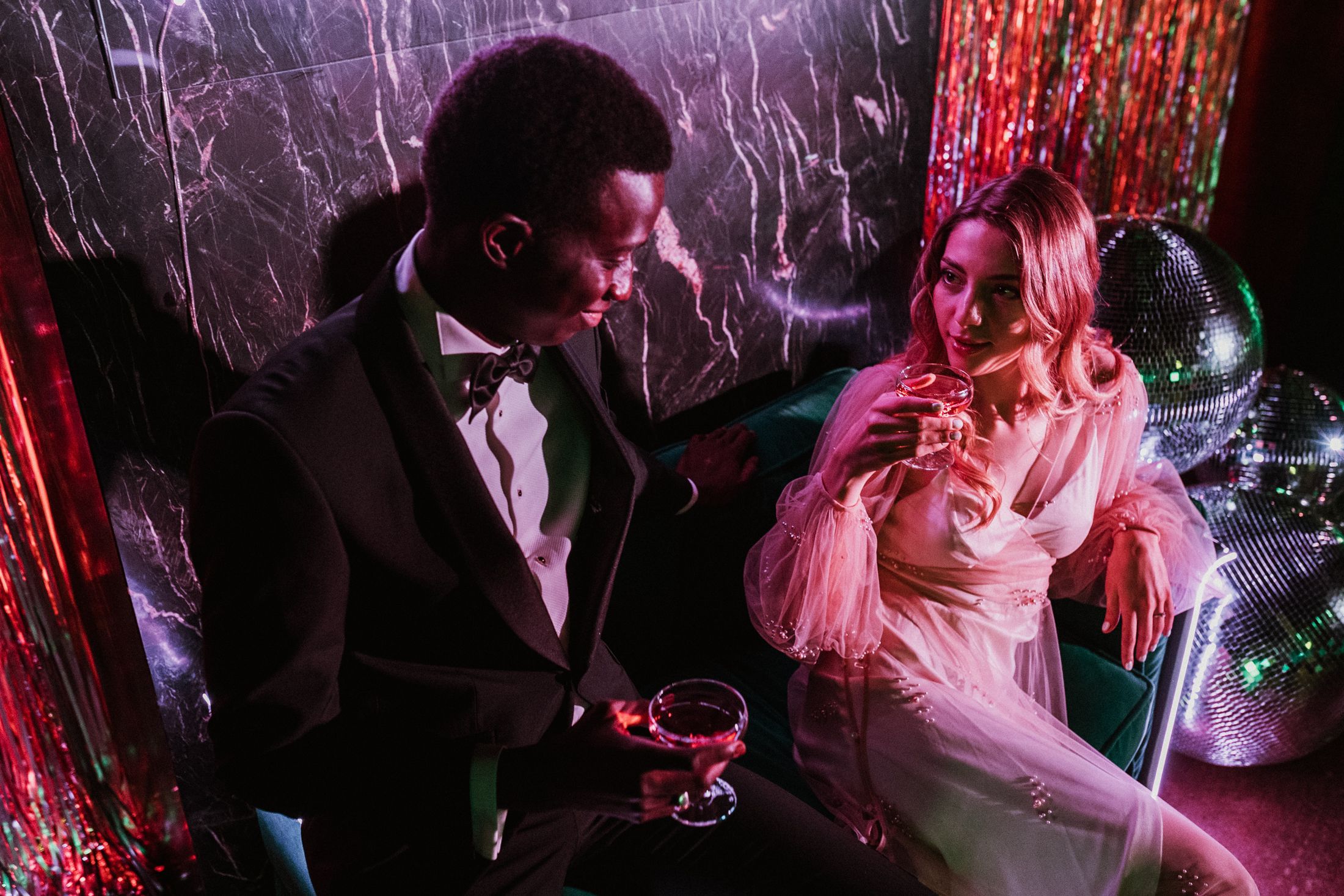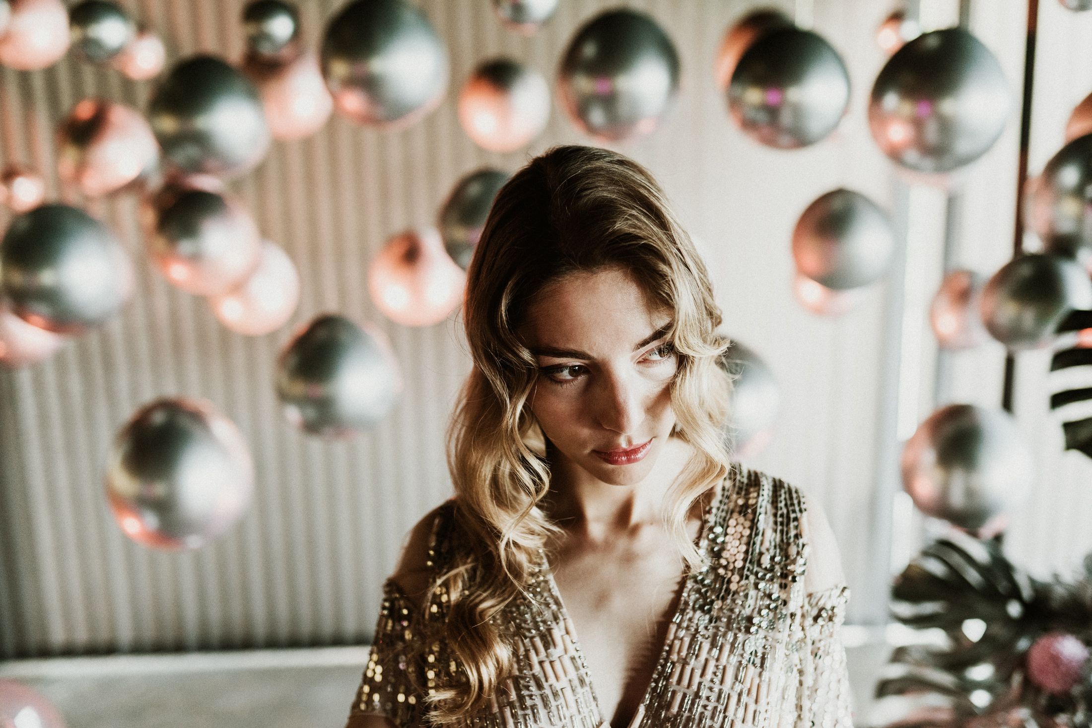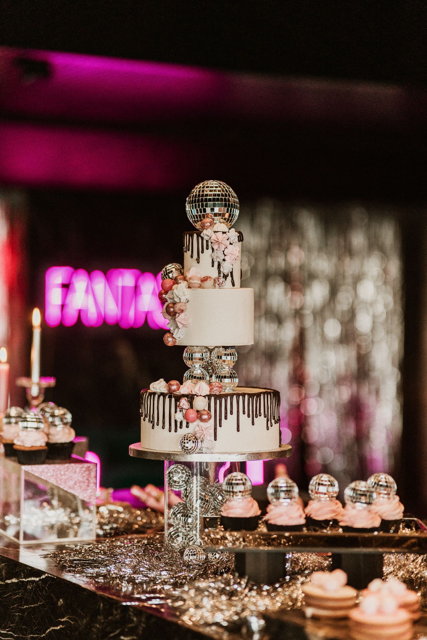 Fantasy wedding shoot inspired by the lights of disco balls, the glitter, the colour pink and the frenetic rhythm of the parties. It is a session with strength, character, full of optical illusions and sensations, transmits joy, elegance and is a tribute to many times and transcendental and relevant aesthetics such as art deco, the time of agitation social and the excesses along with the crazy 70's in which Saturday Night Fever made us dance non-stop. Something new, extraordinary, beautiful, simple, but with the ability to envelop you in a real fantasy.