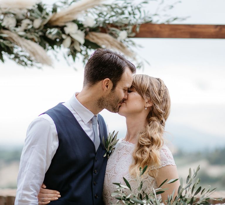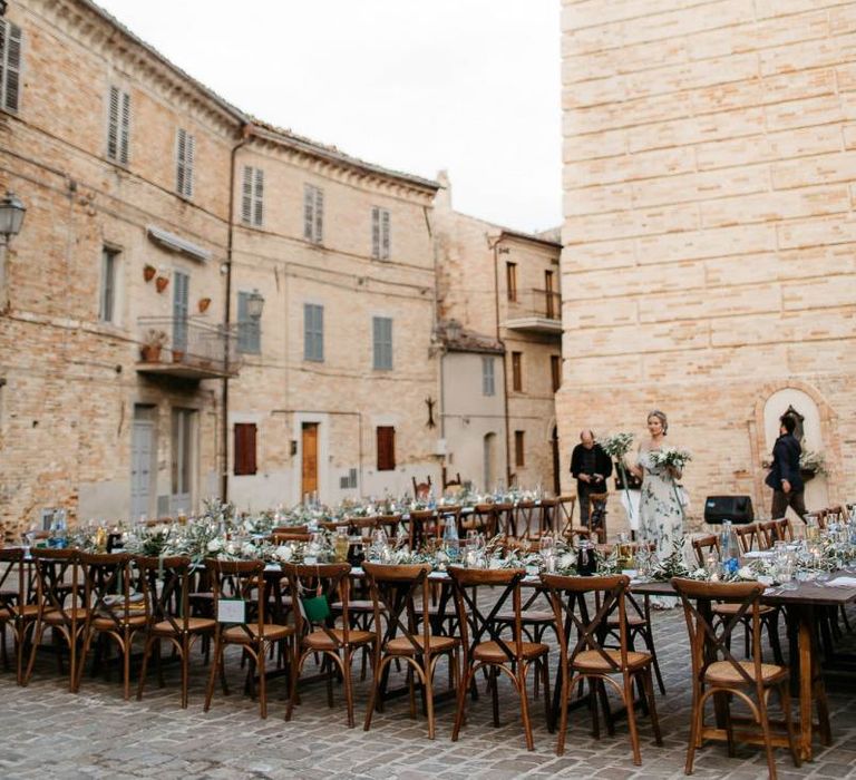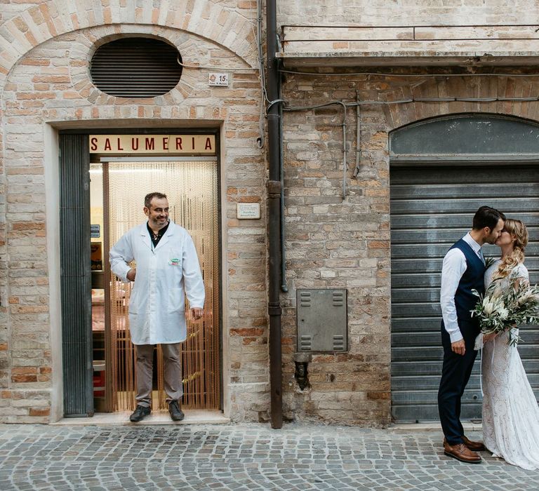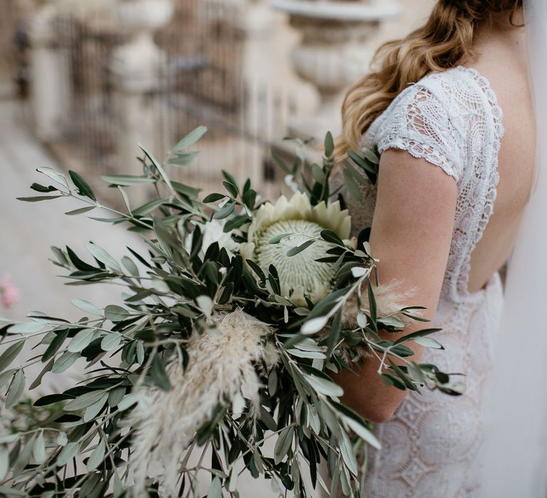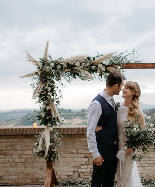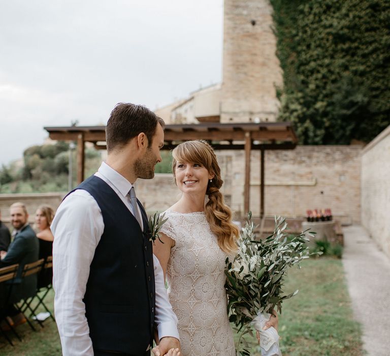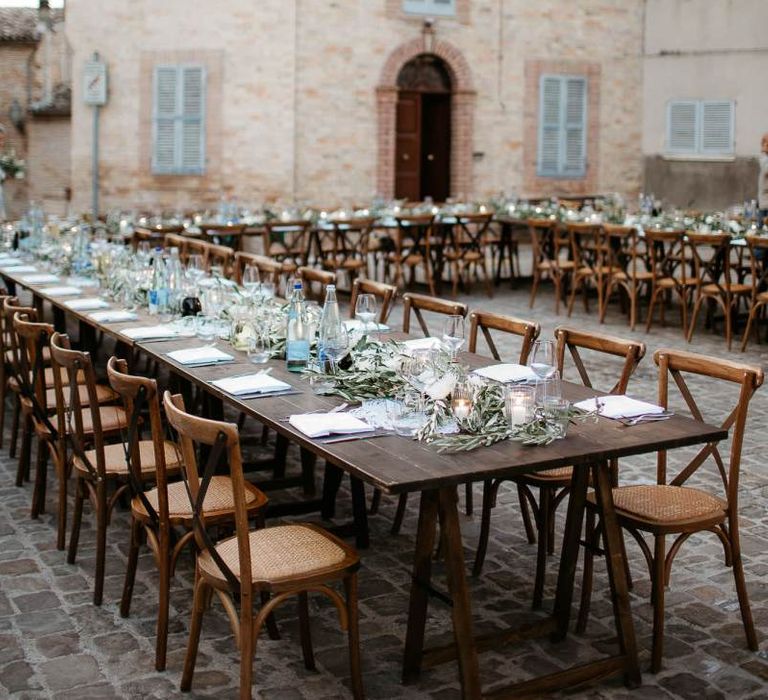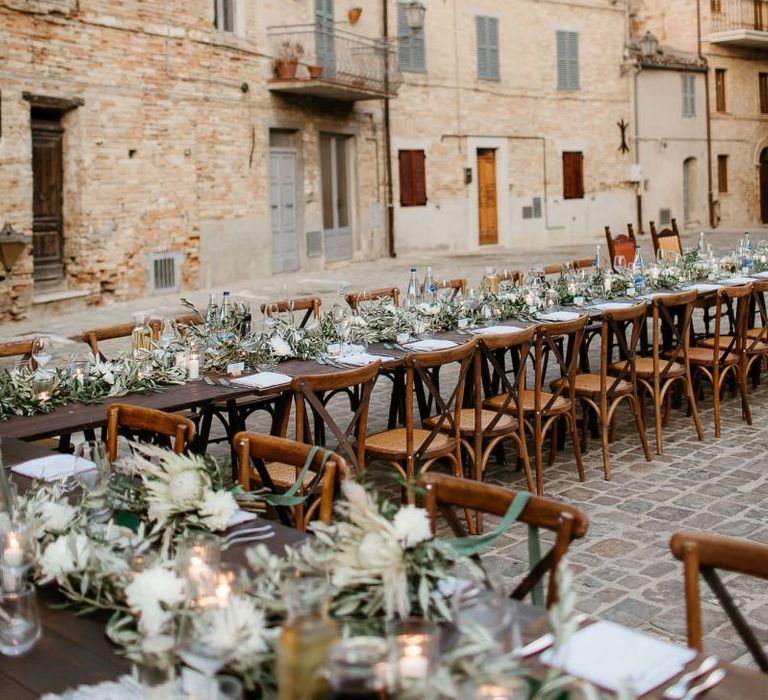 When your are planning from afar, there is only so much you can control, and from our very first chat with Elisa I knew I could trust her completely to execute the vibe and vision I had for the day. I didn't want to have to be bogged down in approving every detail but I knew I wanted to keep things Italian inspired and rustic with natural and wood elements so I sent her and our florist, I Fiori di Ale, some photos of olive branches, candles, and cork and let them take it from there. It was actually really fun to be surprised the day of with their execution and they went above and beyond what I could have imagined. The town was already picturesque enough, and the decor they created just added to the ambiance. Everything from the ceremony arch to my gorgeous bouquet and the table setting which included details like doilies inspired by my lace dress was perfectly simple yet stunning.