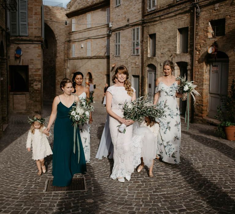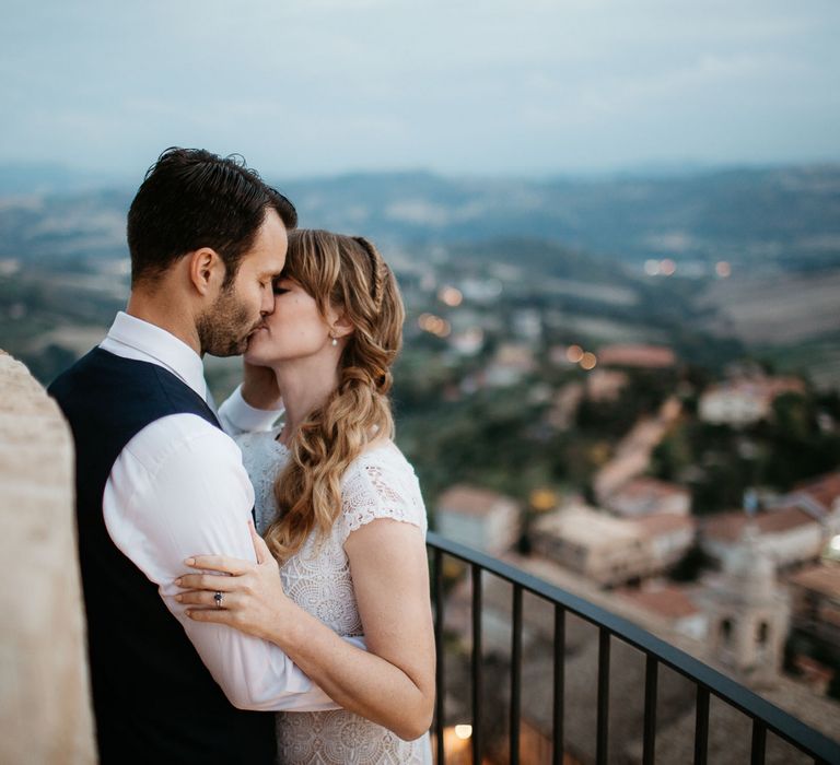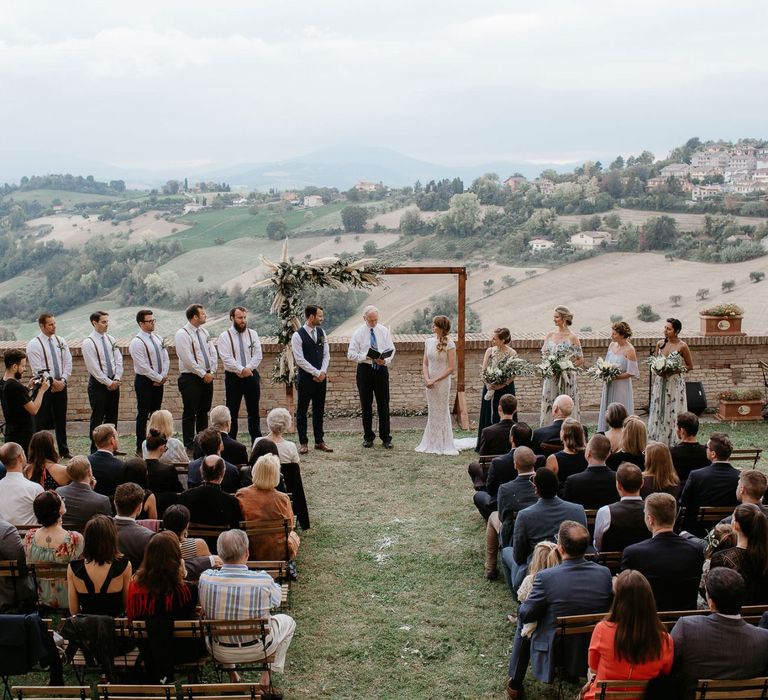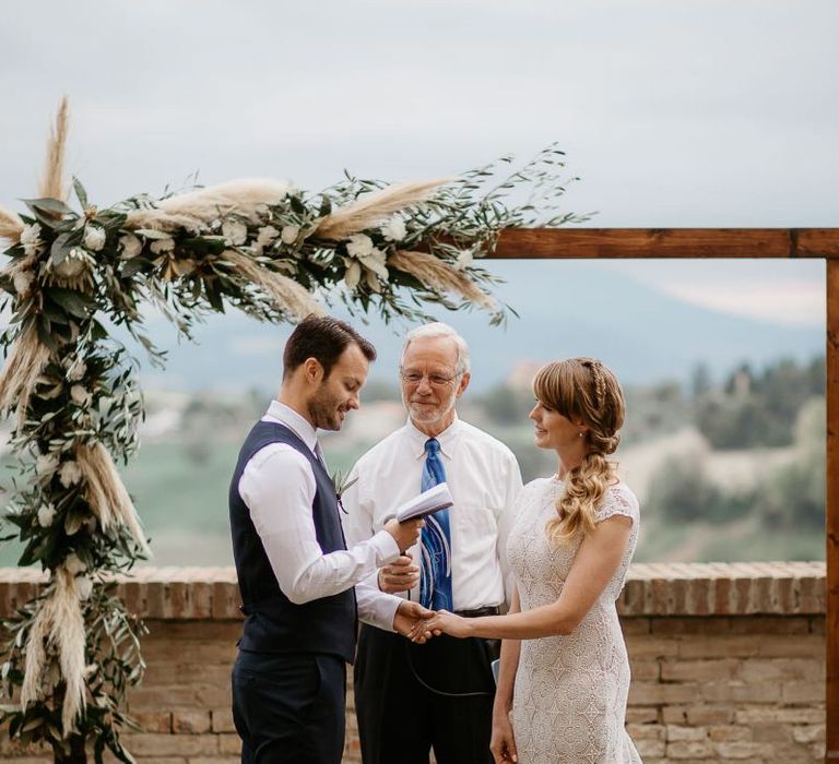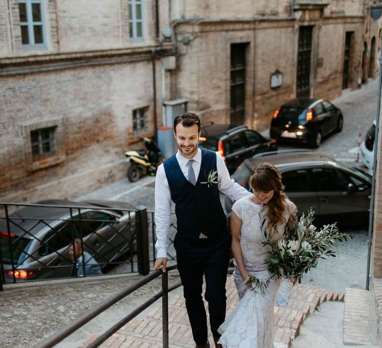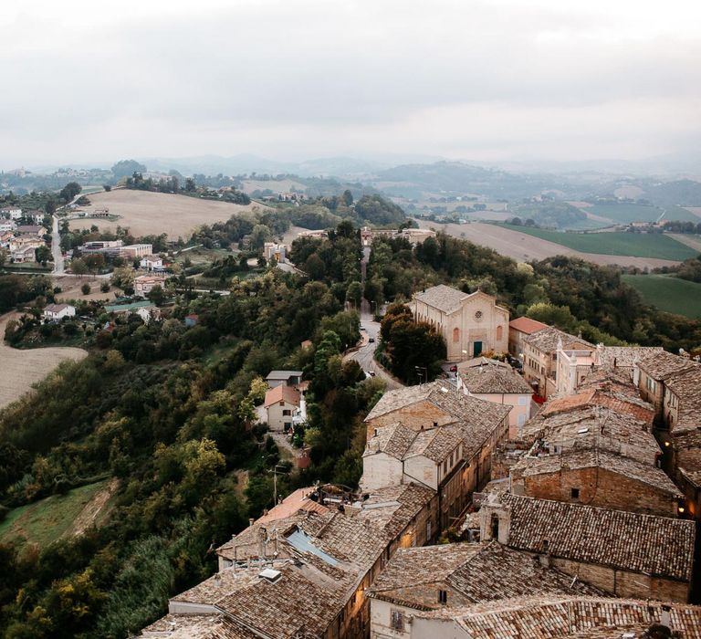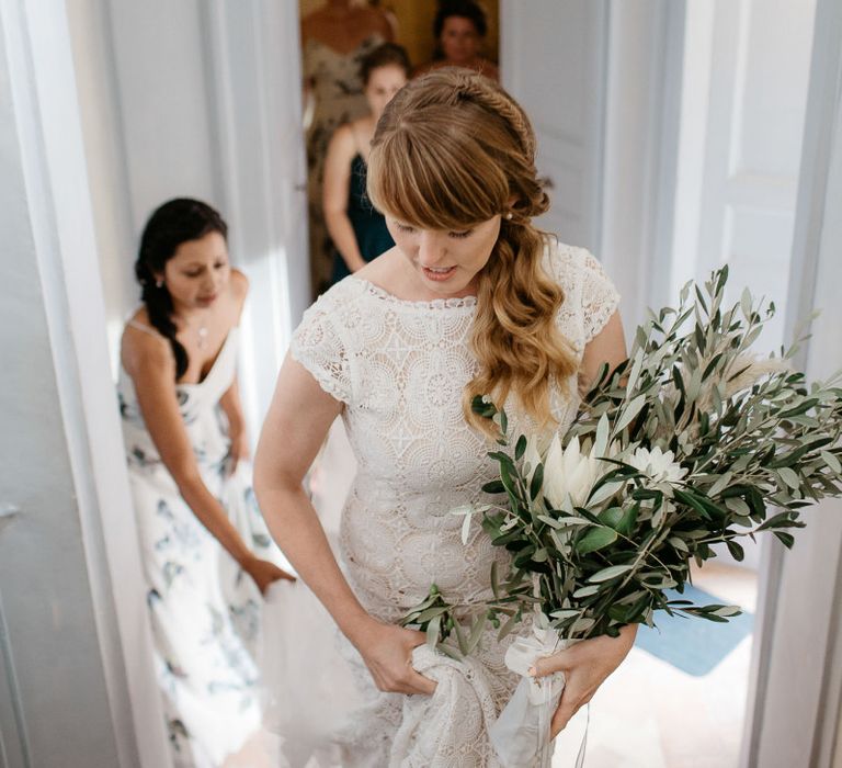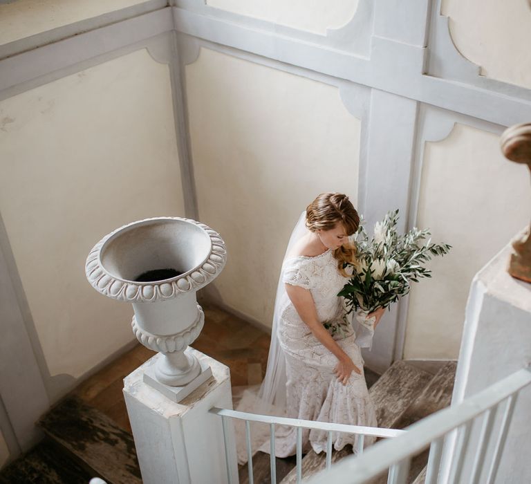 When your are planning from afar, there is only so much you can control, and from our very first chat with Elisa I knew I could trust her completely to execute the vibe and vision I had for the day. I didn't want to have to be bogged down in approving every detail but I knew I wanted to keep things Italian inspired and rustic with natural and wood elements so I sent her and our florist, I Fiori di Ale, some photos of olive branches, candles, and cork and let them take it from there. It was actually really fun to be surprised the day of with their execution and they went above and beyond what I could have imagined. The town was already picturesque enough, and the decor they created just added to the ambiance. Everything from the ceremony arch to my gorgeous bouquet and the table setting which included details like doilies inspired by my lace dress was perfectly simple yet stunning.