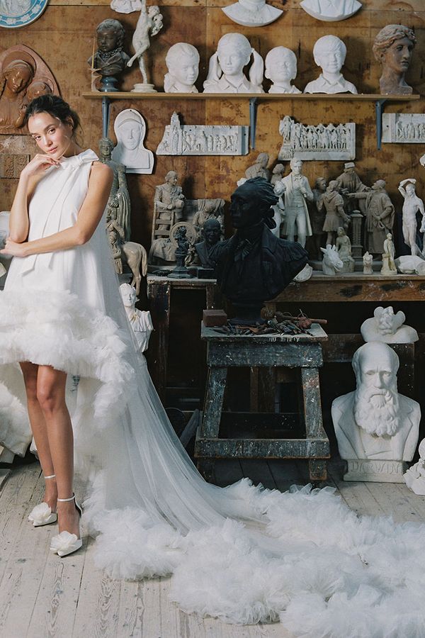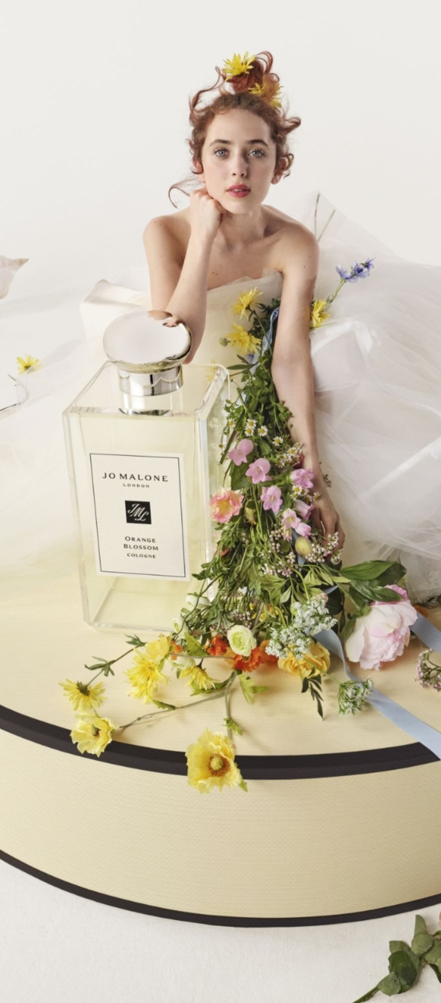 Bride in a white wedding dress sitting beside an oversized Jo Malone Orange Blossom Cologne bottle, surrounded by colourful flowers and a white duck in the background – whimsical bridal fragrance campaign setting - Best Wedding Perfumes