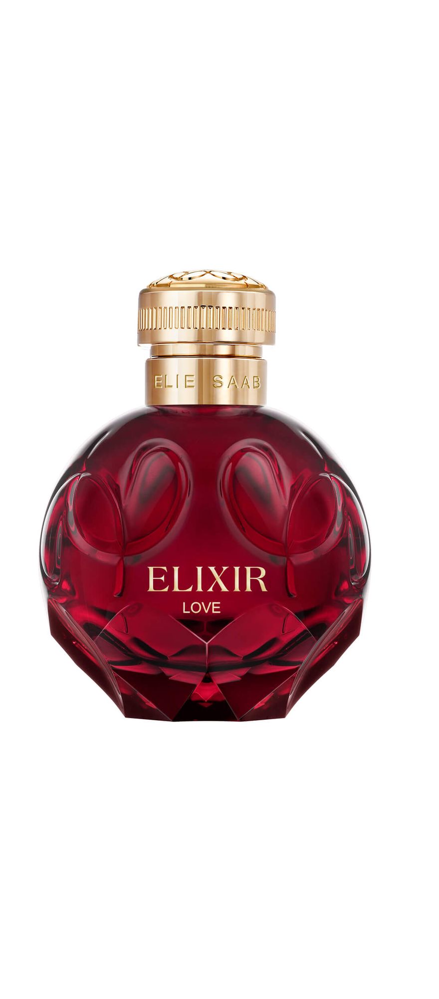 Elie Saab Elixir Love perfume bottle in deep ruby red with gold cap – a luxury wedding perfume and romantic bridal fragrance