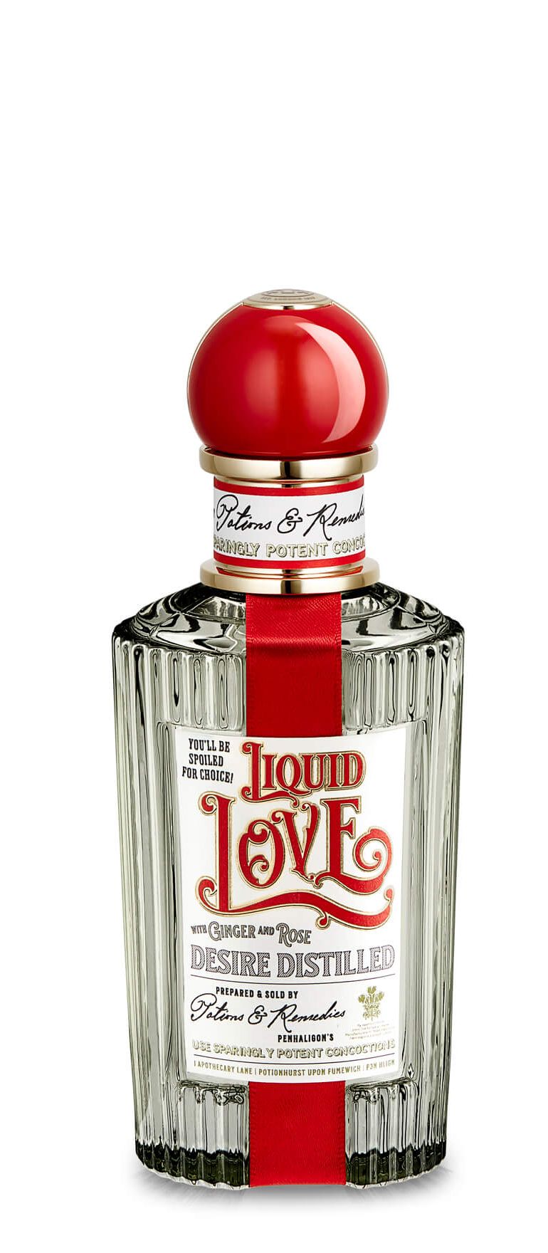 Penhaligon’s Liquid Love Eau de Parfum – a vintage apothecary-style glass perfume bottle with a bold red cap and ribbon, featuring ornate lettering and the label 'Liquid Love' on the front