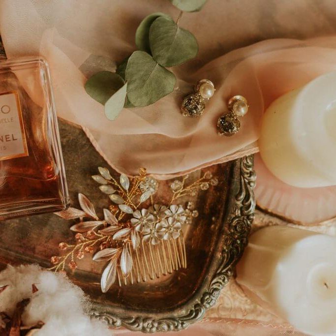 Chanel Coco Mademoiselle Eau de Parfum bottle styled with bridal accessories, including earrings, hair comb, candles, and eucalyptus leaves for a wedding flat lay - Wedding Perfume