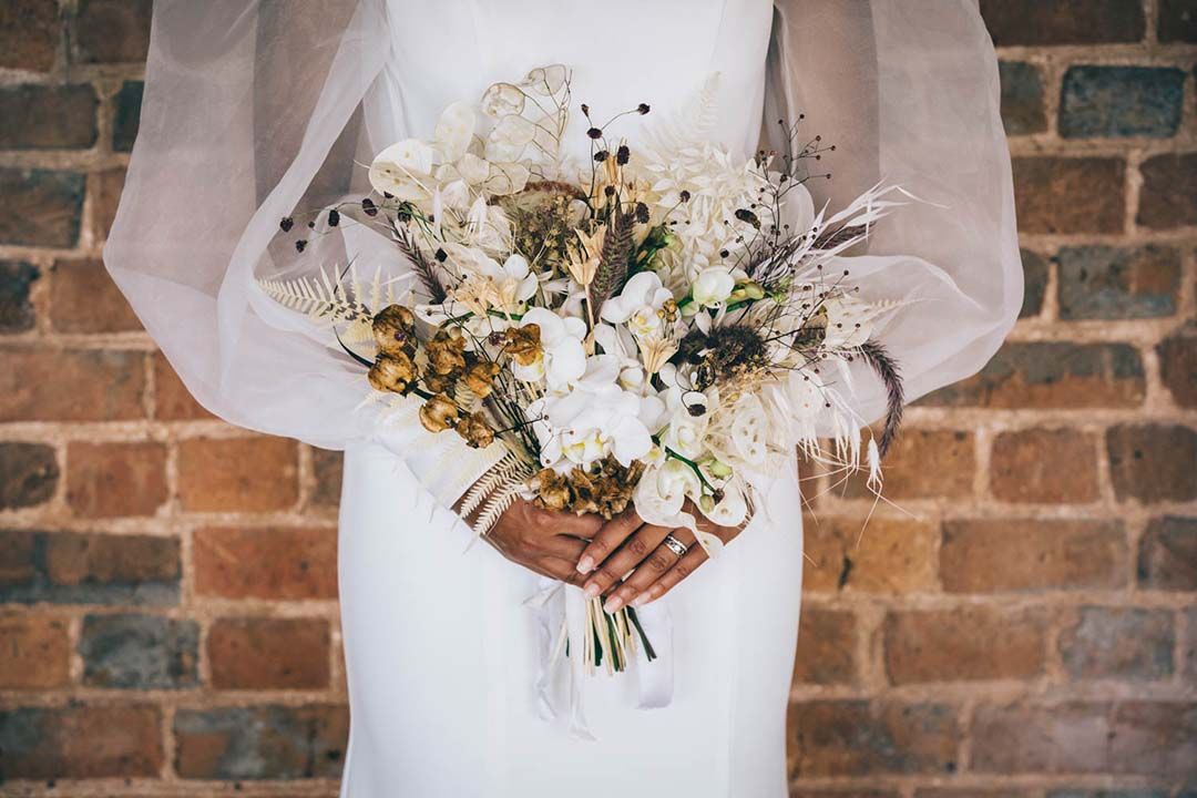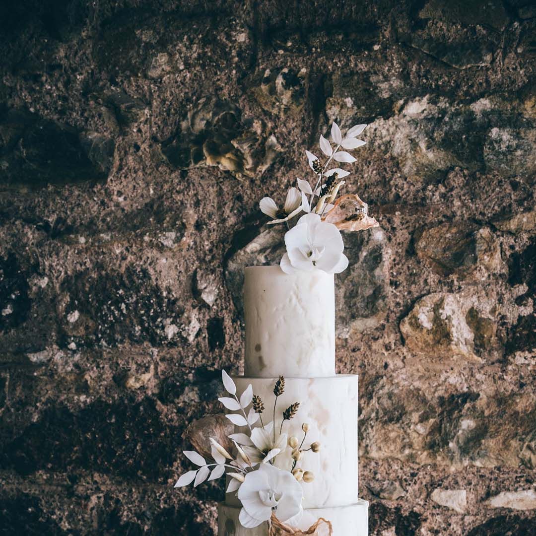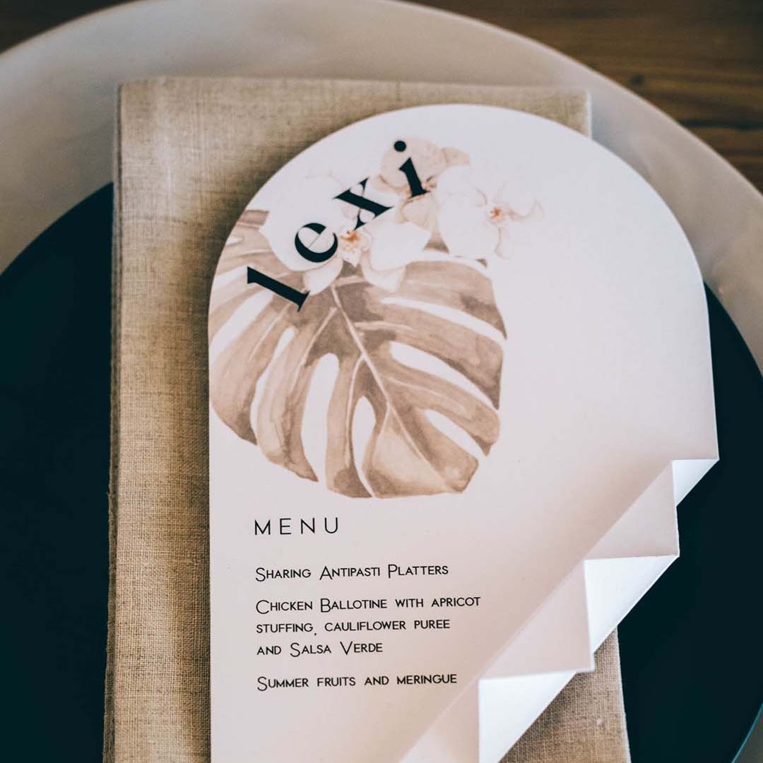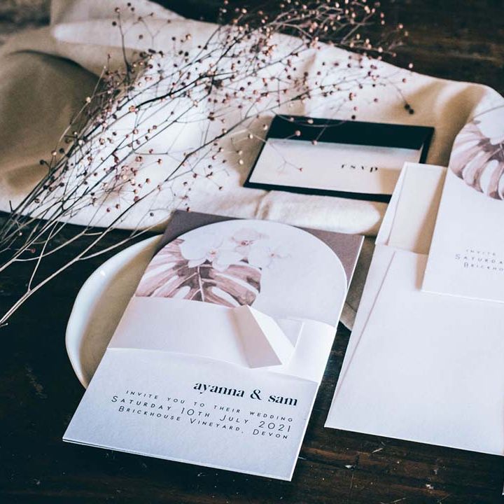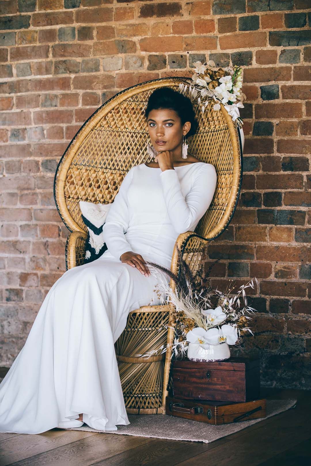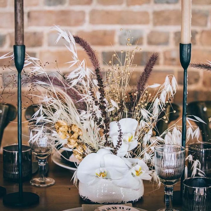 Orchids, luxury origami-inspired stationery, an intricate cake design and streamlined silhouettes paired with rattan and dried flowers completed the boho black tie inspiration.