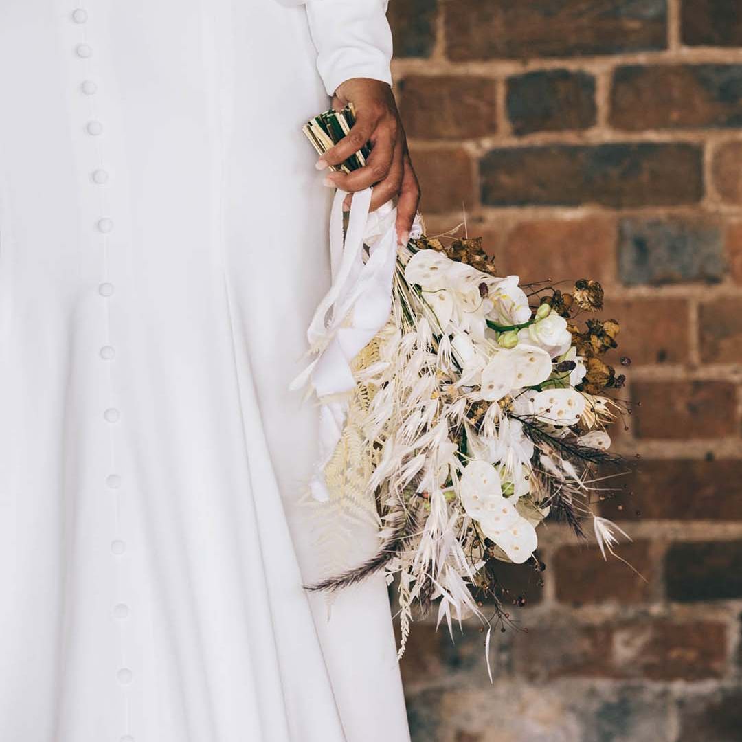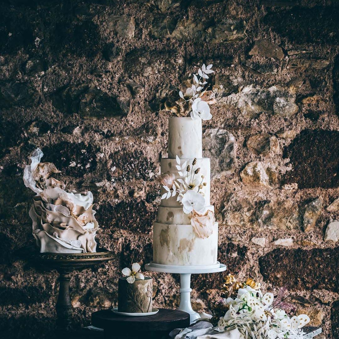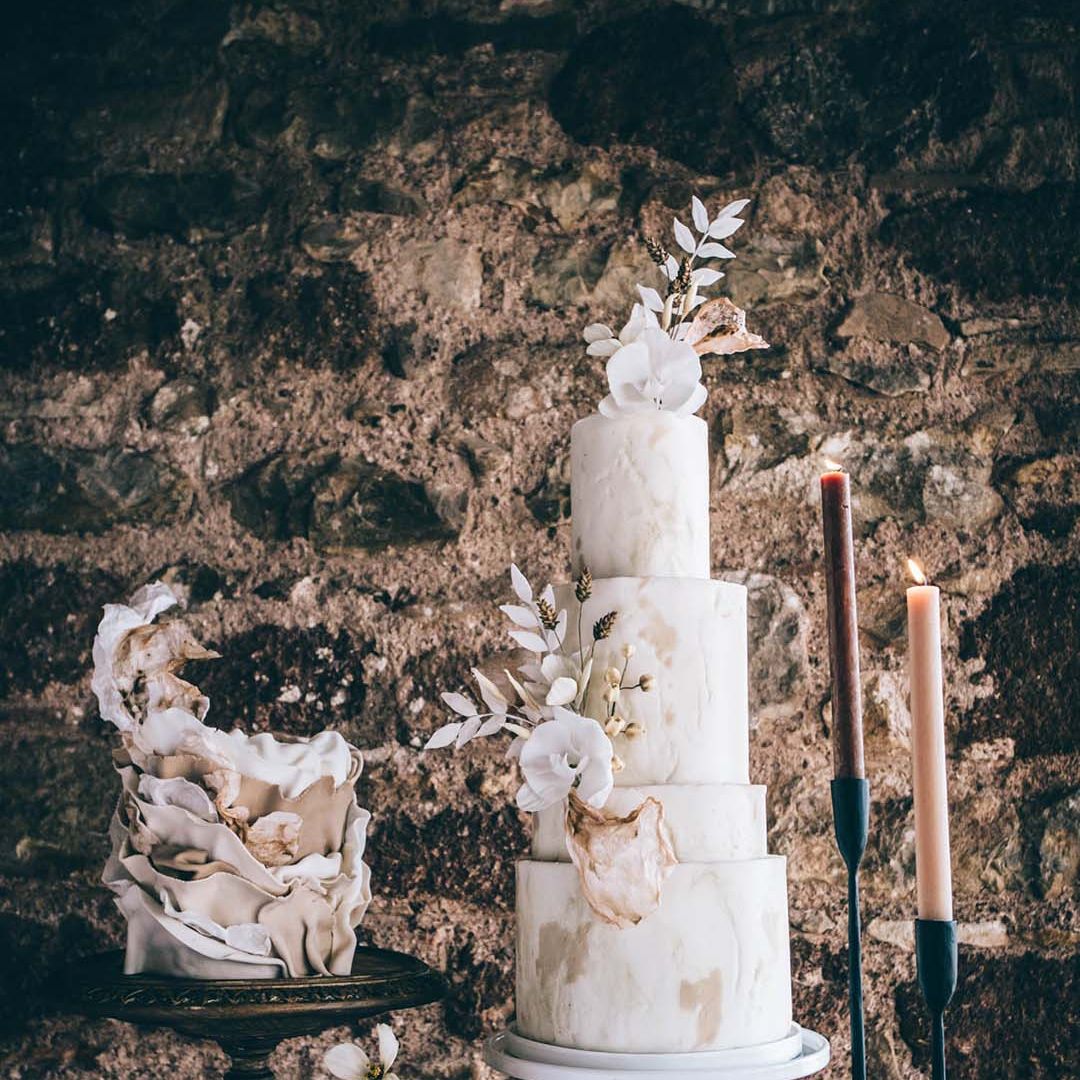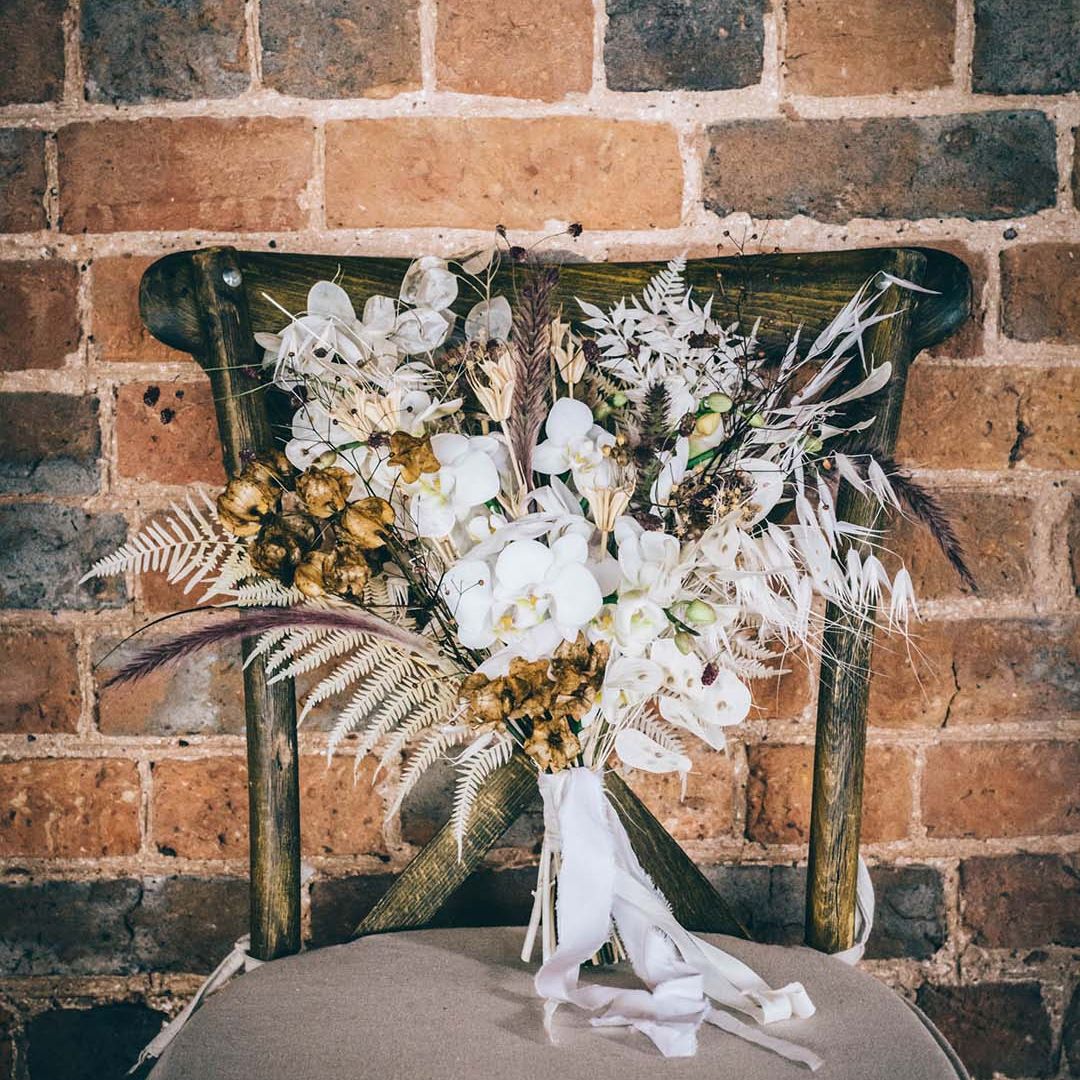 Orchids, luxury origami-inspired stationery, an intricate cake design and streamlined silhouettes paired with rattan and dried flowers completed the boho black tie inspiration.