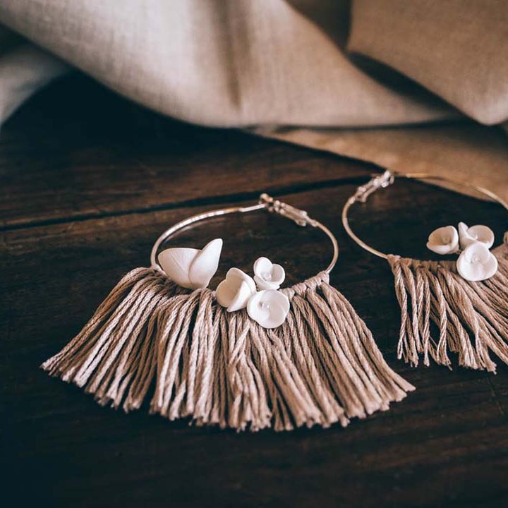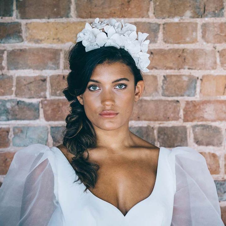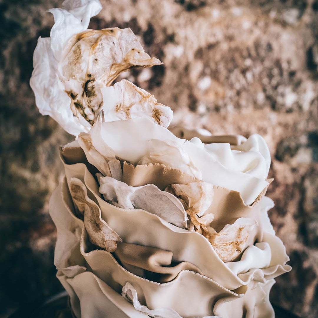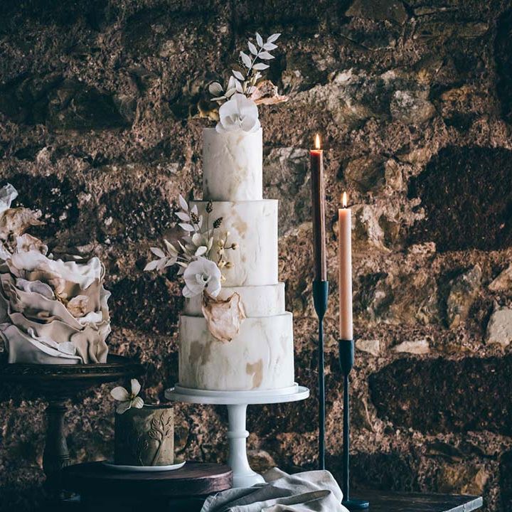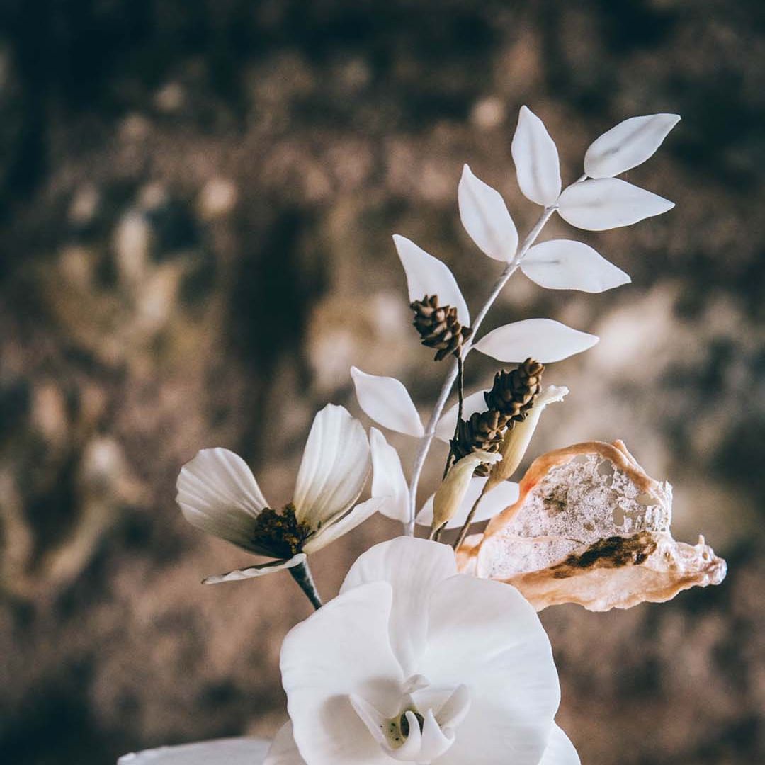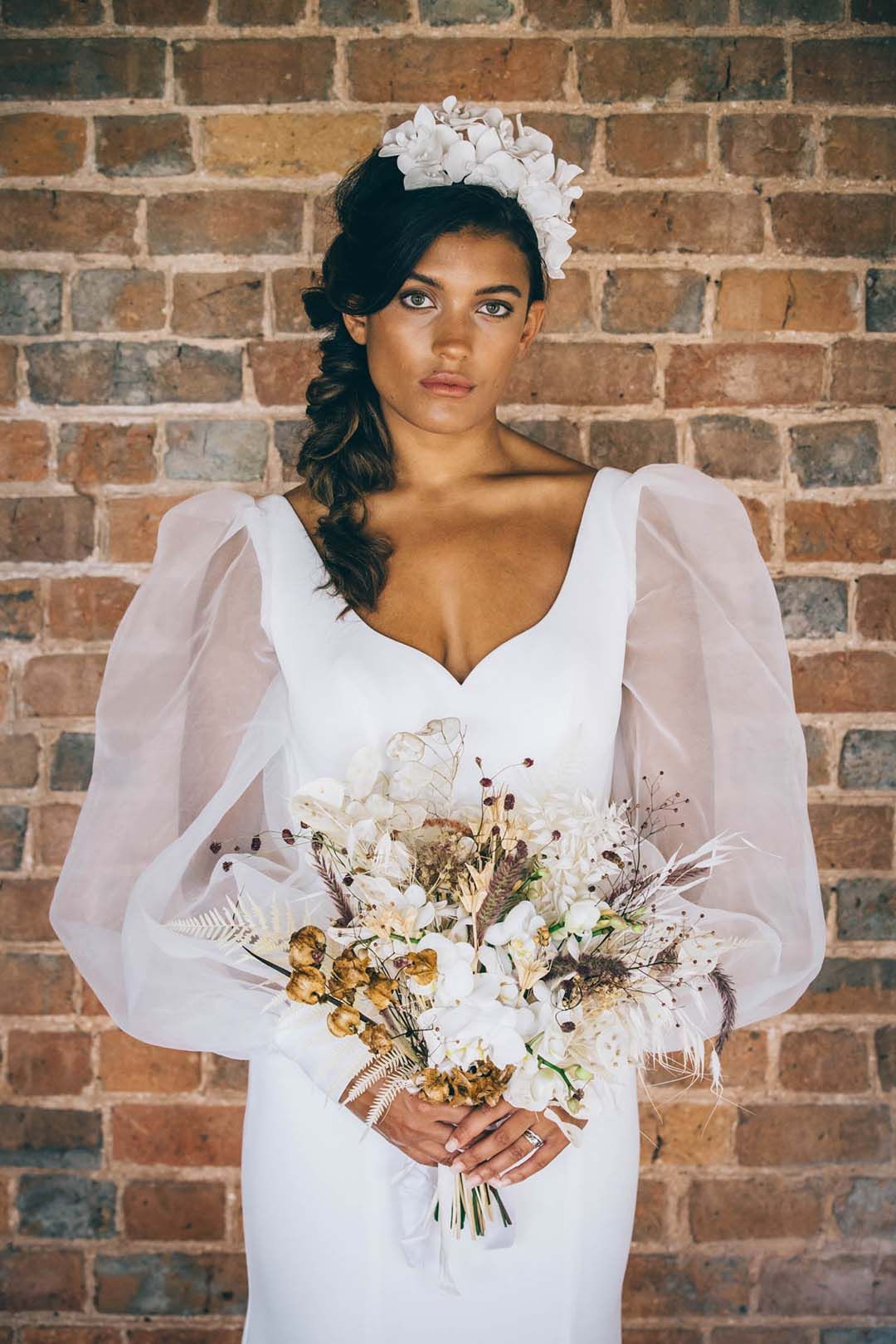 Orchids, luxury origami-inspired stationery, an intricate cake design and streamlined silhouettes paired with rattan and dried flowers completed the boho black tie inspiration.