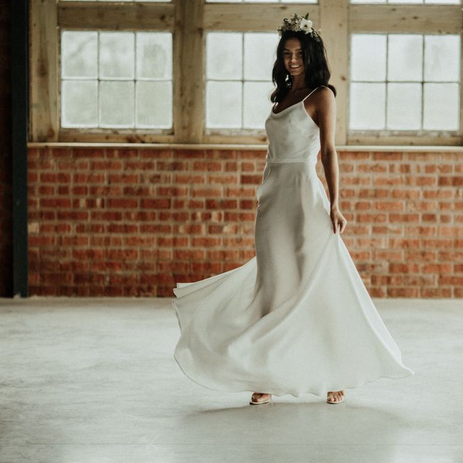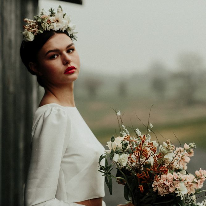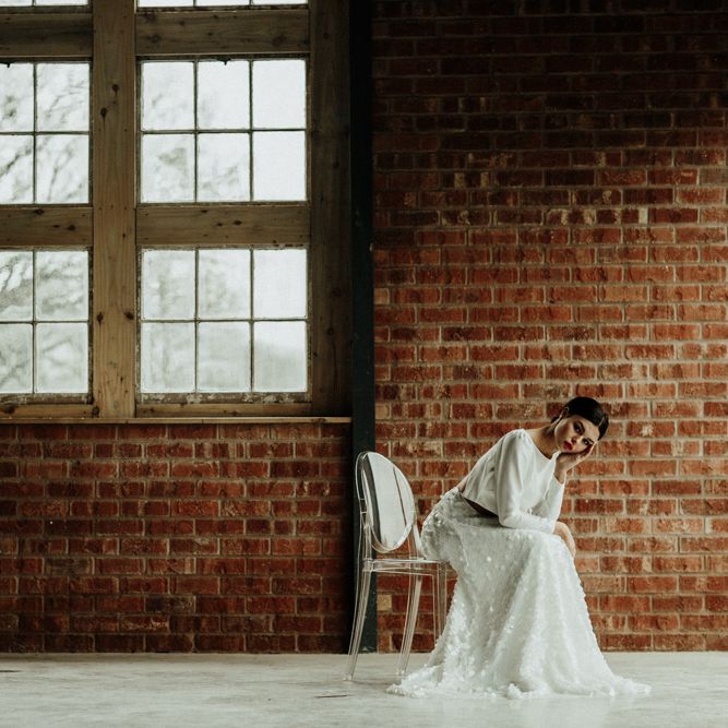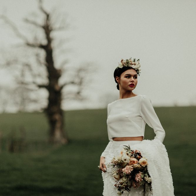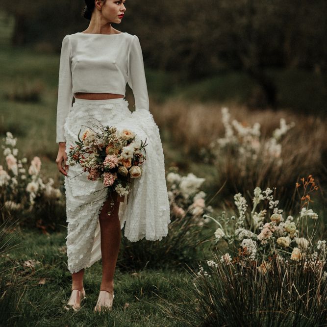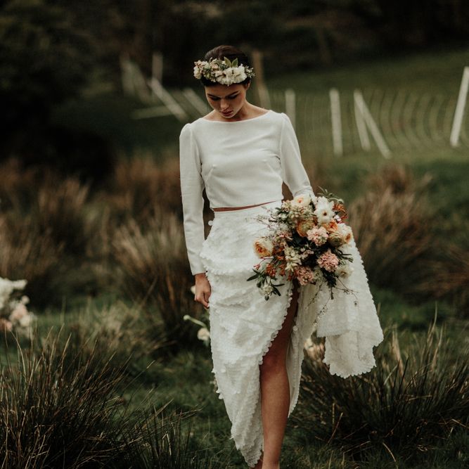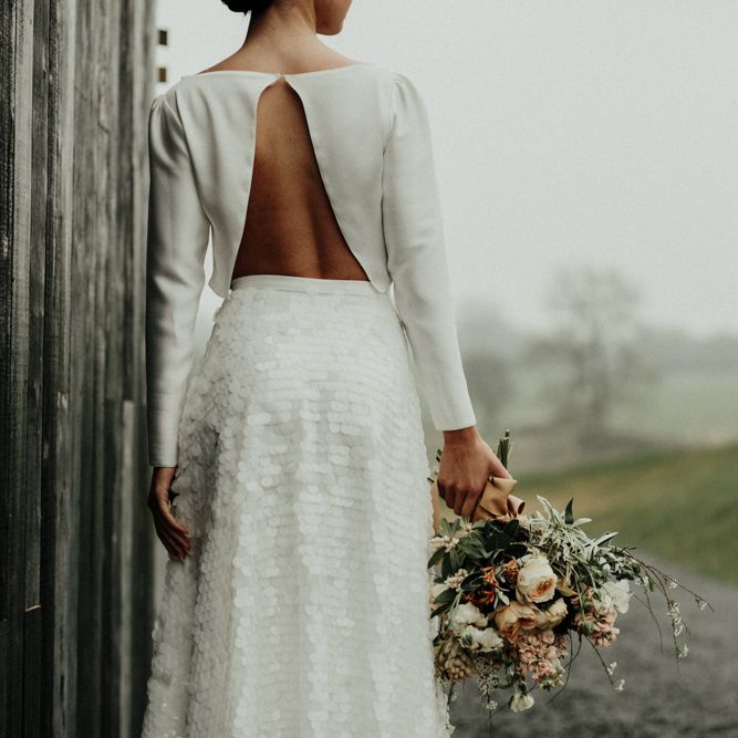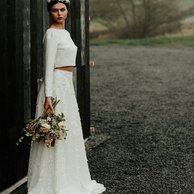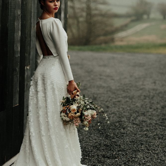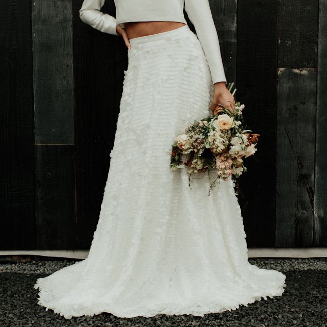 We're appealing to your inner goddess today with a fabulous sequin skirt and bridal crop top with open back. Because we think everyone deserves to feel sexy on their wedding day. Both stylish, and elegant, and finished perfectly with a muted coloured bouquet and flower crown.FASHION & BEAUTY