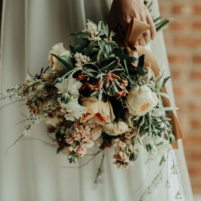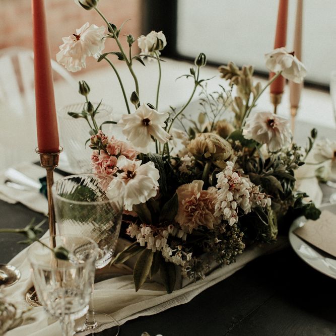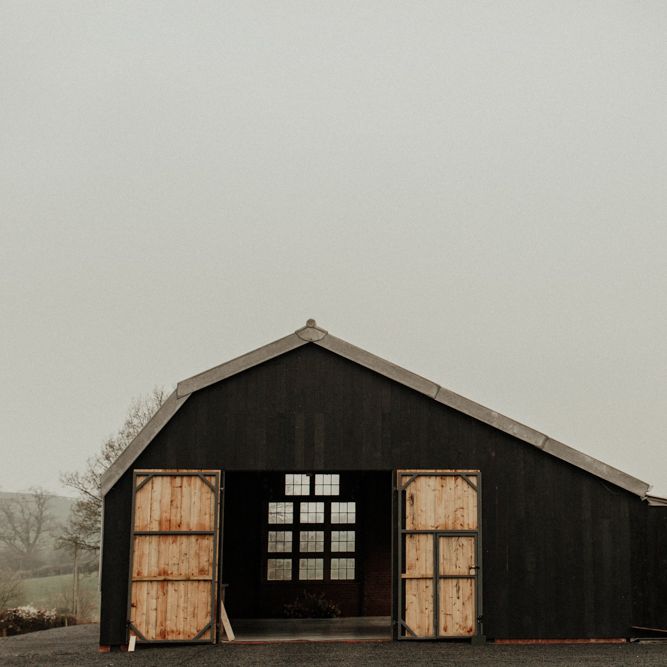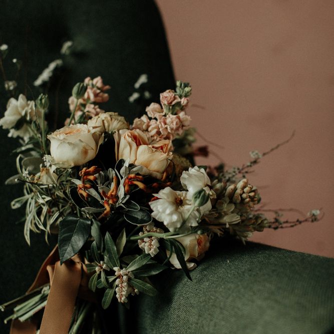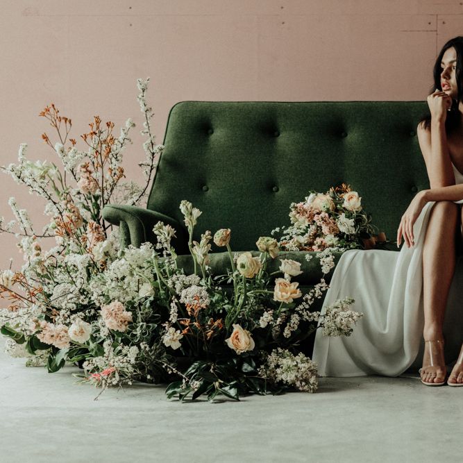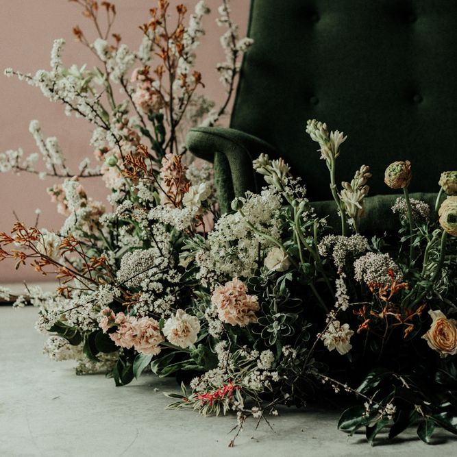 "The Giraffe Shed is a new-ish industrial barn venue nestled amongst the Welsh hills. The barn is rustic yet modern with a polished concrete floor and black cladding exterior. The idea of the shoot was to use muted earthy hues to compliment the barn and the surrounding countryside. But not going down an especially modern or rustic route, but (hopefully) and a more elegant one. The shoot was in April, not a beautiful spring day but a moody atmospheric one. The florals provided the main colour for the shoot, with rust, apricot, cream and nude tones. There is a focus on seasonal spring blooms with iridescent butterfly ranunculus, japonica, caramel antique roses, spirea and foraged blossoms. The florals were quite relaxed, with installation around the green tweed sofa, which we then moved outside and placed amongst the reeds." - Rebecca Eyre