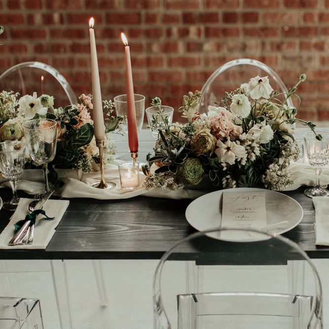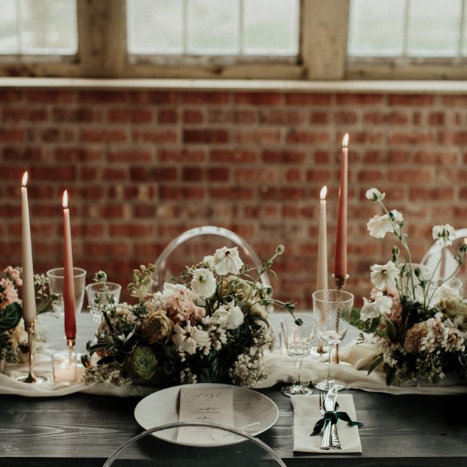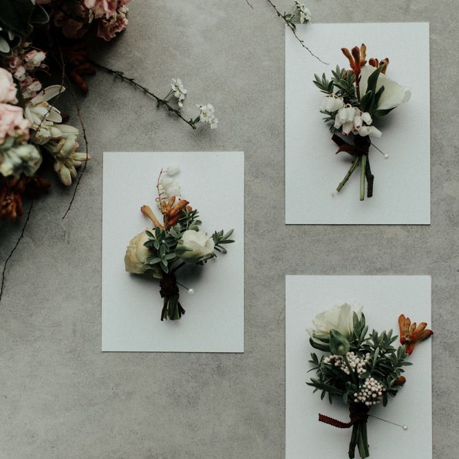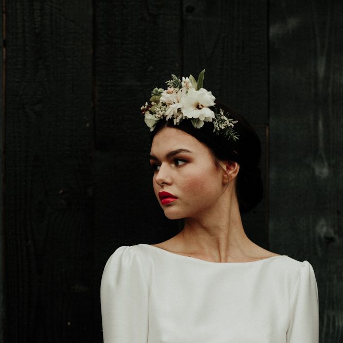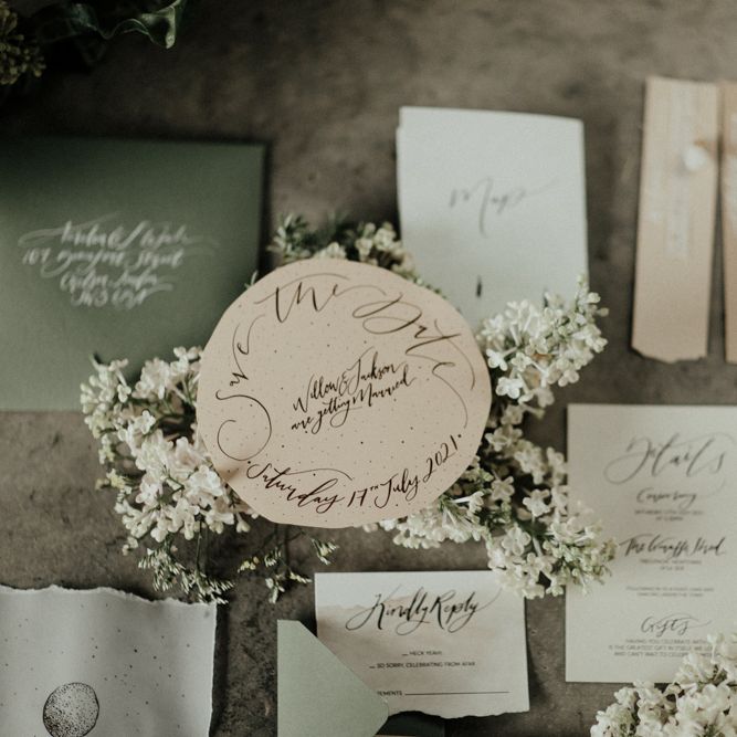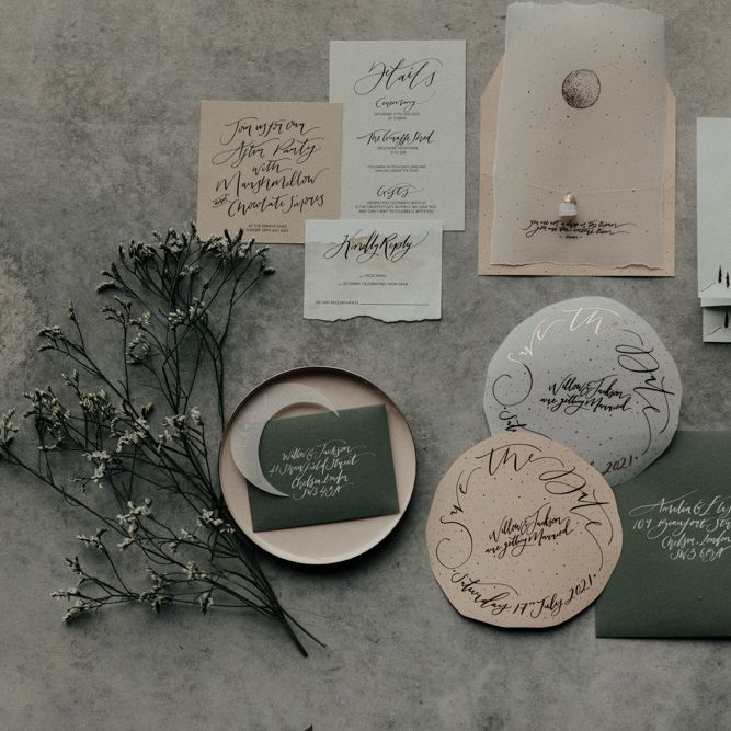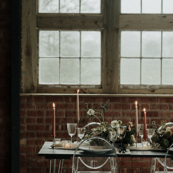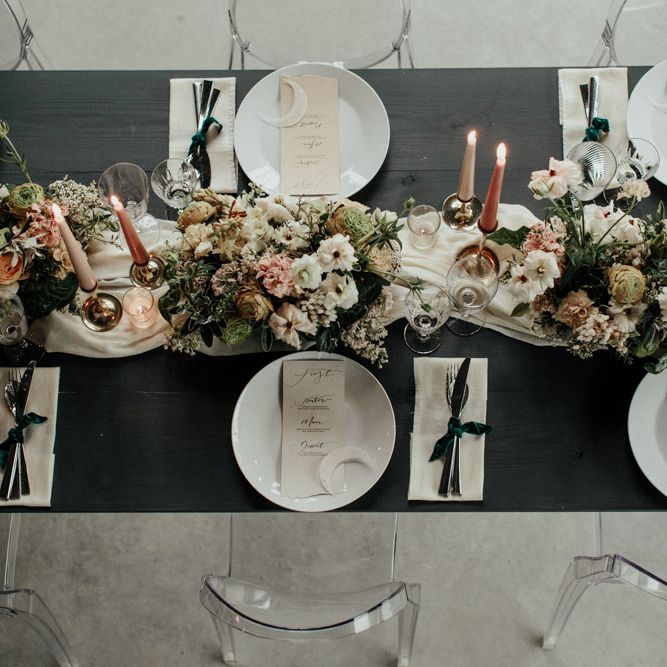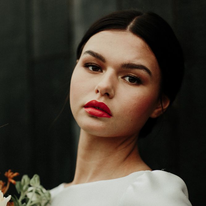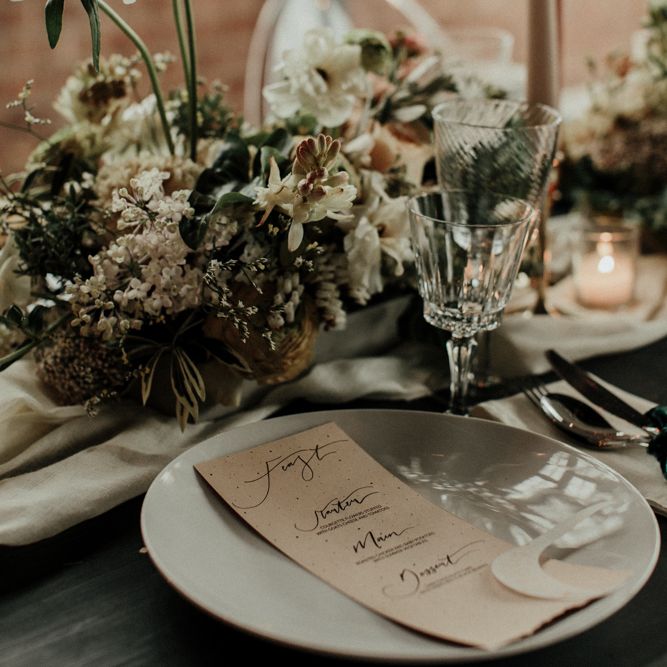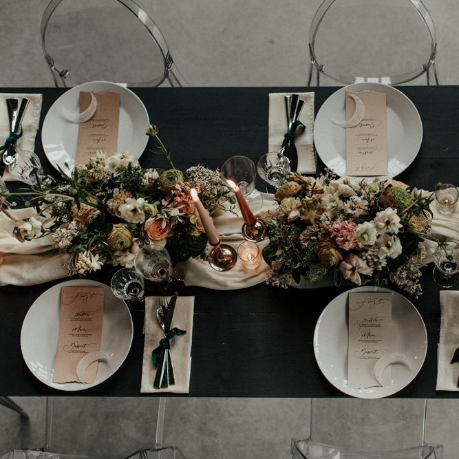 "There is a simple, minimalist dress for the day by Jessica Bennett Bespoke and a sequinned skirt with back to front bolero top, from Amy Mair for the evening (both British Designers). The end result is meant to be not too 'done', a slightly more natural look for the day and then a bold lip look for the evening. The shoot features a tablescape, echoing the rust, nude tones with full floral arrangements in concrete vessels along with the table, combined with Ester and Erik candles. The stationery is by CuriousMe with modern calligraphy, crystals, and hanging place names. There is also a Bridesmaids gift box, with gifts from independent artists and makers, for those difficult to buy for maids." - Rebecca Eyre