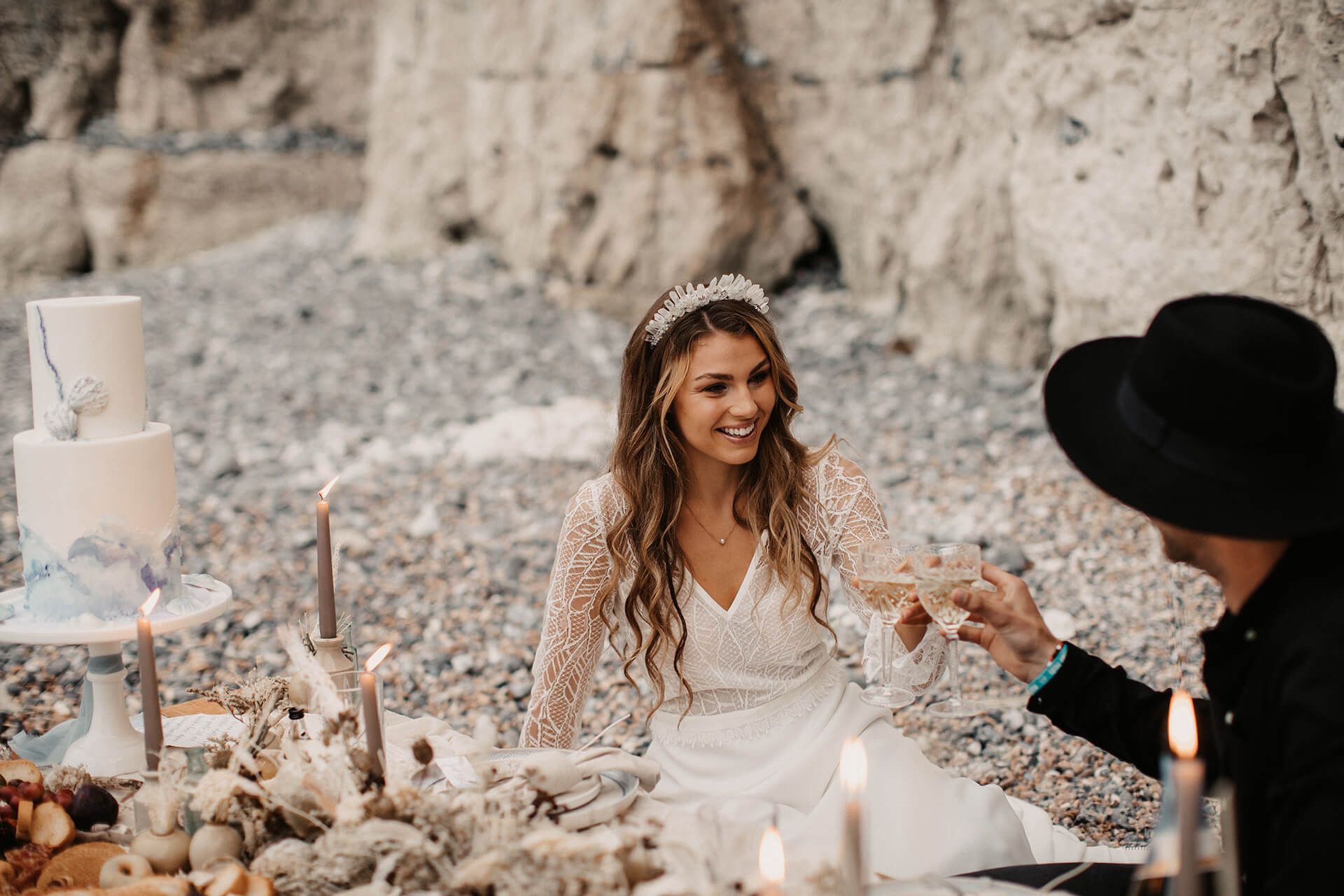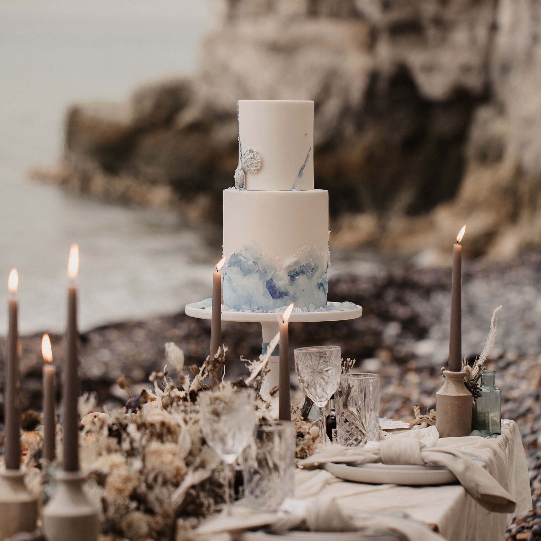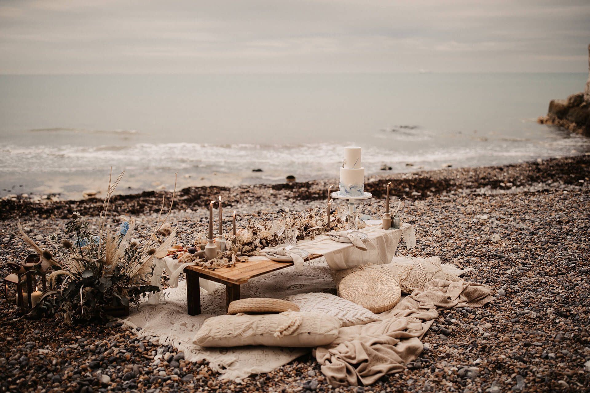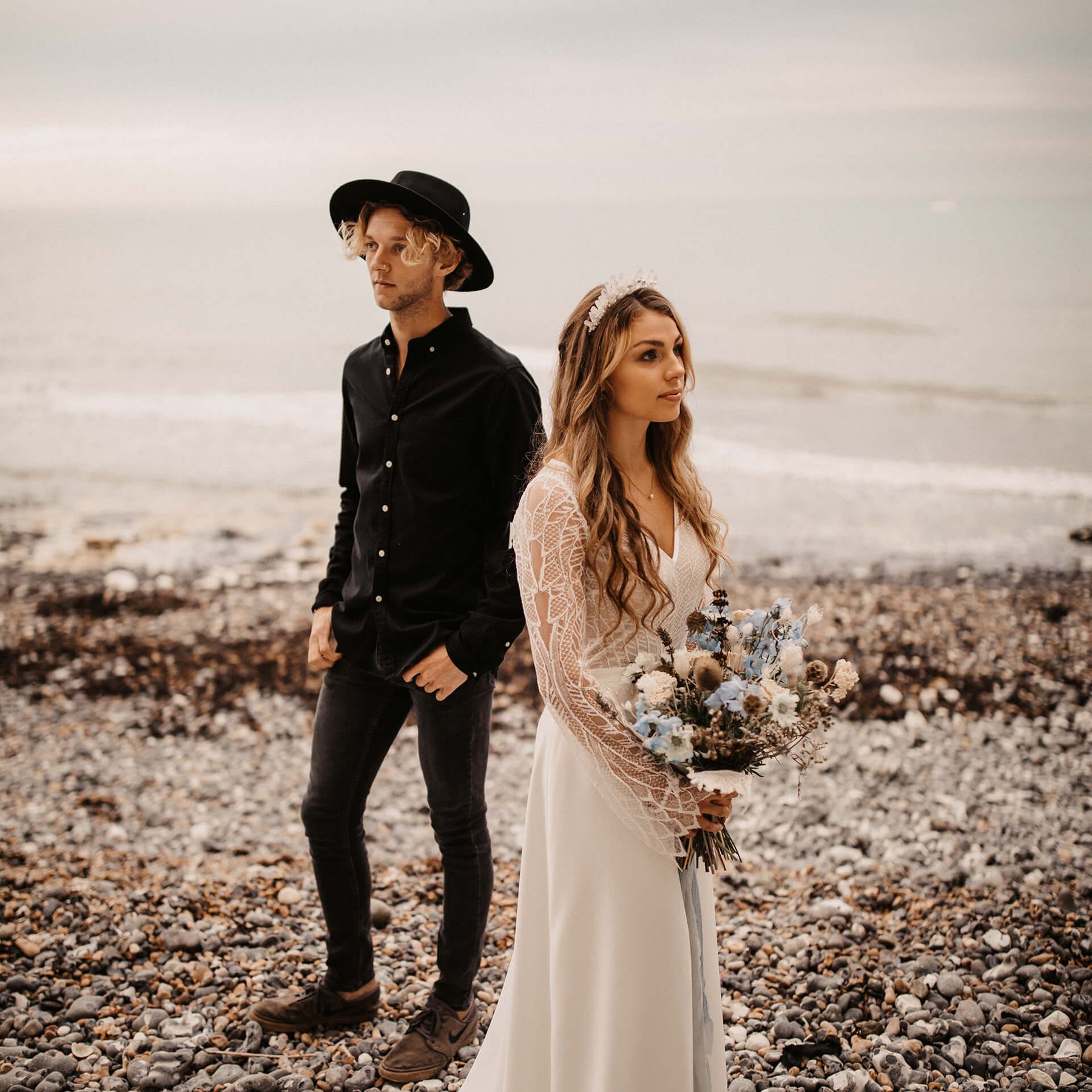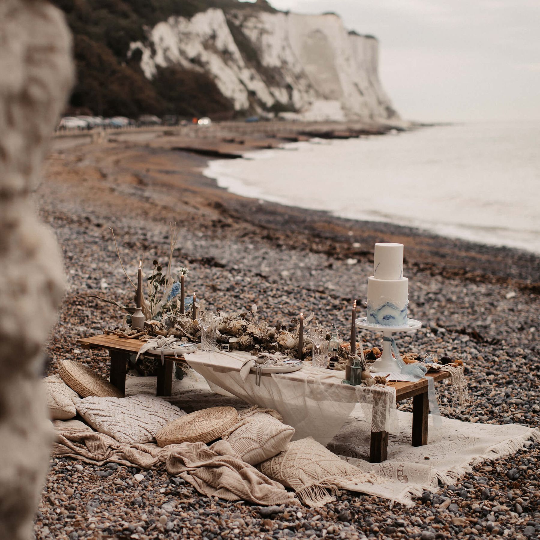 We chose to set up the coastal elopement at St. Margaret’s Bay in Kent with the famous white cliffs backdrop and the beach scattered with dark grey pebbles almost black when washed by the sea. The beach itself gives you all the feels, hence the styling of the shoot was minimal with natural elements from the coastline. Soft blue and natural grey shades went into gorgeous flower arrangements, table linen, table name cards and the beautifully handcrafted small wedding cake.