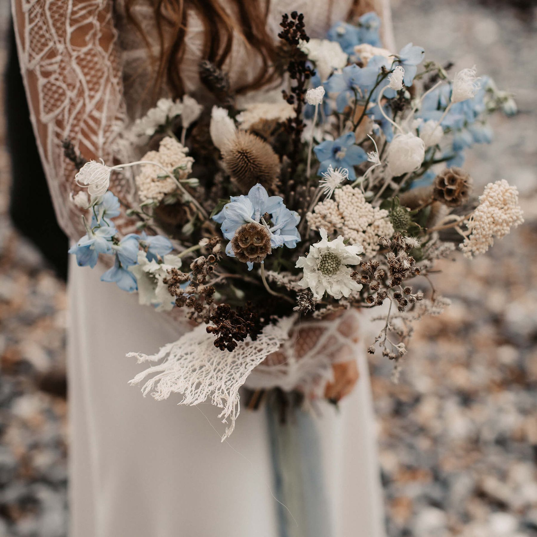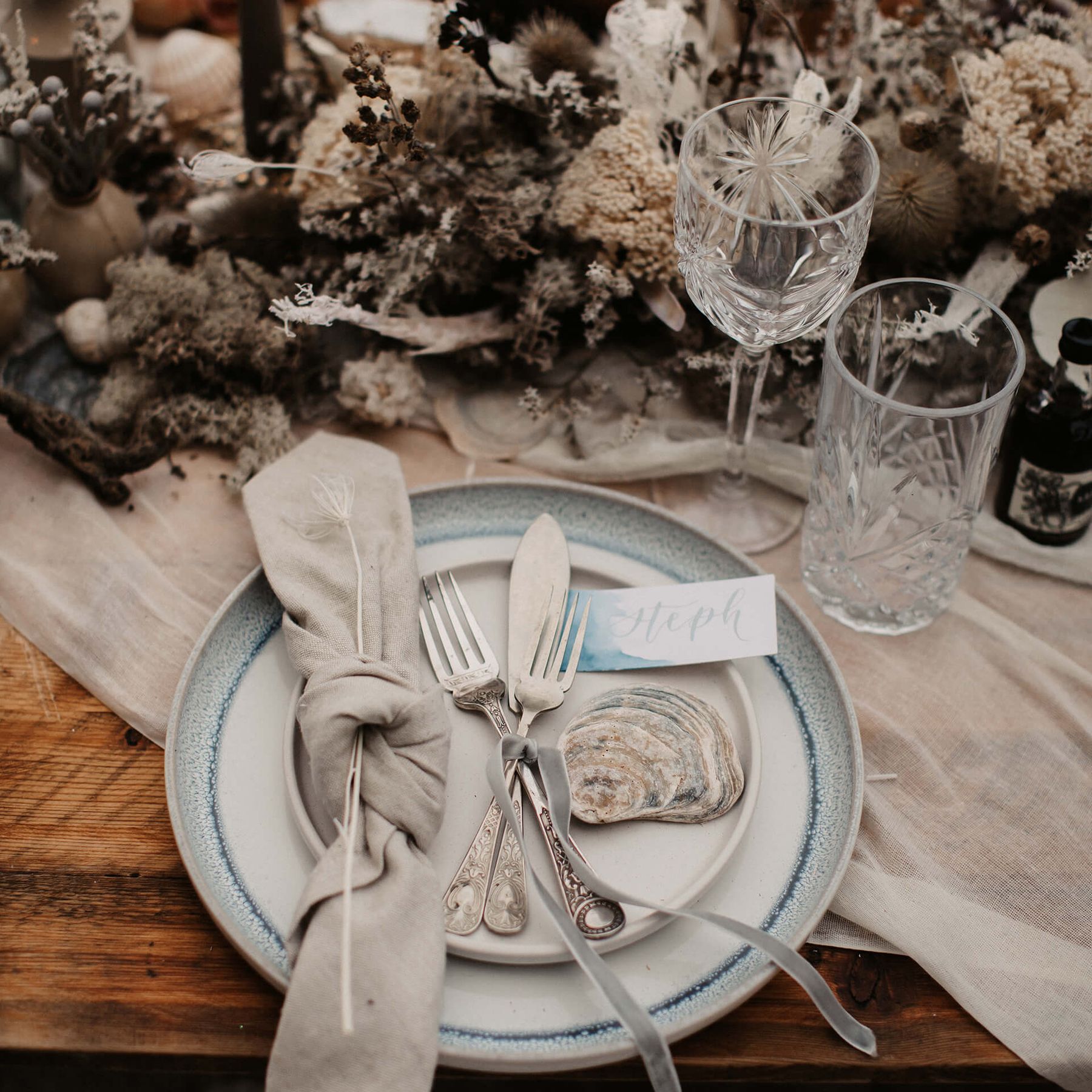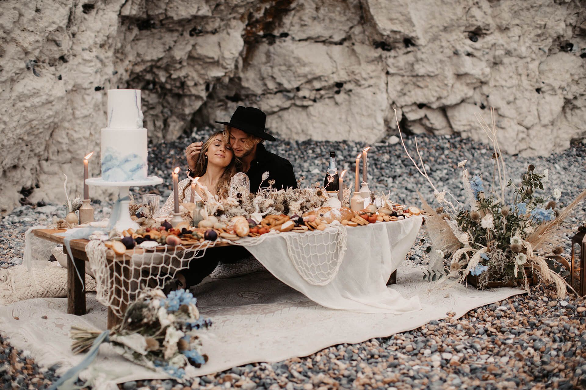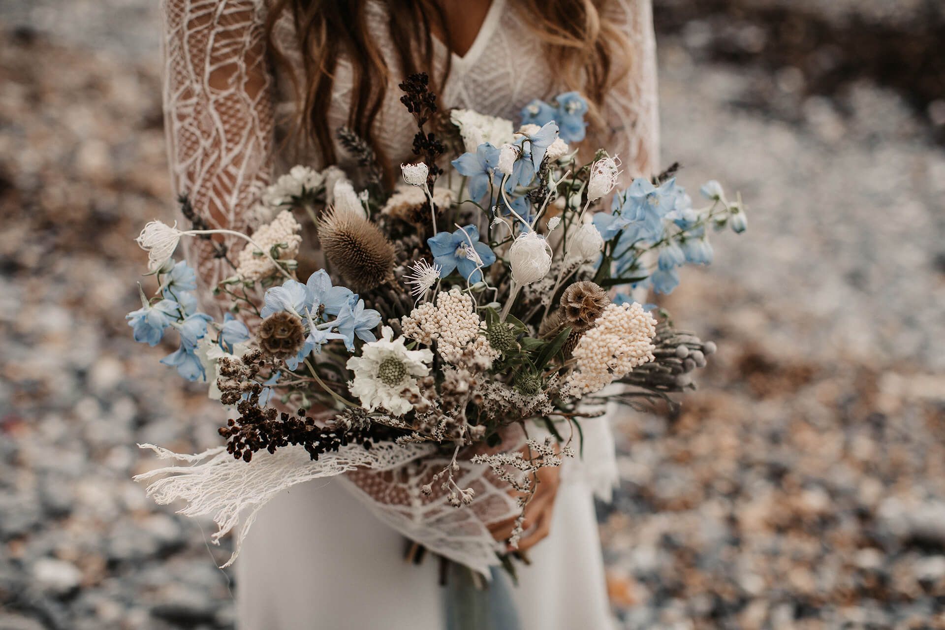 We chose to set up the coastal elopement at St. Margaret’s Bay in Kent with the famous white cliffs backdrop and the beach scattered with dark grey pebbles almost black when washed by the sea. The beach itself gives you all the feels, hence the styling of the shoot was minimal with natural elements from the coastline. Soft blue and natural grey shades went into gorgeous flower arrangements, table linen, table name cards and the beautifully handcrafted small wedding cake.