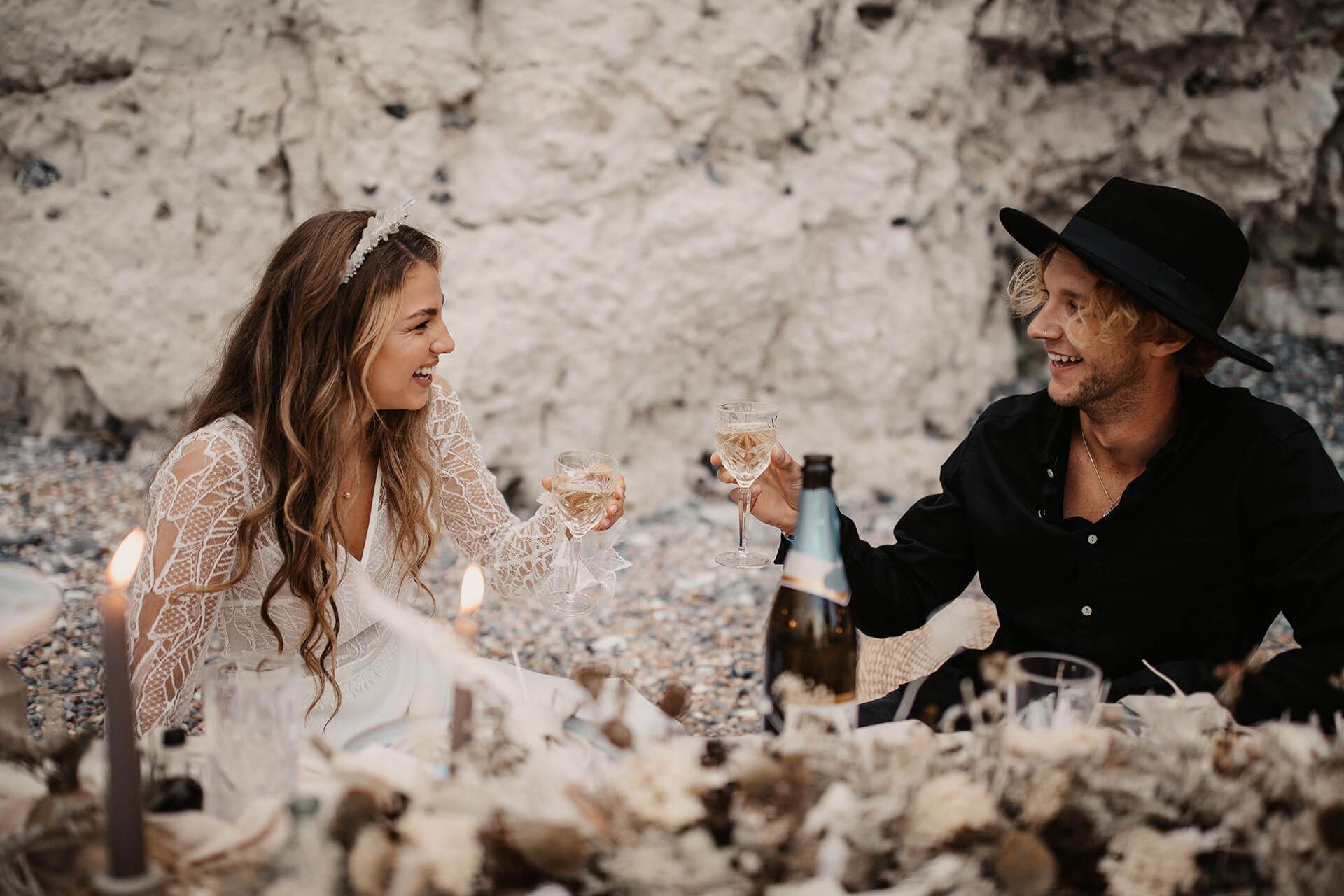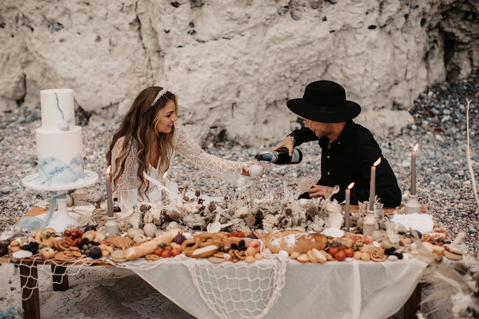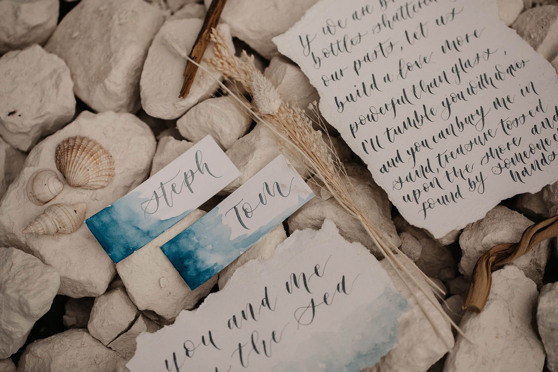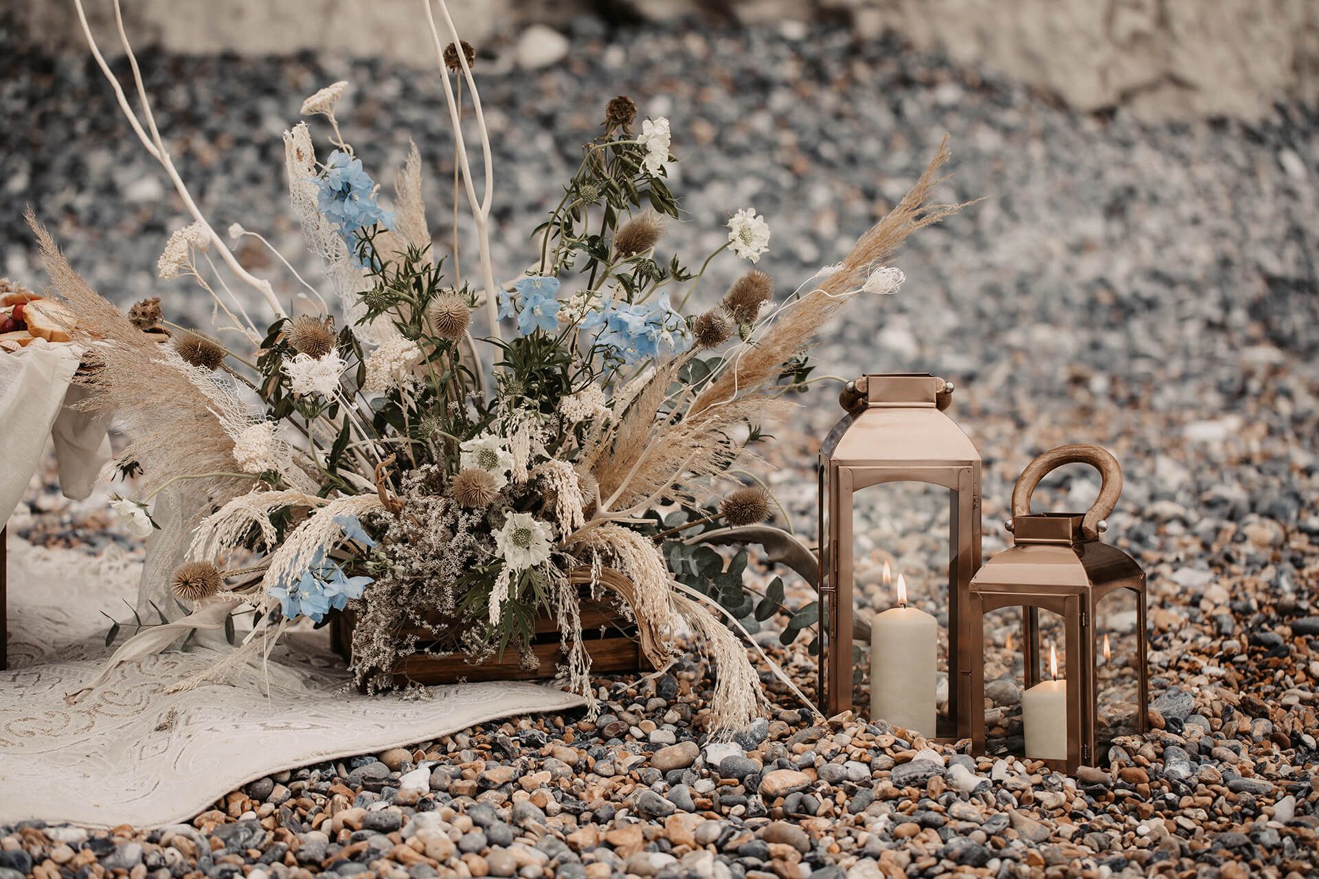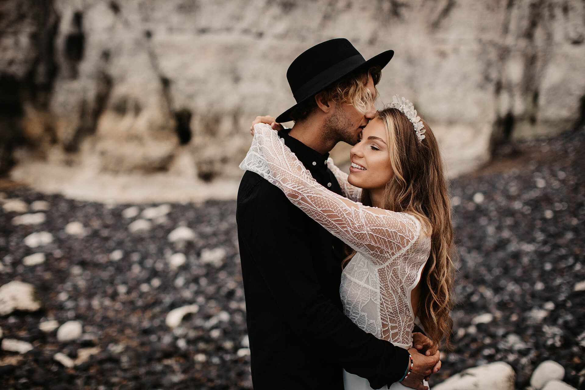 We chose to set up the coastal elopement at St. Margaret’s Bay in Kent with the famous white cliffs backdrop and the beach scattered with dark grey pebbles almost black when washed by the sea. The beach itself gives you all the feels, hence the styling of the shoot was minimal with natural elements from the coastline. Soft blue and natural grey shades went into gorgeous flower arrangements, table linen, table name cards and the beautifully handcrafted small wedding cake.