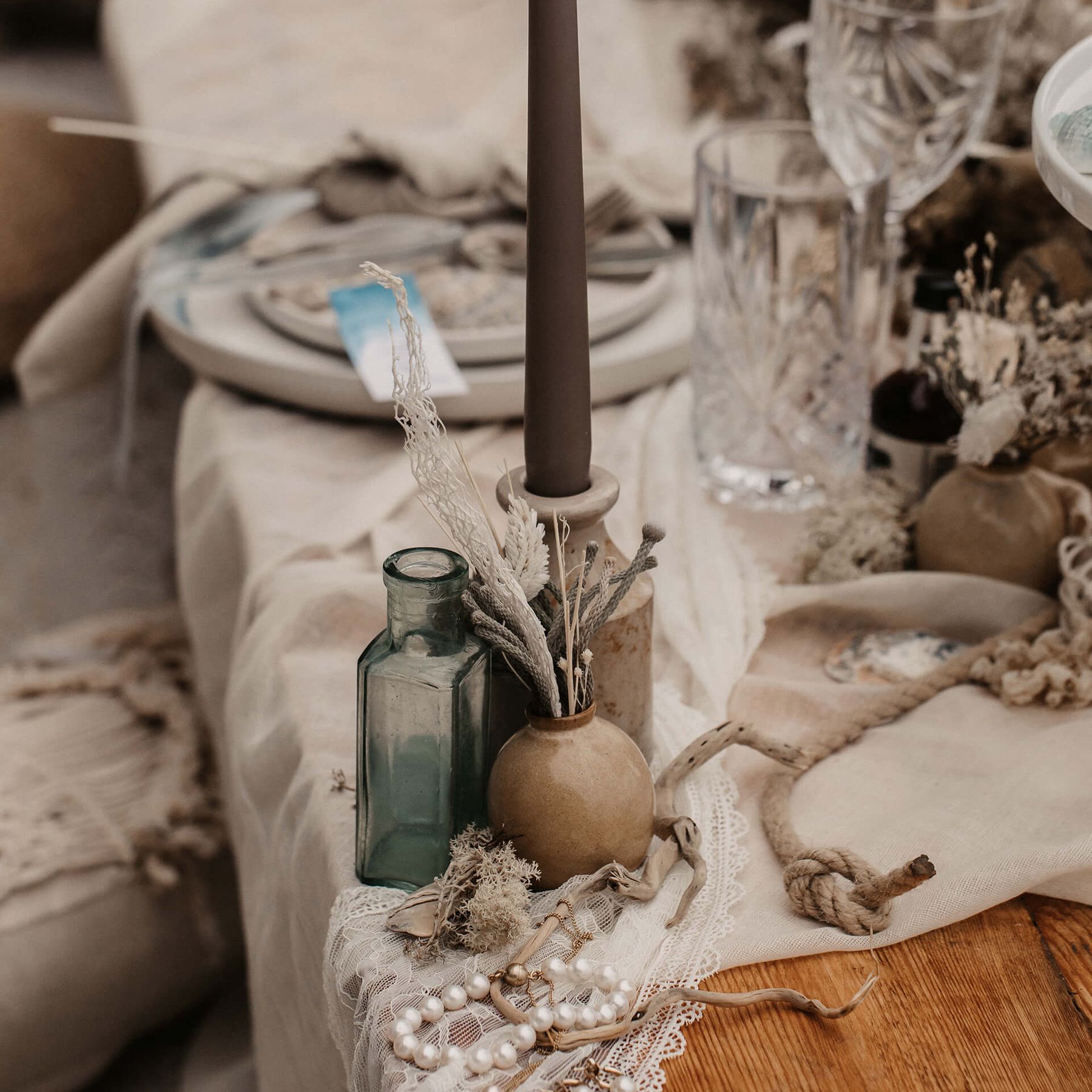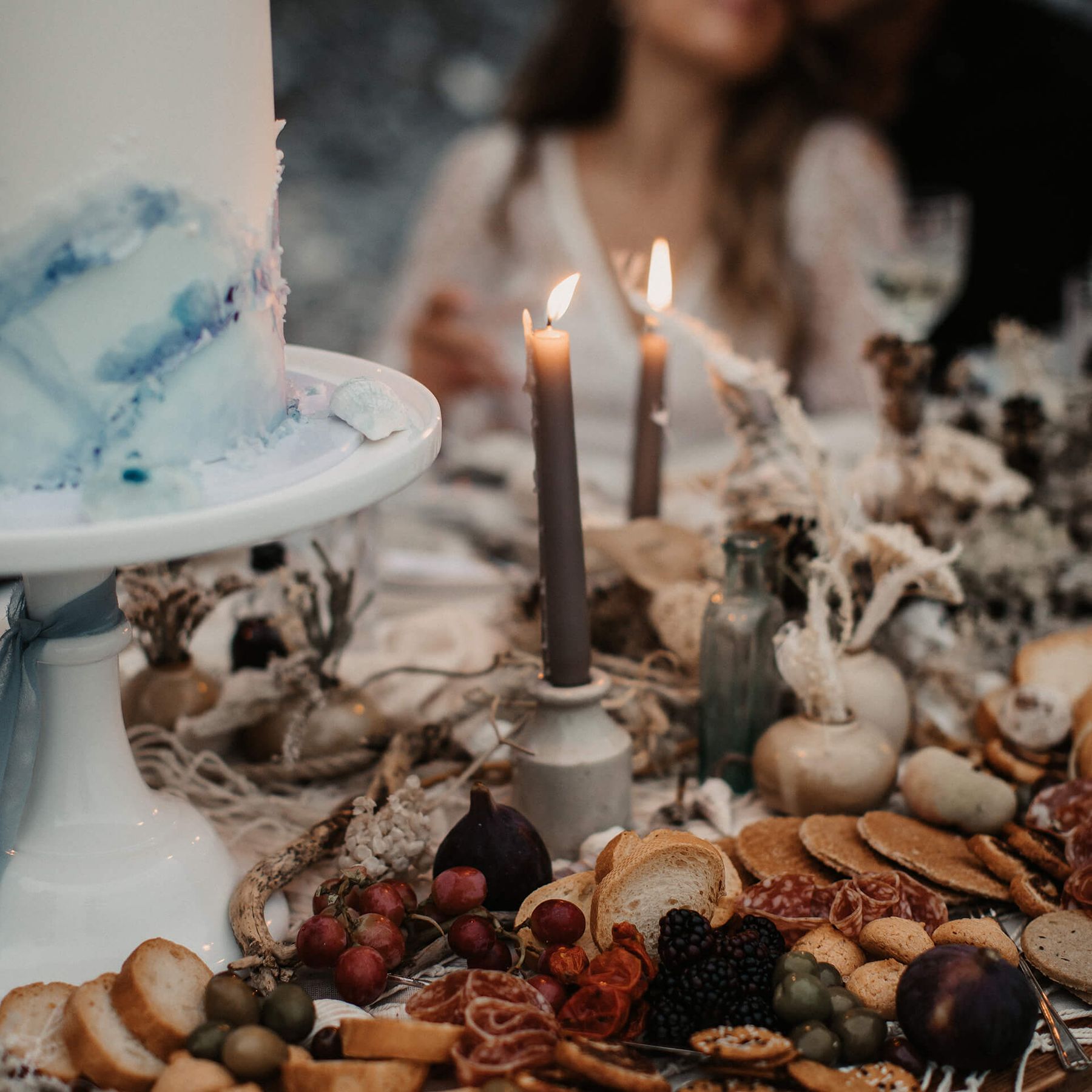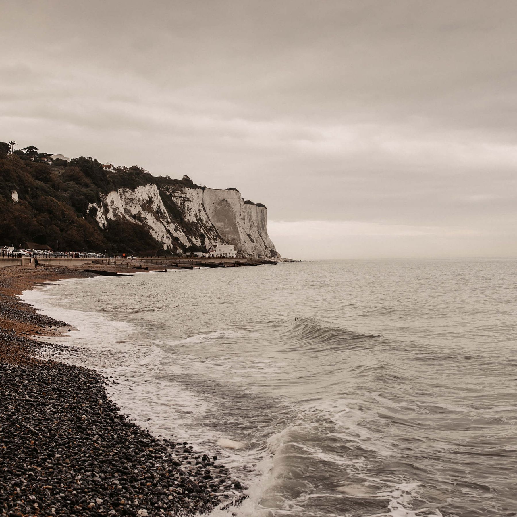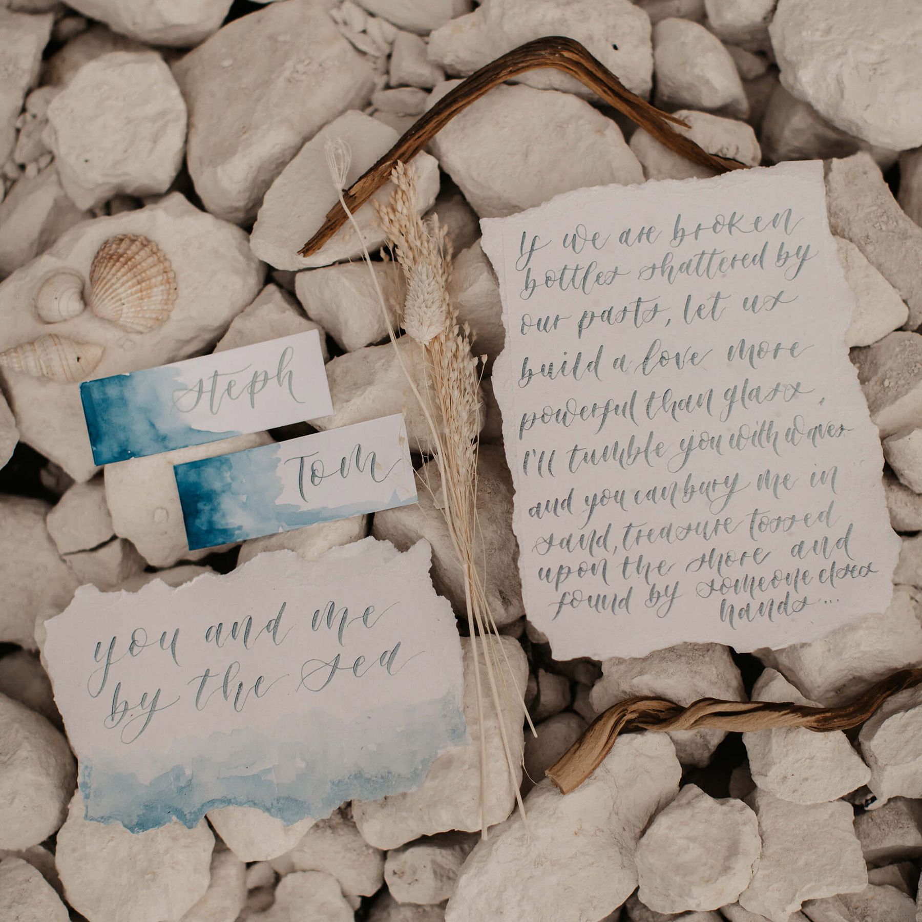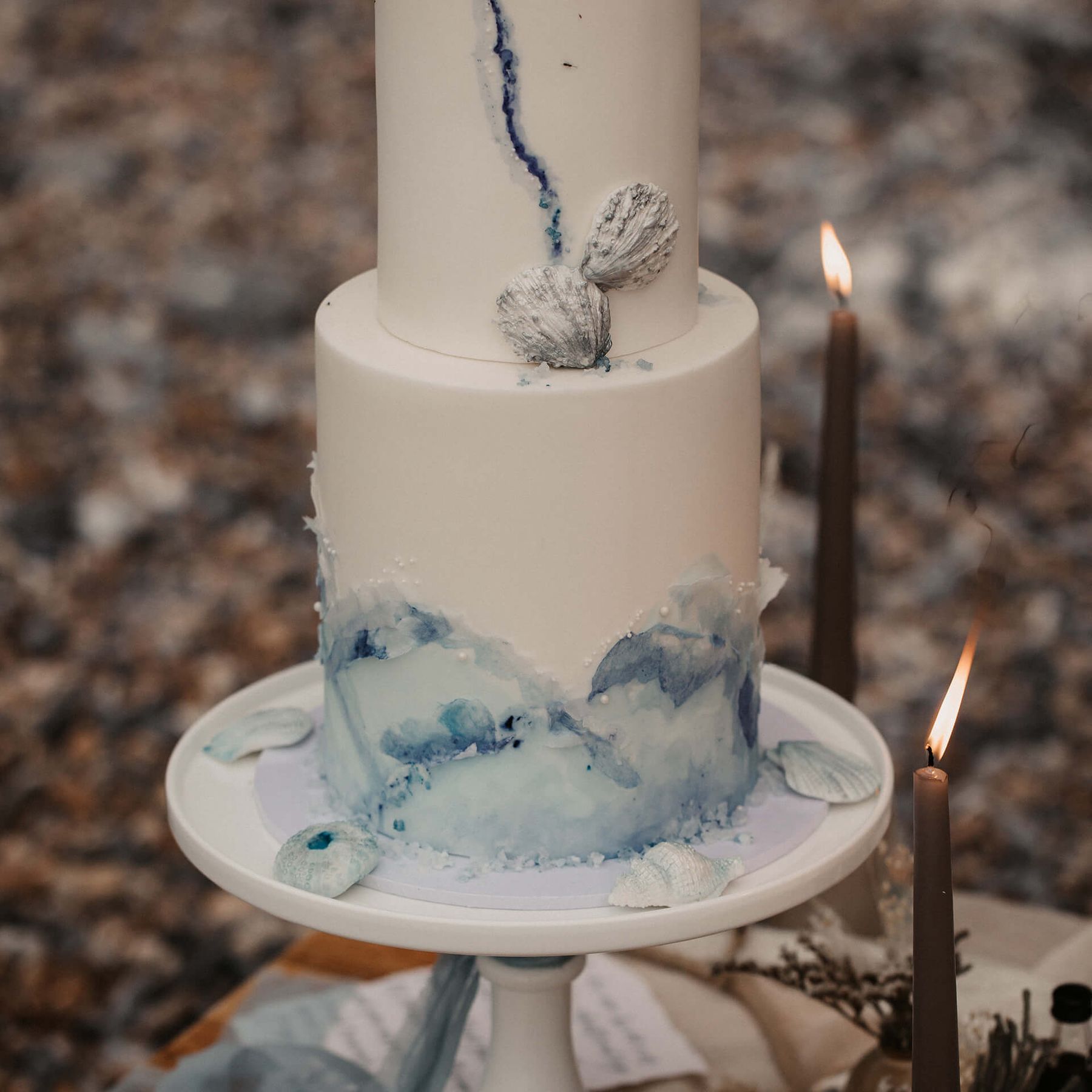 We chose to set up the coastal elopement at St. Margaret’s Bay in Kent with the famous white cliffs backdrop and the beach scattered with dark grey pebbles almost black when washed by the sea. The beach itself gives you all the feels, hence the styling of the shoot was minimal with natural elements from the coastline. Soft blue and natural grey shades went into gorgeous flower arrangements, table linen, table name cards and the beautifully handcrafted small wedding cake.