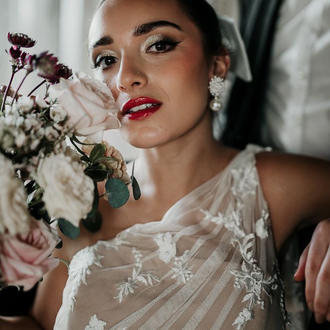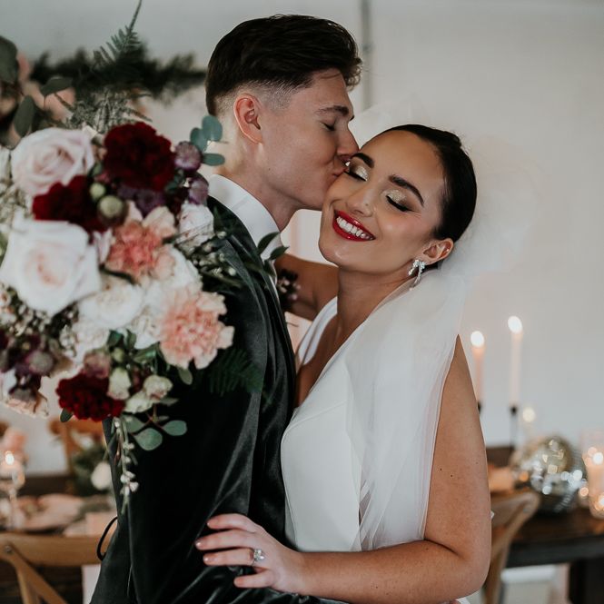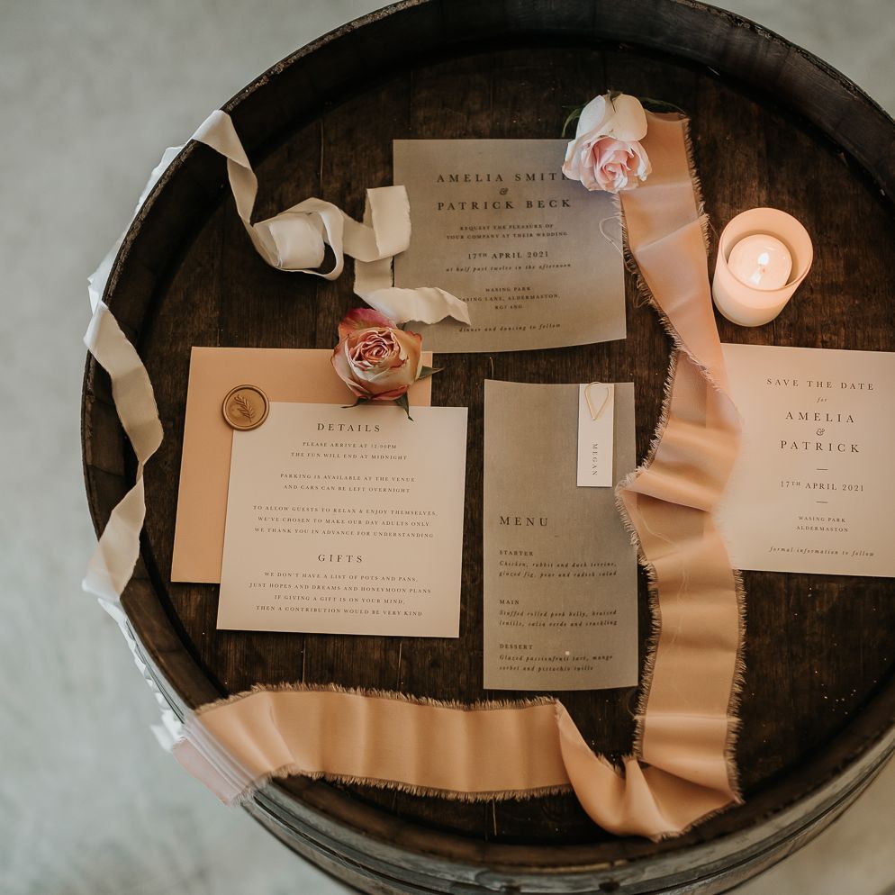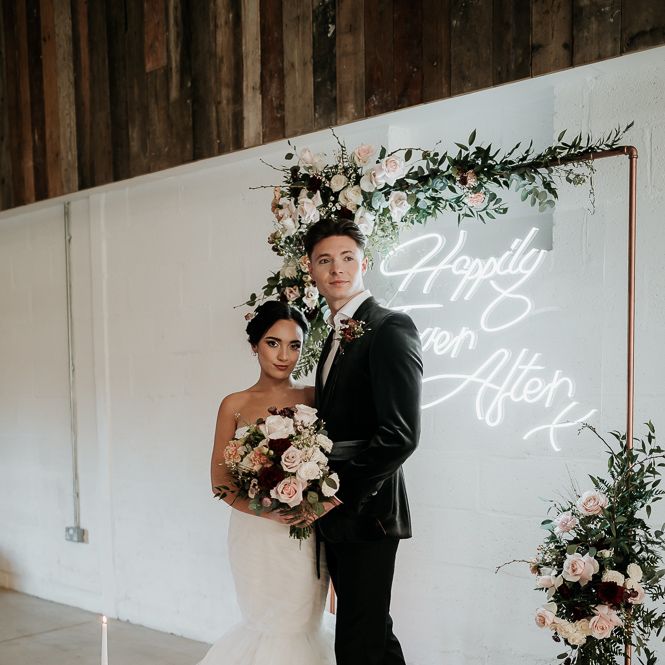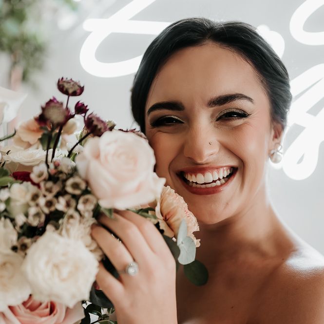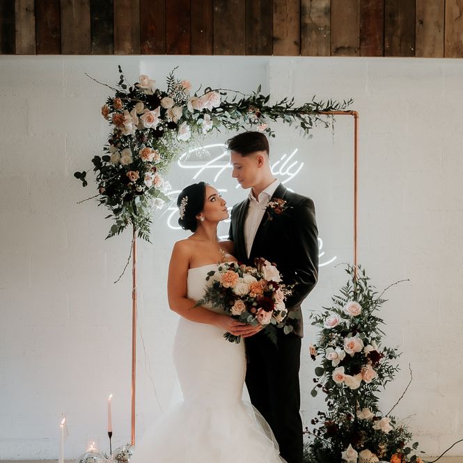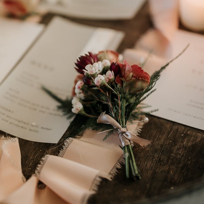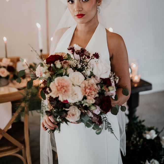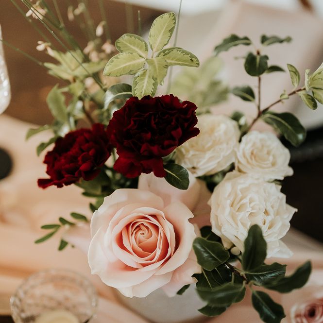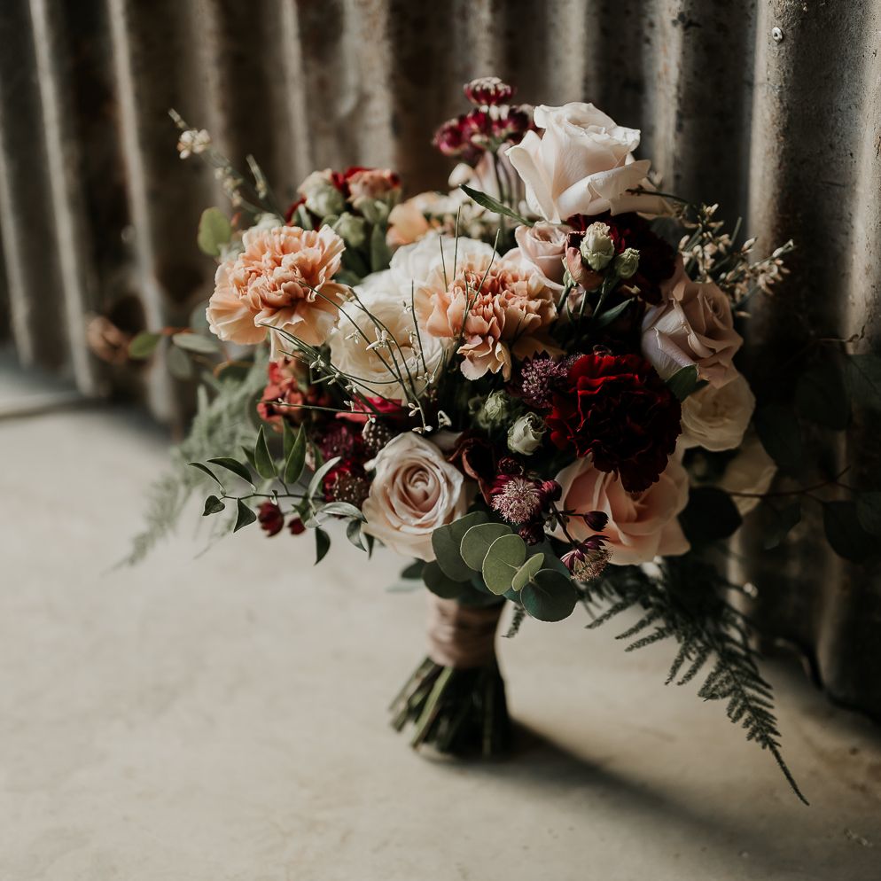 We wanted the flowers to ooze romance with a modern edge. Sarah used a colour palette of blush, bieges and deep burgundy with caramel Carnations, Astrantia, waxflower, chocolate Lisianthus and reflexed Menta Roses.