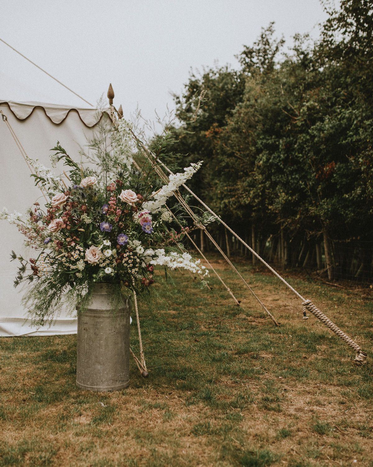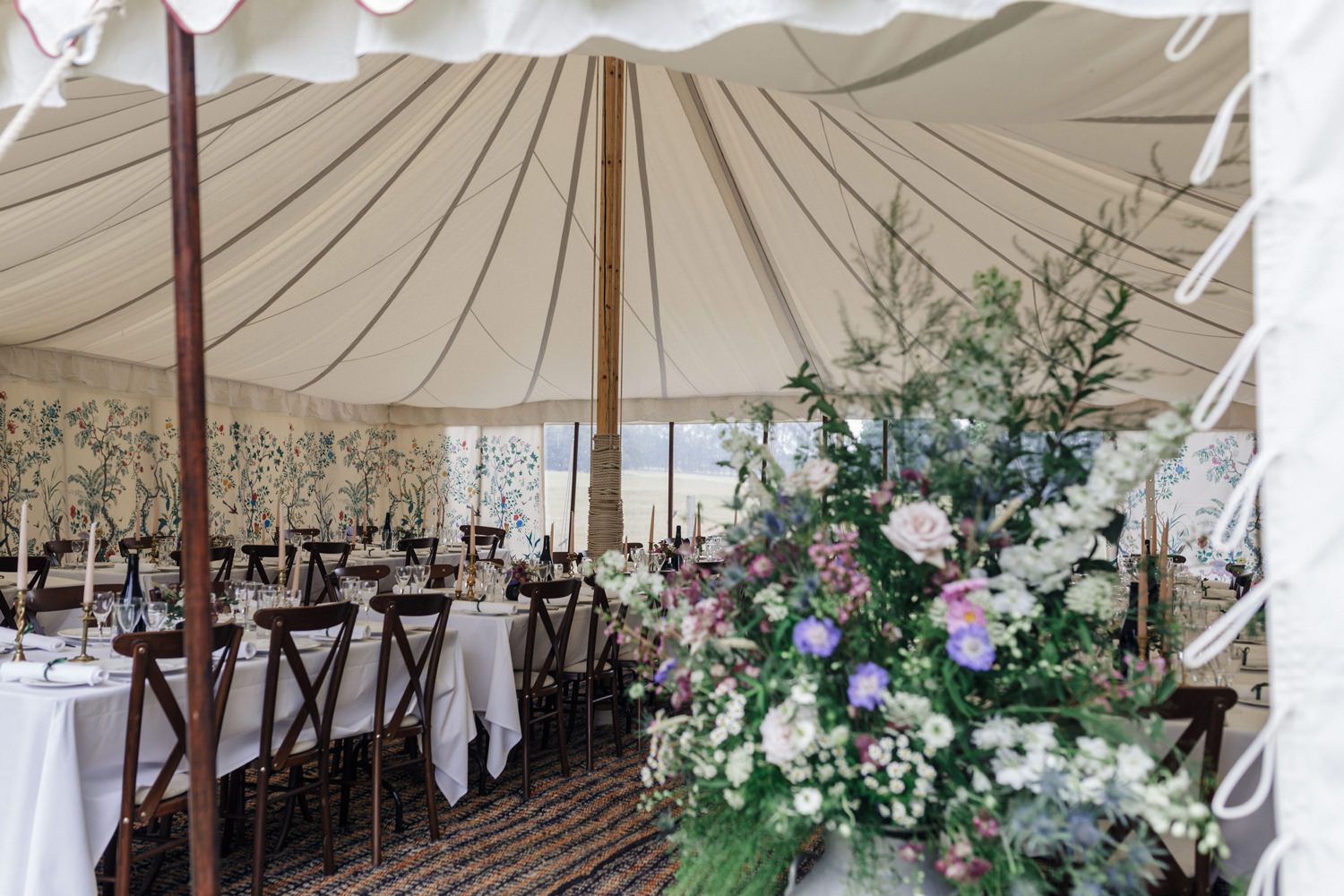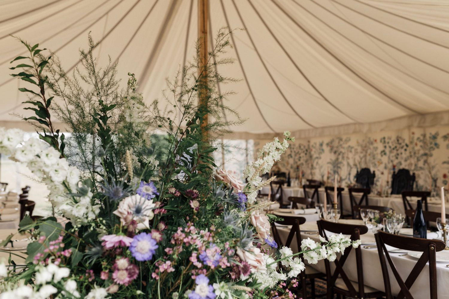 We really just tried to complement the location of Catherine’s family home. The chinoiserie lining of the LPM Bohemia marquee was a great aesthetic starting point that we fleshed out with flower arrangements made by Catherine’s godmother. Childhood friends at Okehurst Design provided some finishing touches in the marquee and bar area with a few key pieces of furniture.