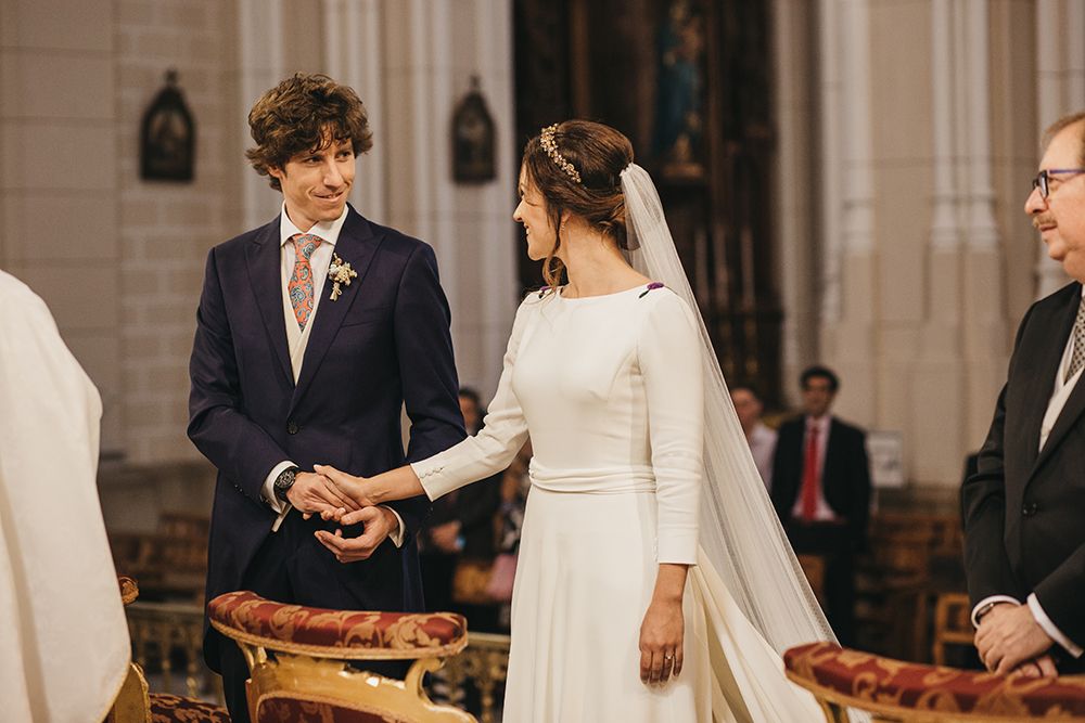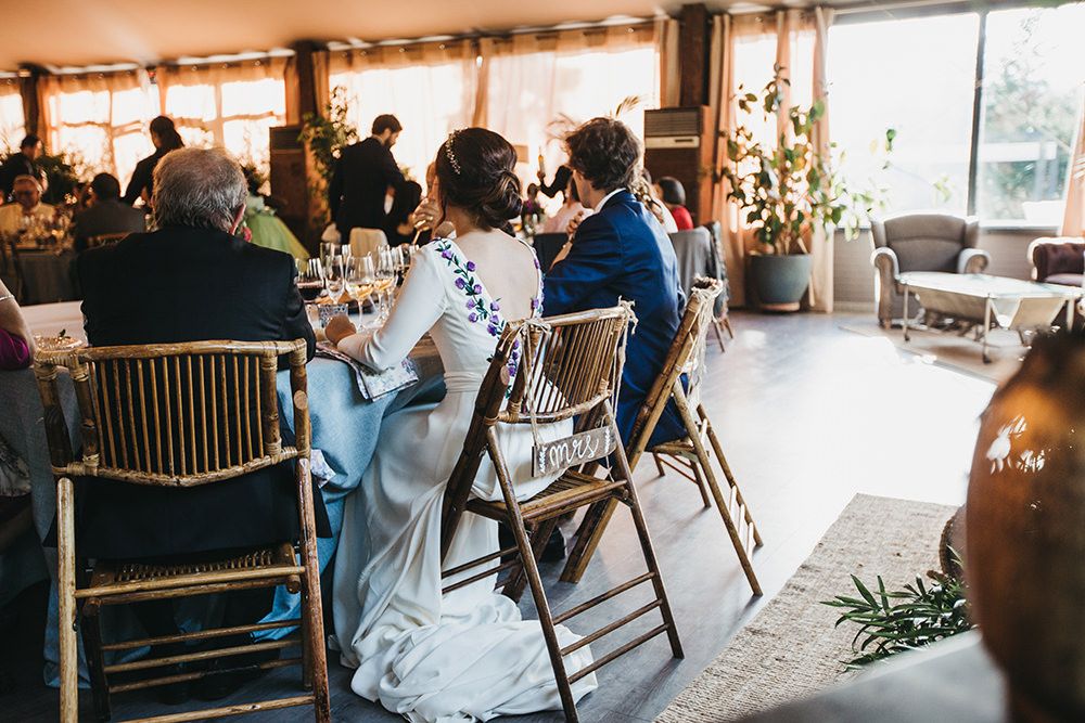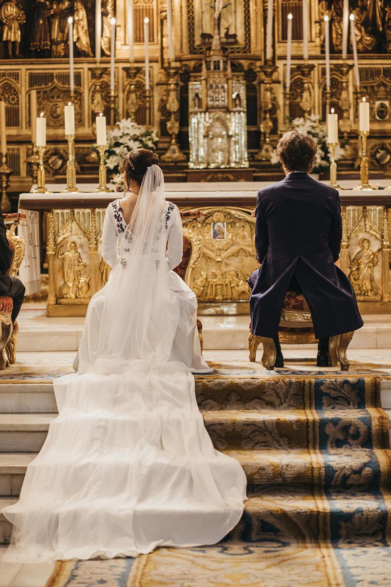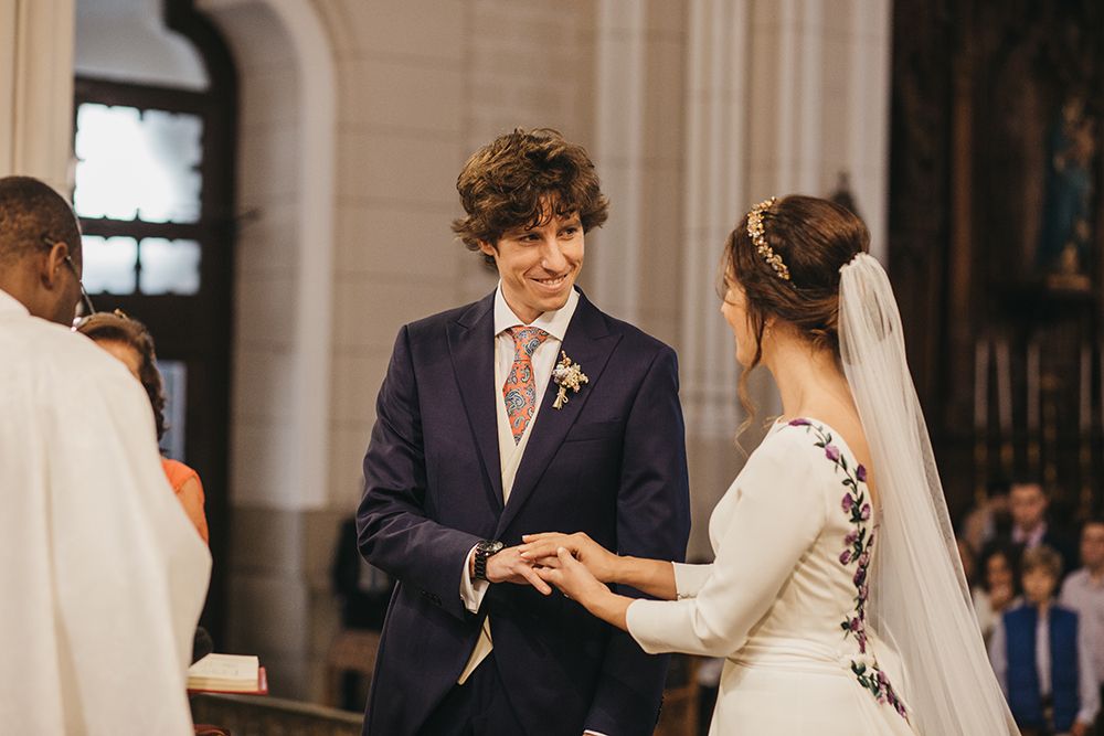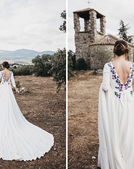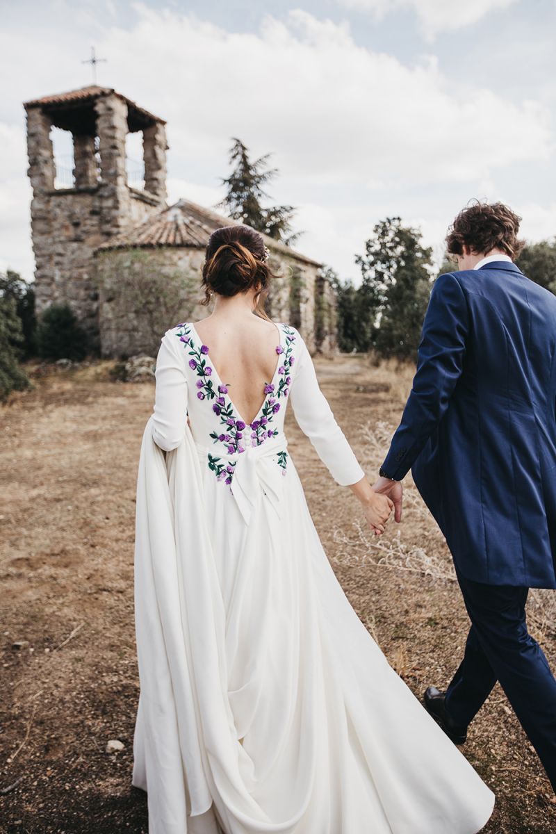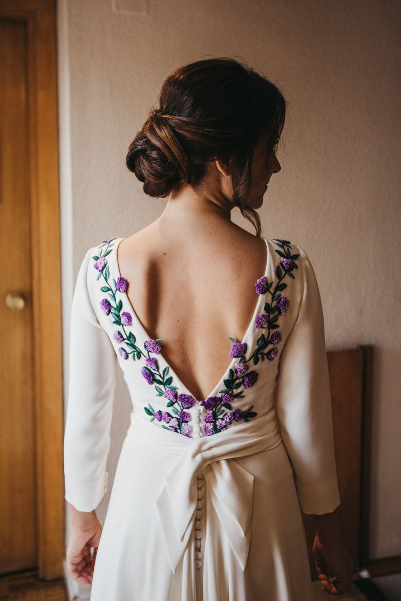 First time I went to Navascues I was fascinated, they were so nice with me and the service was perfect! Their advice, their fabrics, and the embroideries they show me were the key to making such an important decision. I knew what I wanted and I knew that was the place to do it. Since then, the fittings and seeing how the dress was designed … was a dream! The dress was made in a white Crepe Georgette, with a French sleeve, and a V-neckline, surrounded by embroidery with a French knot of violet flowers and green leaves.
