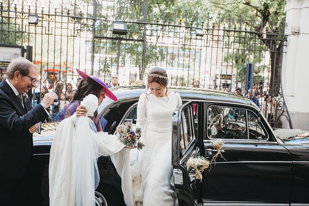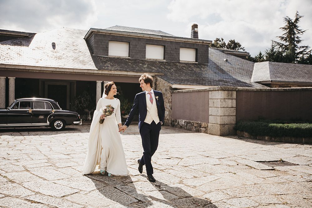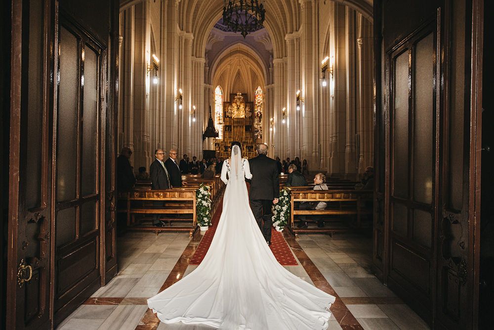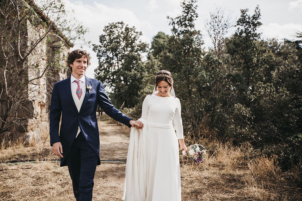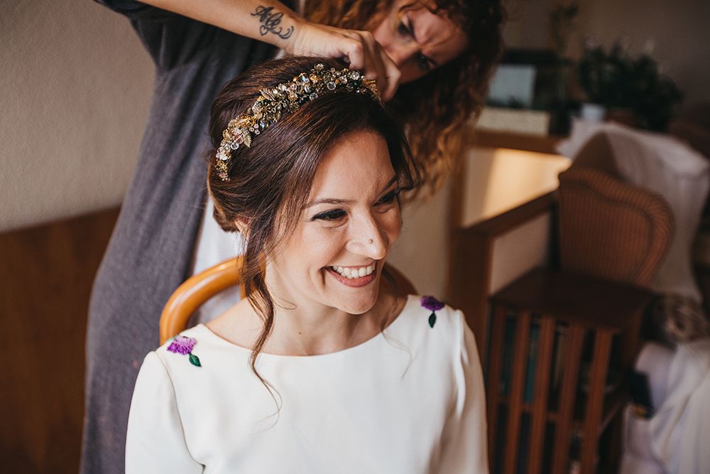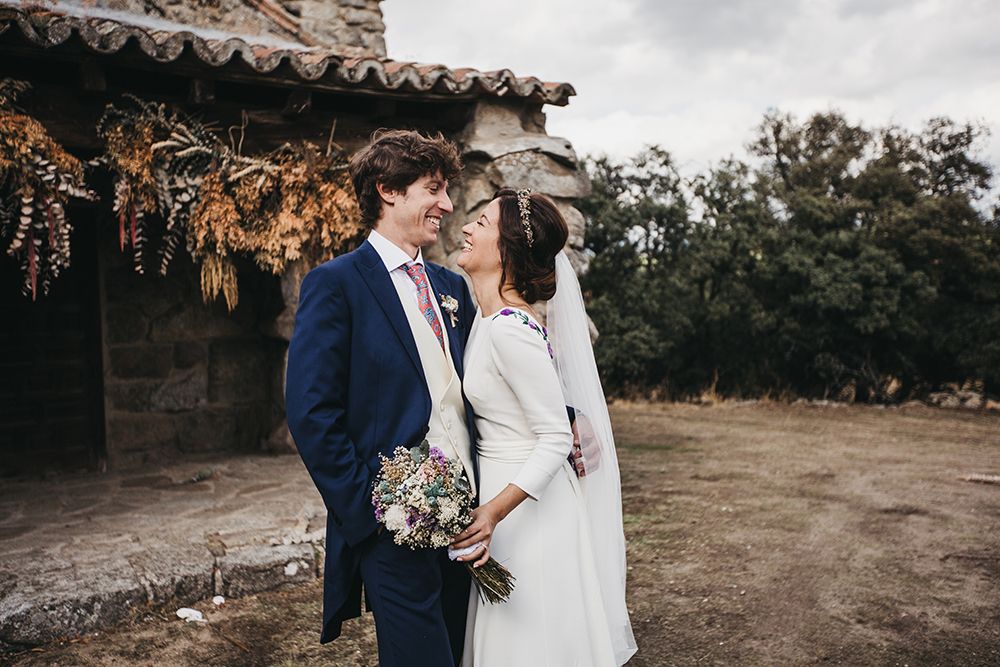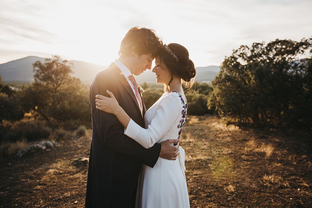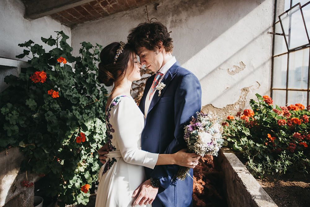 First time I went to Navascues I was fascinated, they were so nice with me and the service was perfect! Their advice, their fabrics, and the embroideries they show me were the key to making such an important decision. I knew what I wanted and I knew that was the place to do it. Since then, the fittings and seeing how the dress was designed … was a dream! The dress was made in a white Crepe Georgette, with a French sleeve, and a V-neckline, surrounded by embroidery with a French knot of violet flowers and green leaves.