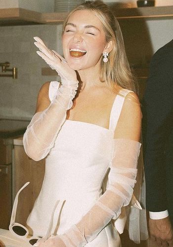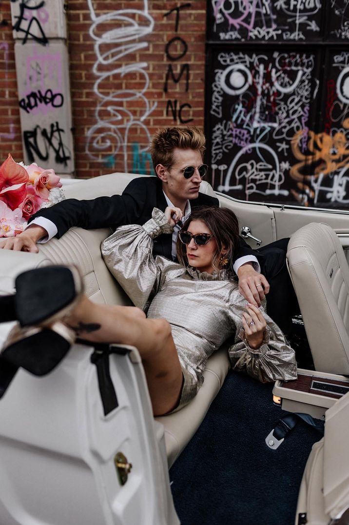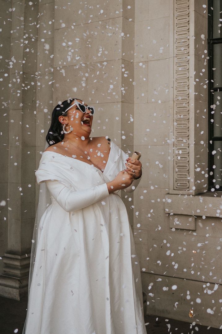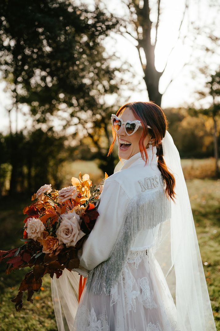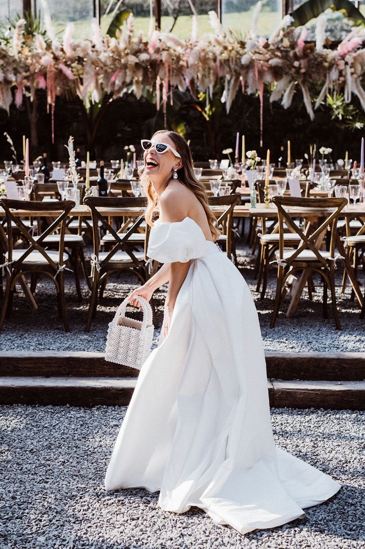 Bride wearing pearl bridal sunglasses for Parisian elopement wedding