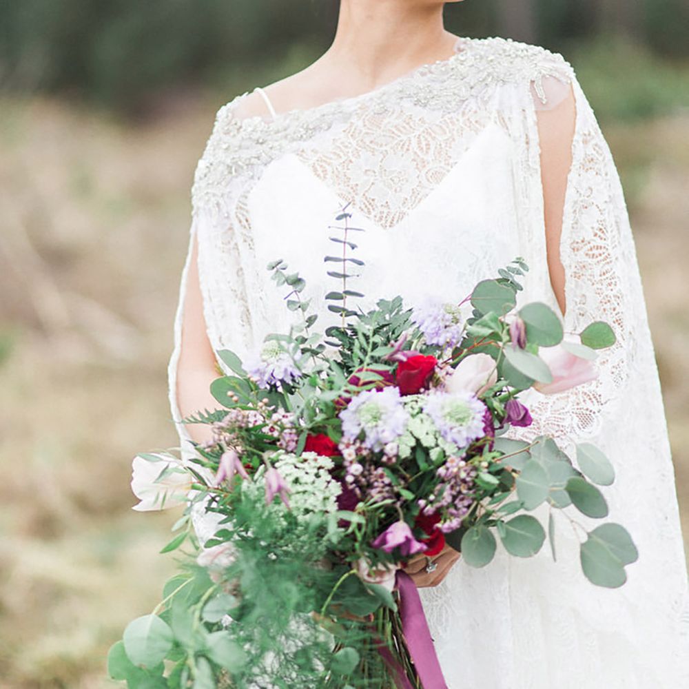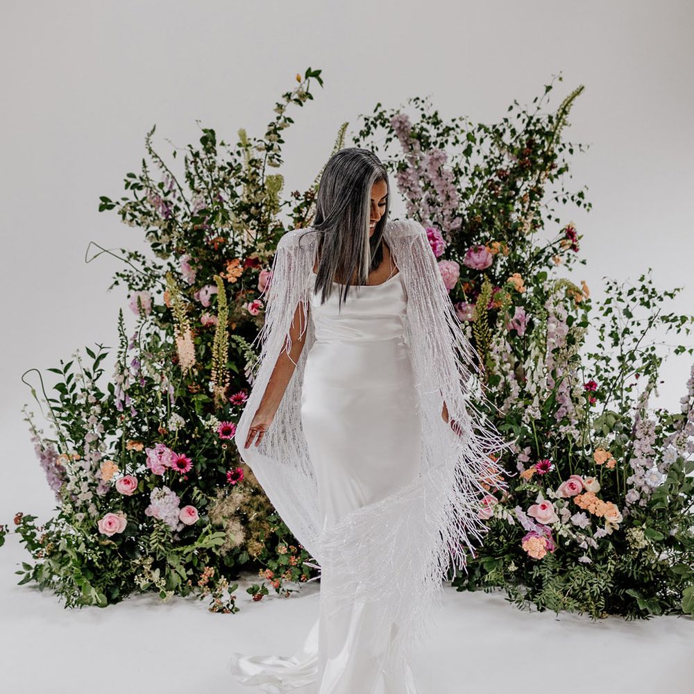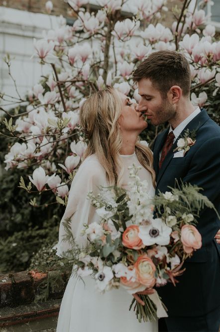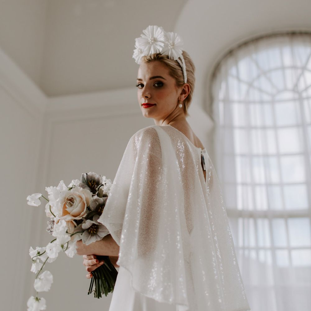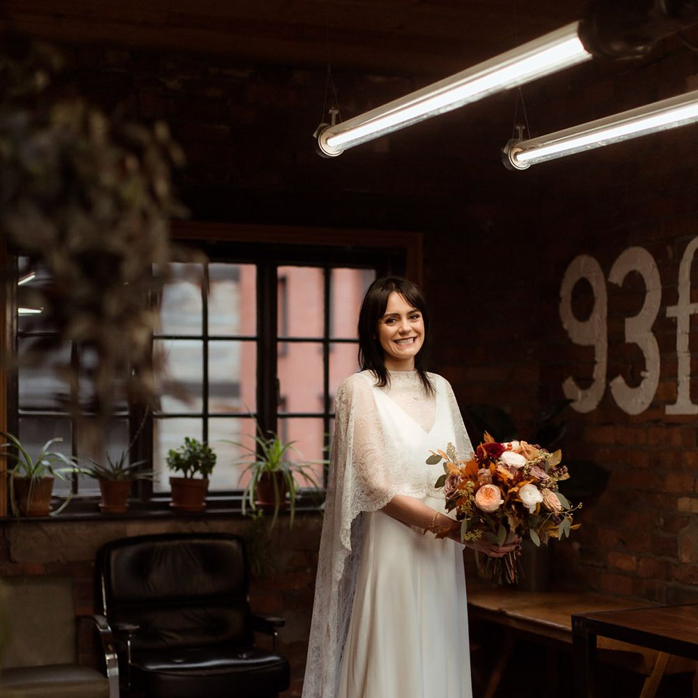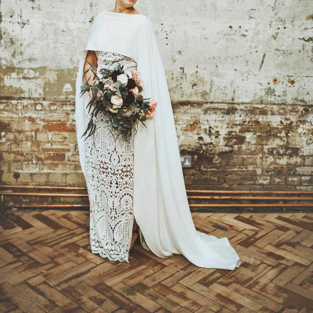 Plain Bridal Cape and Lace Wedding Dress for a Stylish City Wedding with Anemone Flowers