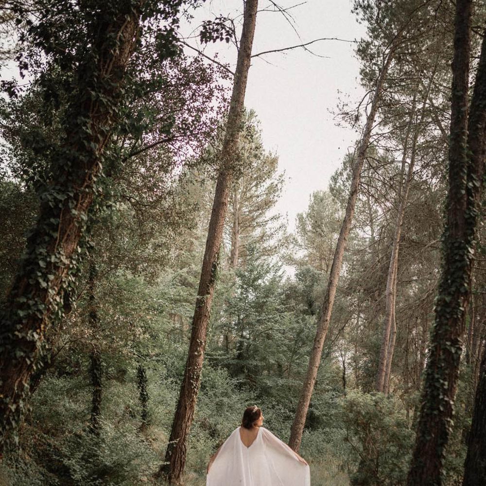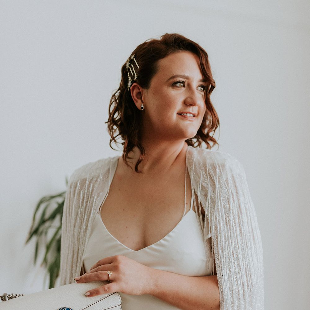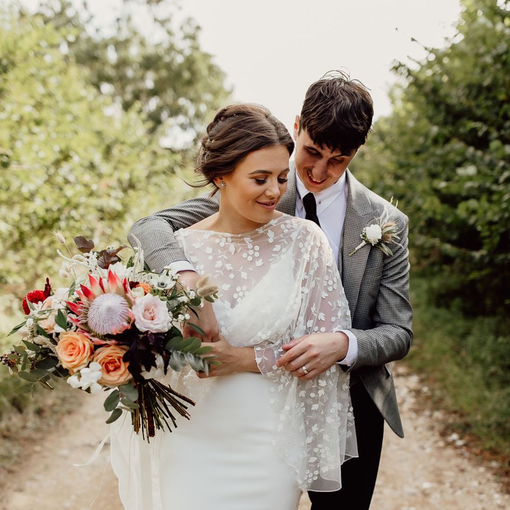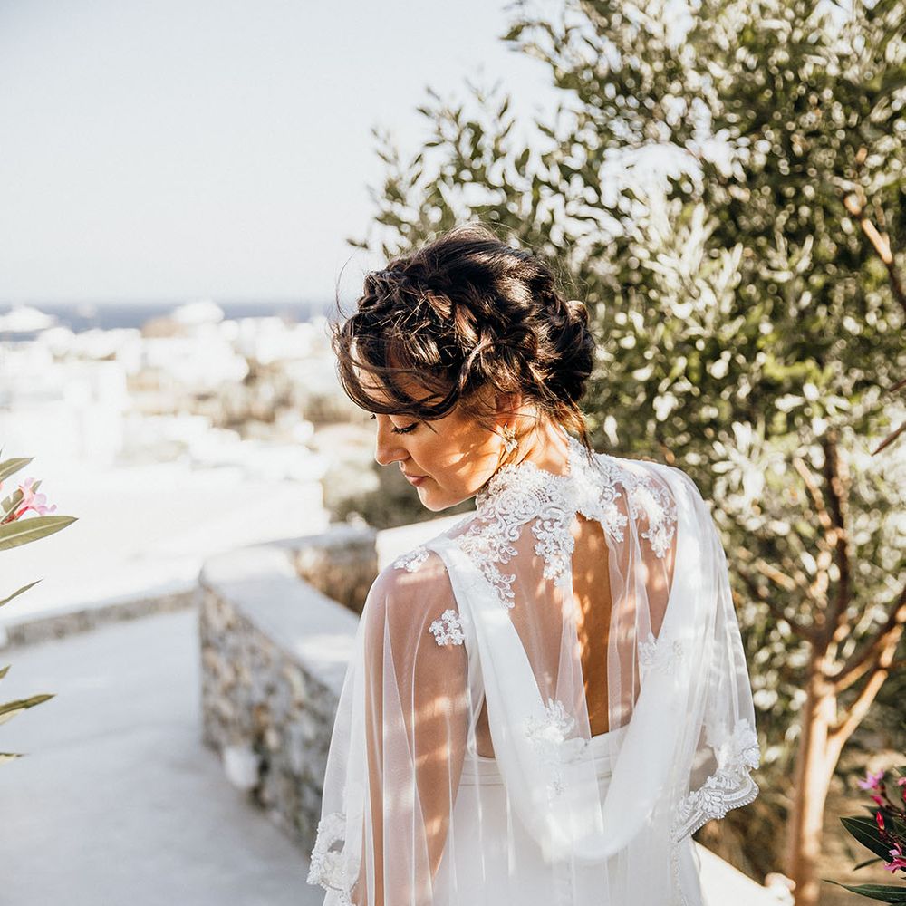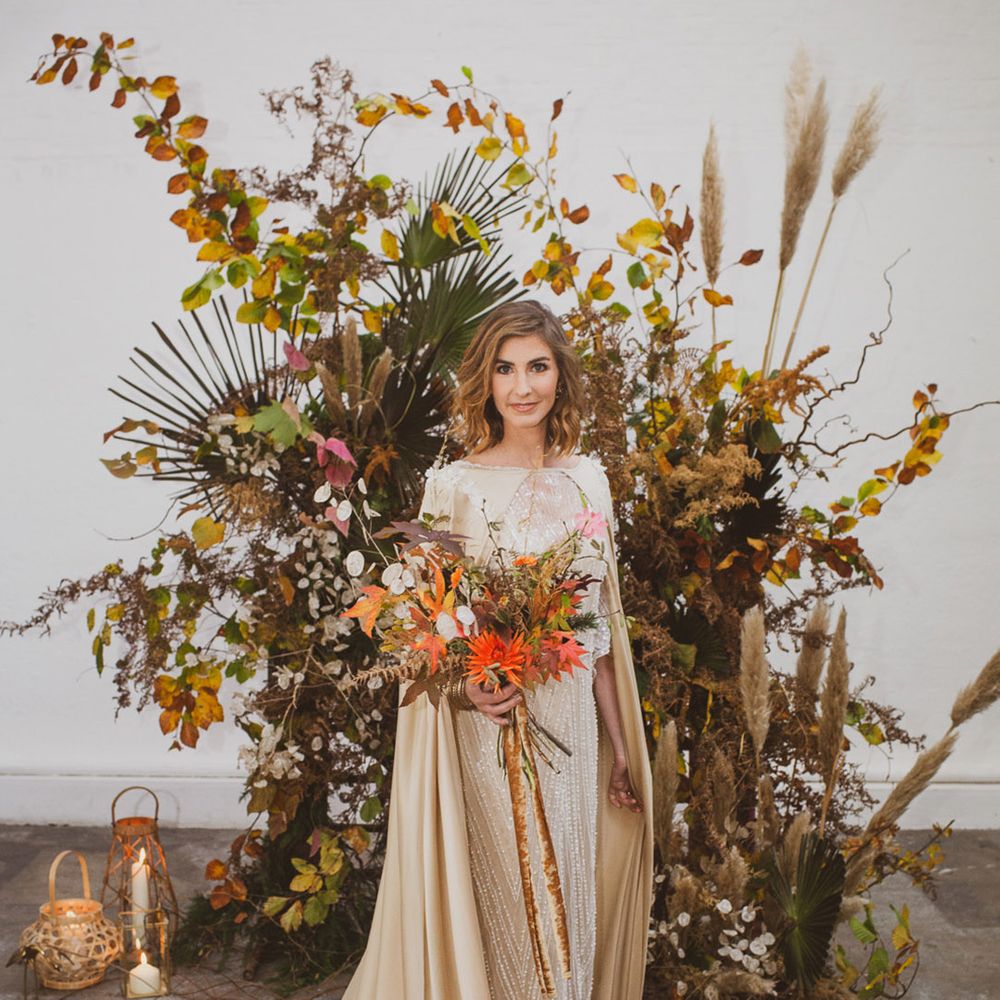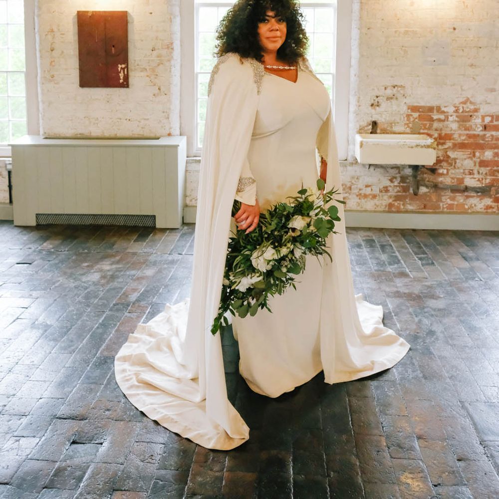 Plain Bridal Cape and Lace Wedding Dress for a Stylish City Wedding with Anemone Flowers