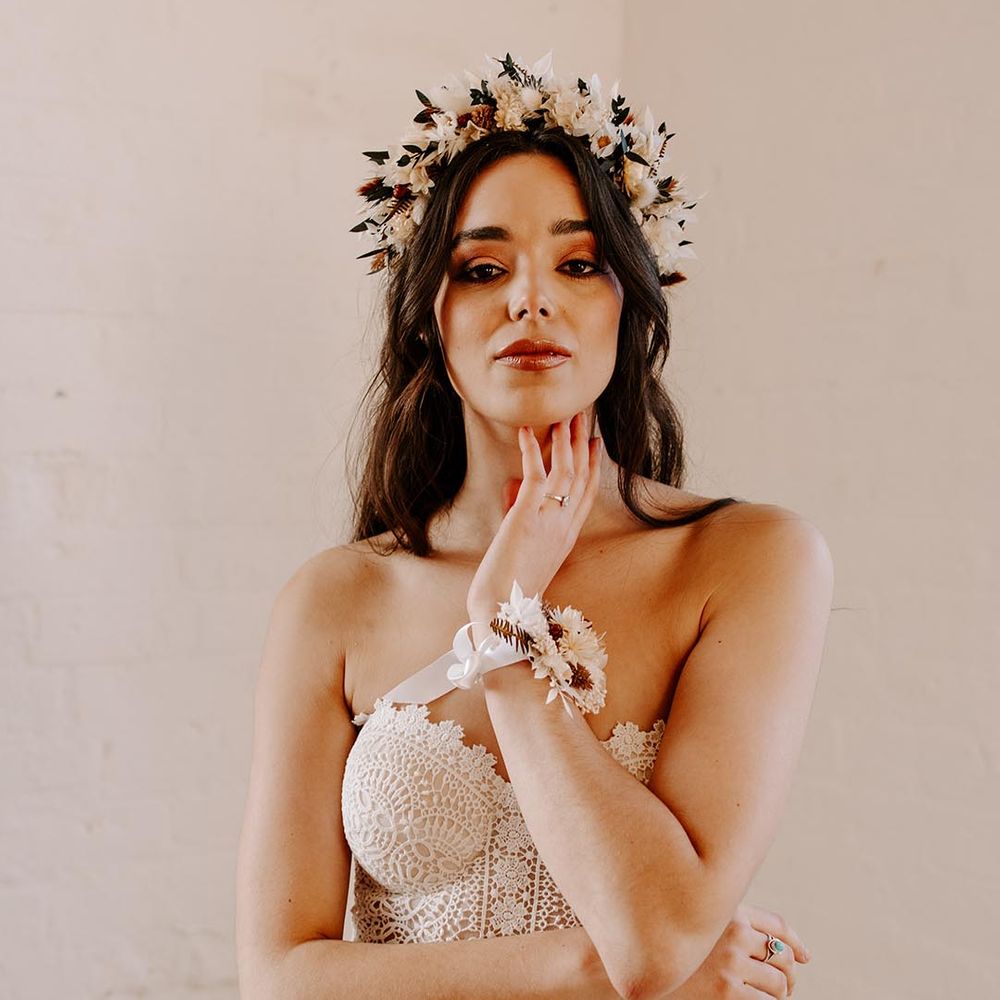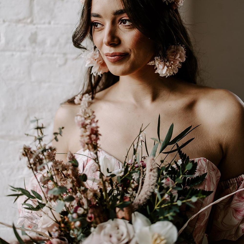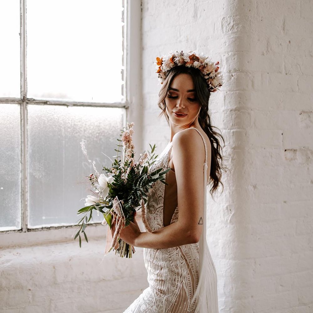 I wanted to create a beautiful boho minmalist inspiration shoot to introduce my new Luna and Wild 2022 bridal collection. The shoot took place at Hallam Mill in Stockport. Allowing the natural daylight to flood through the windows and highlight the bridal accessories.