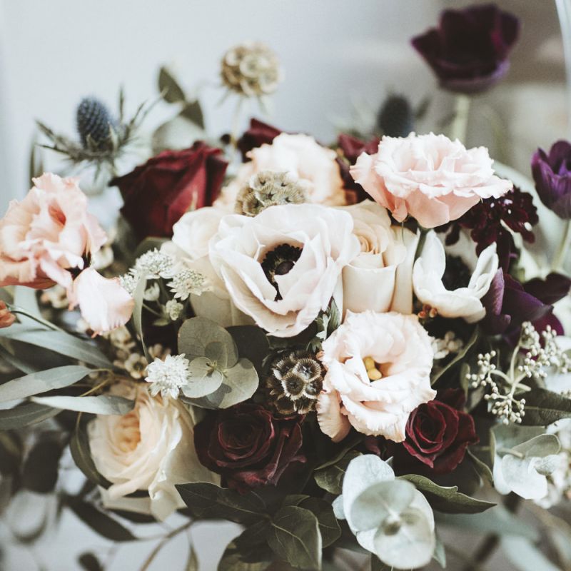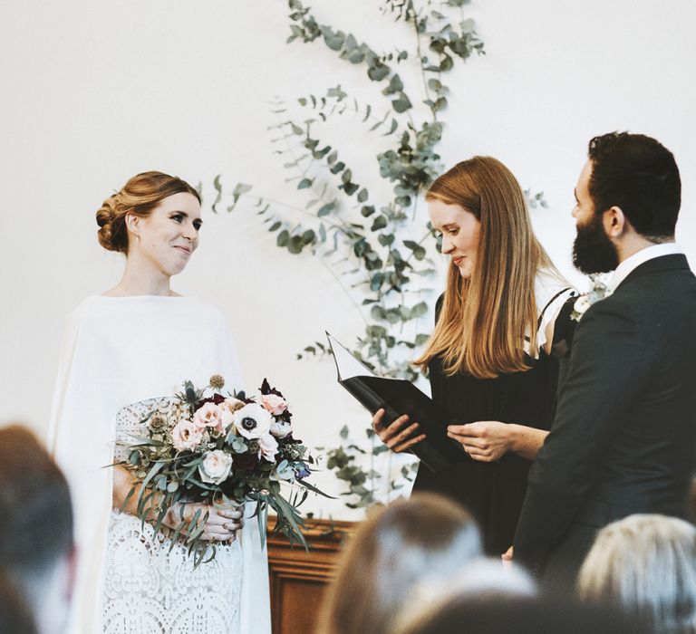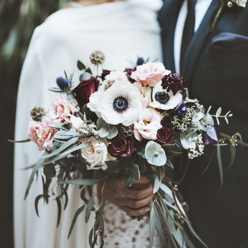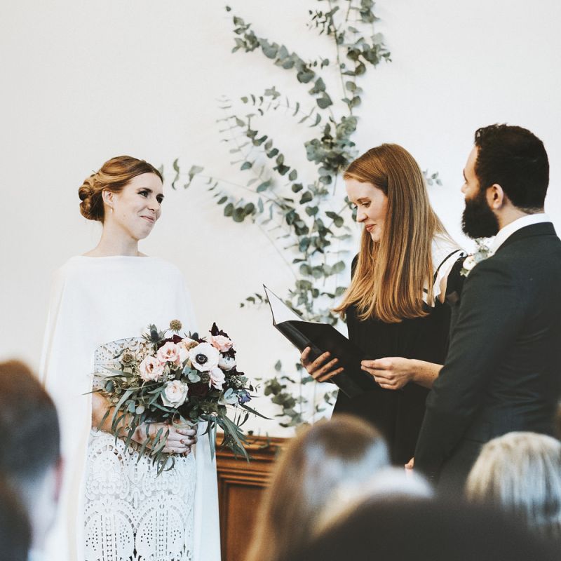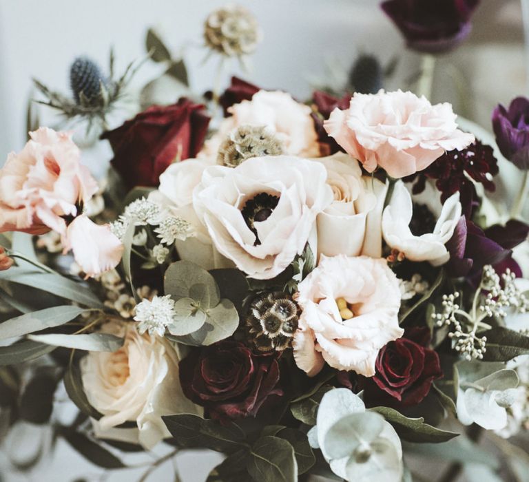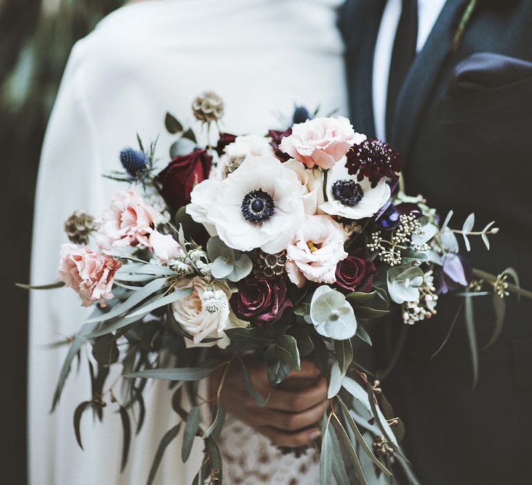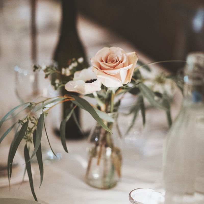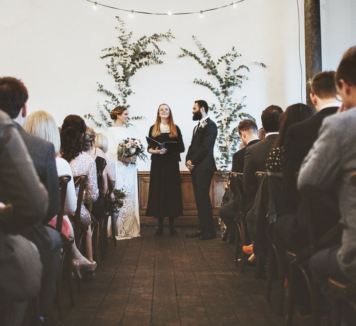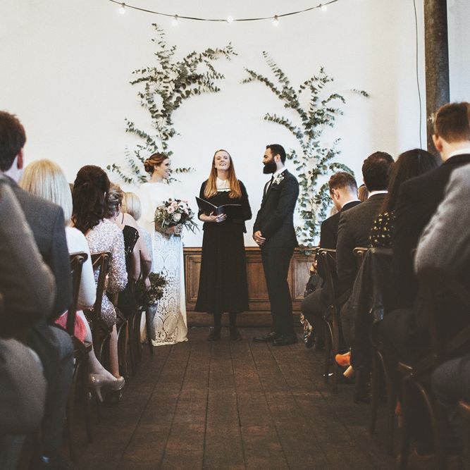 We wanted our day to be cosy, relaxed and super intimate. The venue has so much character that we just went from there. As it was a December wedding, we went for deep jewel colours with a bit of sparkle, and the rest of the styling just fell together from that. We both knew that we wanted lots of greenery and warm lighting. We suggested an asymmetrical arch where we were having our ceremony and Lizzie ran with the idea, creating an incredible eucalyptus arch which really set the scene.