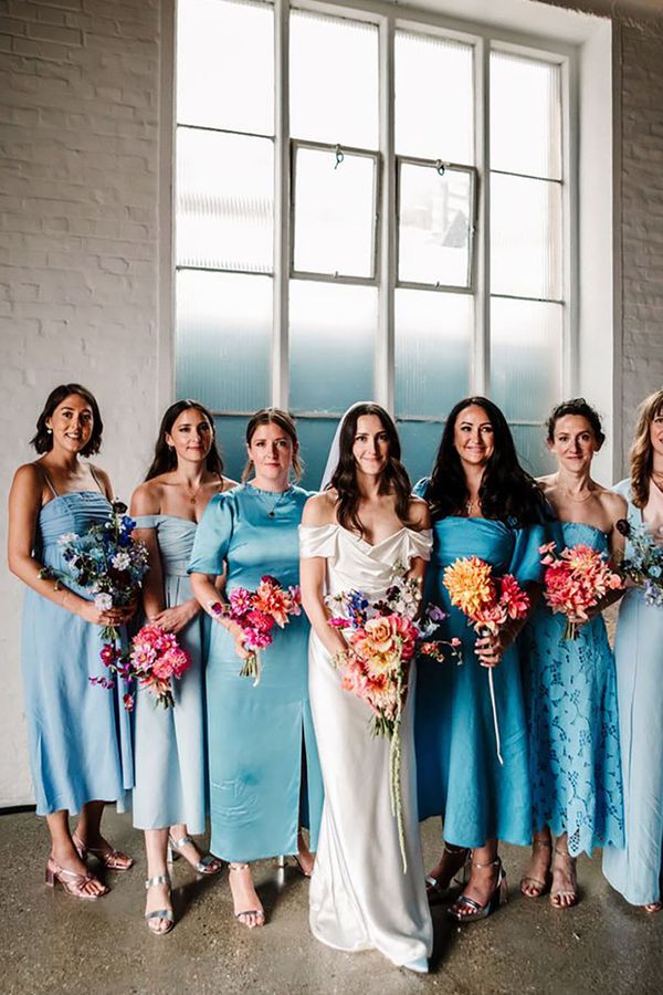 Midi bridesmaid dresses are a completely underrated style! The shorter hemline (which falls just below the knees) can elongate the legs when paired with some gorgeous heels. Plus, midi dresses are more casual than floor-length gowns that are more traditionally chosen for bridesmaids. We’ve rounded up some of our favourite styles from real weddings in a variety of colours, patterns and styles!