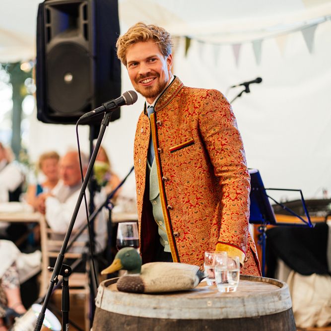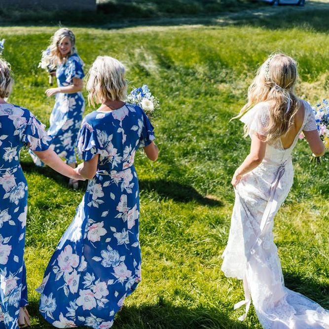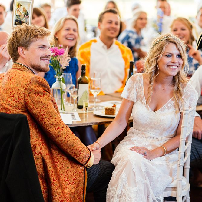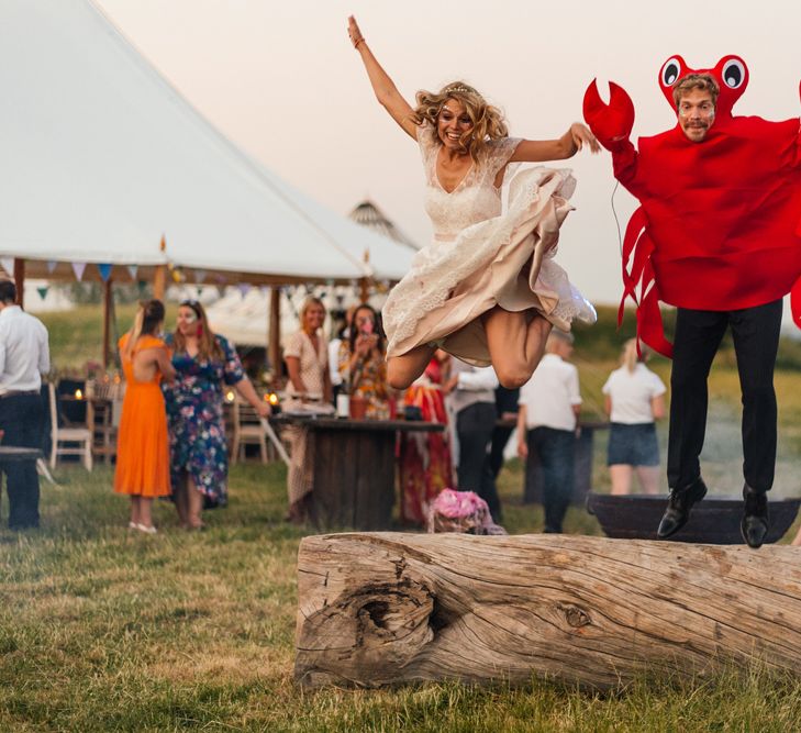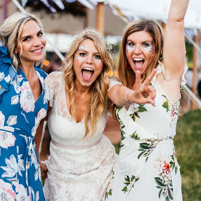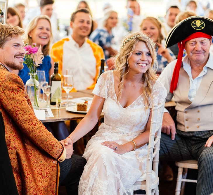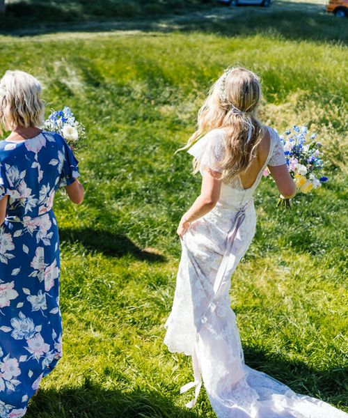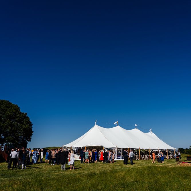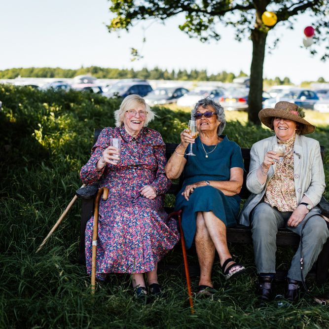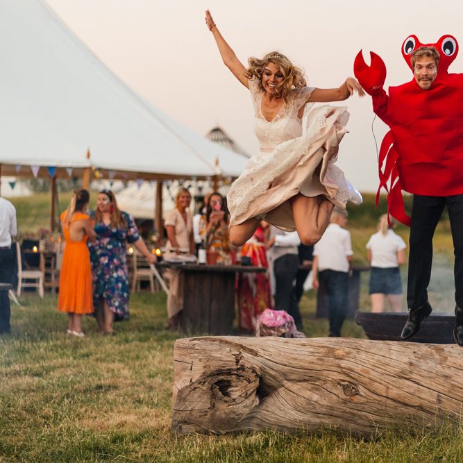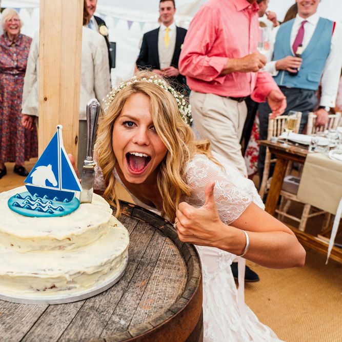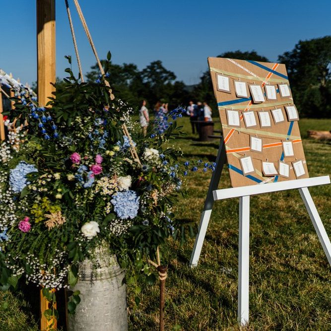 Our wedding planning started with a doodle of a little horse in a boat. Alex's family love sailing and the sea, and Lottie grew up at Berriewood, a riding stables in landlocked Shropshire! As well as being good procrastination this picture illustrated the coming together of our two worlds, and that turned into our little emblem! To continue the boat theme we would describe the vibe as “flotsam and jetsam” because we floated all of our ideas out there to consider… and then just decided to keep them all instead of having a specific theme. So it was a big old mix of horses, boats, fancy dress, wildflowers, delicious food, loads of booze, great music, glitter and a pair of shot skis for good measure!