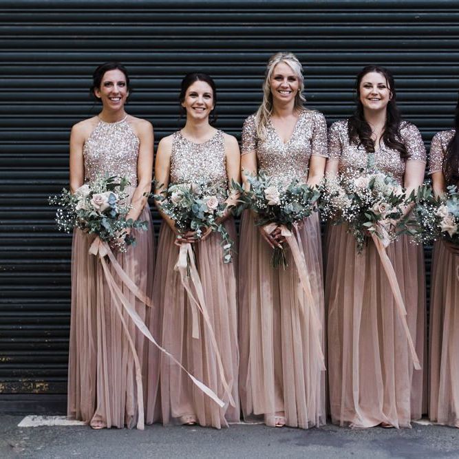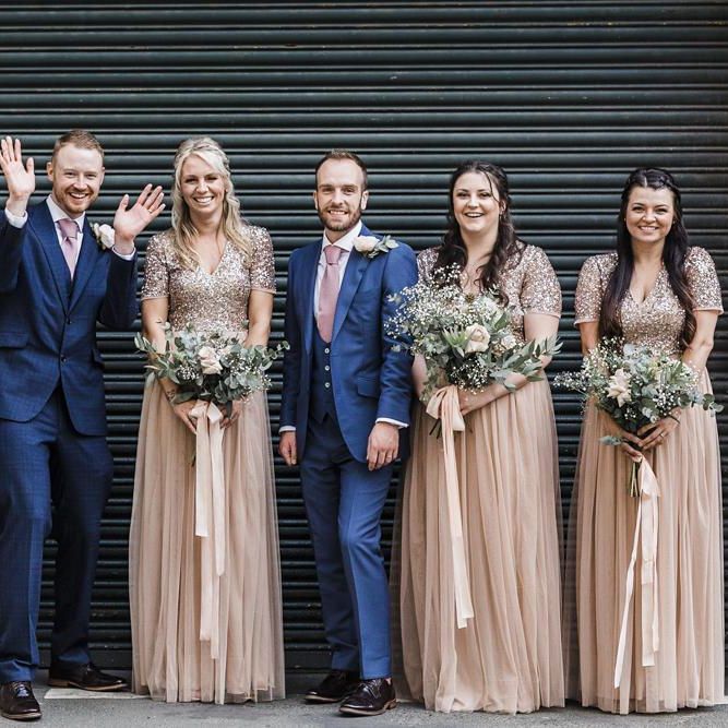 Same-Sex Industrial Wedding with Grooms Maids in Sequin and Tulle Maya Bridesmaid Dresses