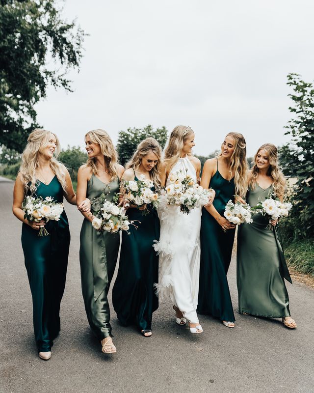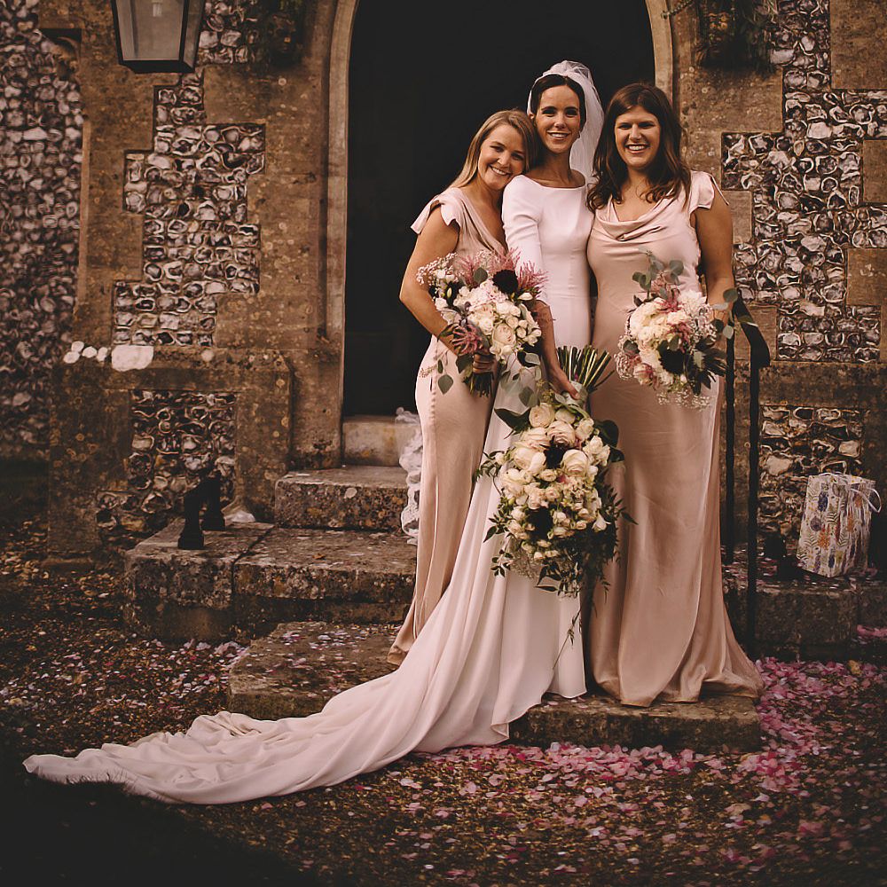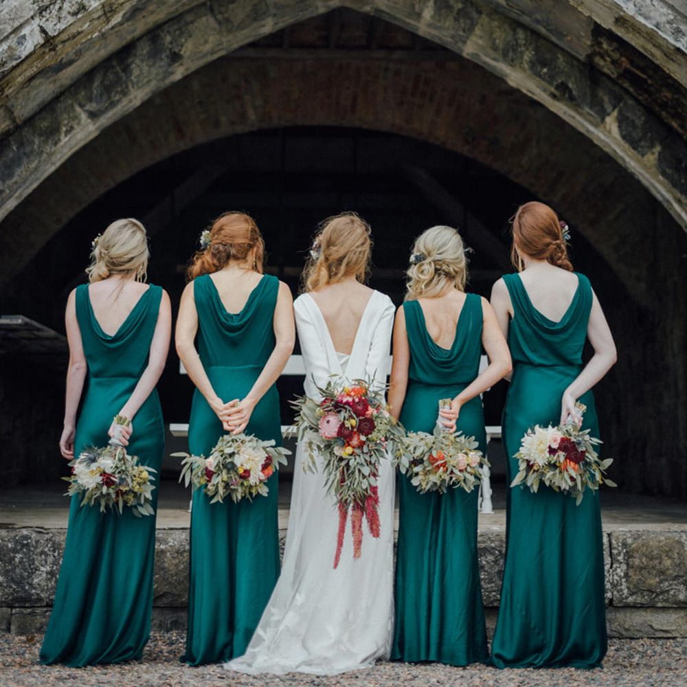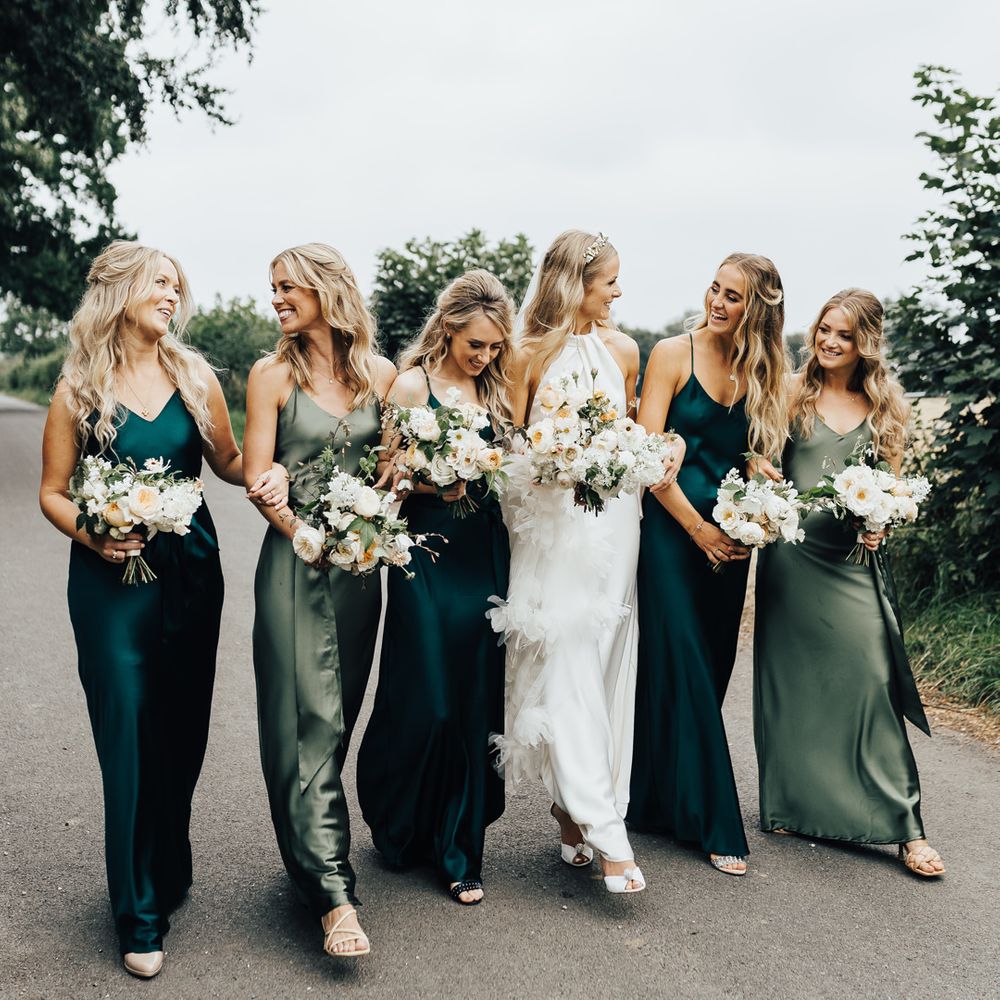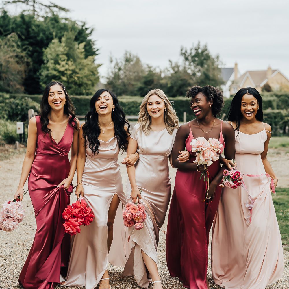 Satin is a type of fabric that typically has a shiny front and matte back, woven with silk, polyester and nylon to give it its luxurious appearance. There are many different types of satin, including slipper satin, duchess satin, charmeuse and more. Each one formed to bring us different satin bridesmaid dress designs including, slinky slips and heavy ball gowns.