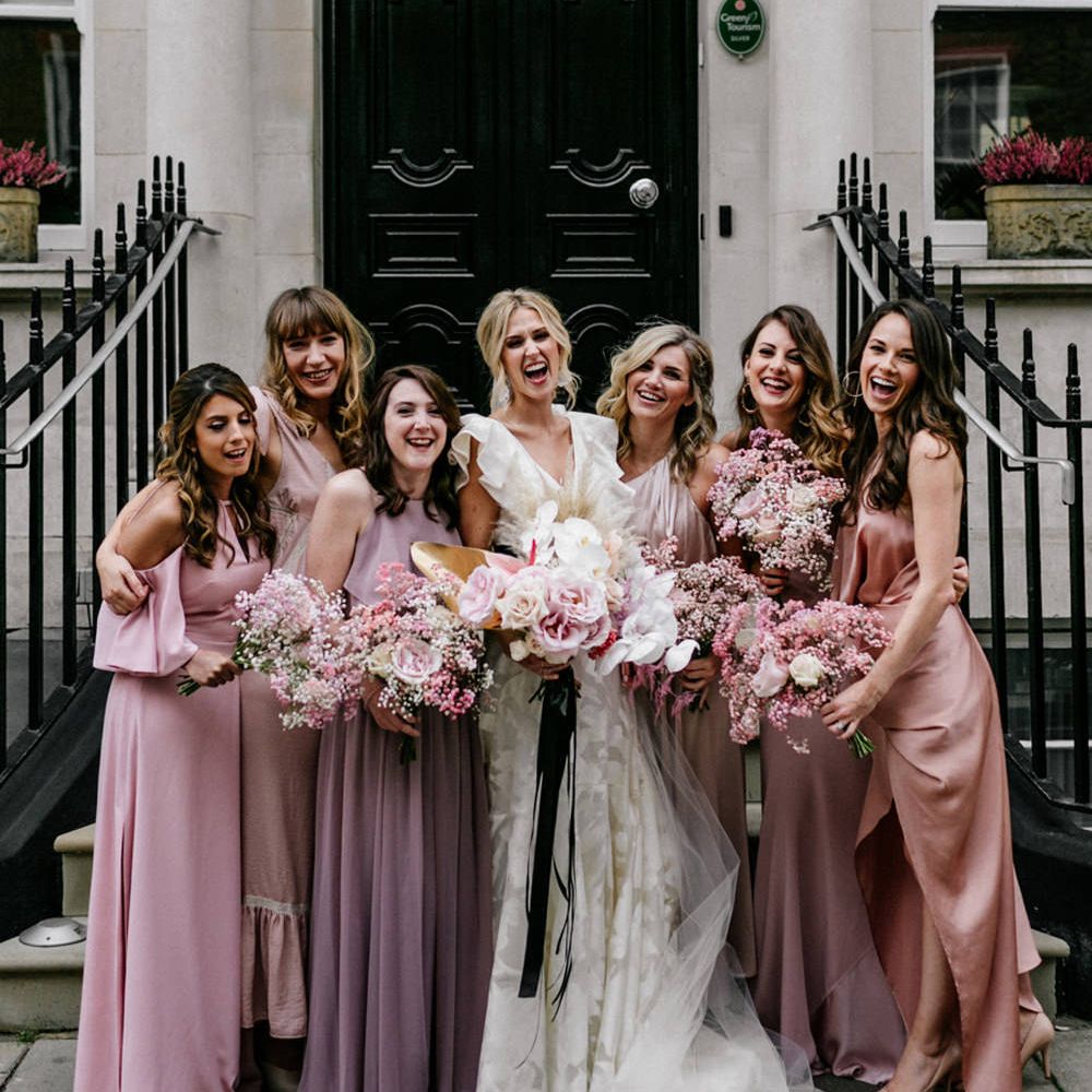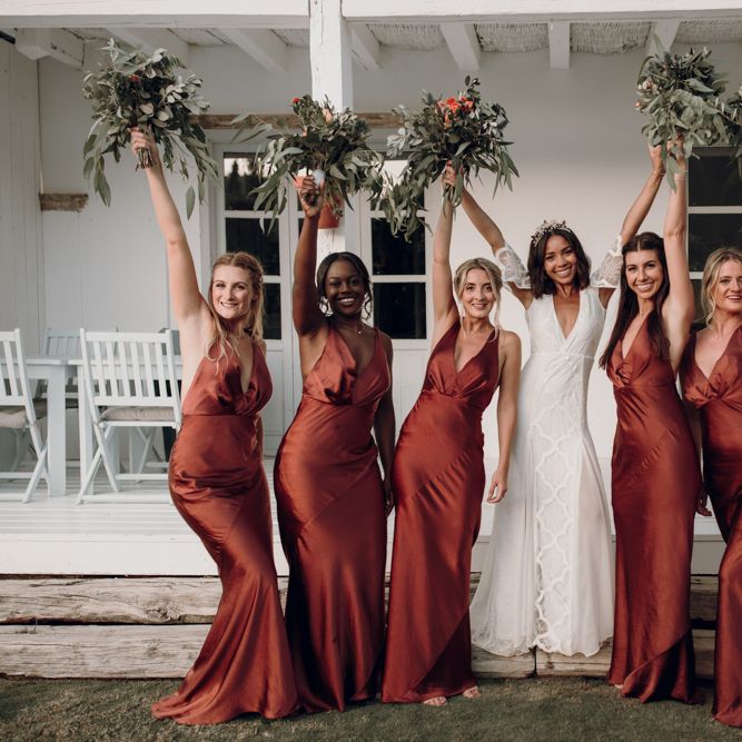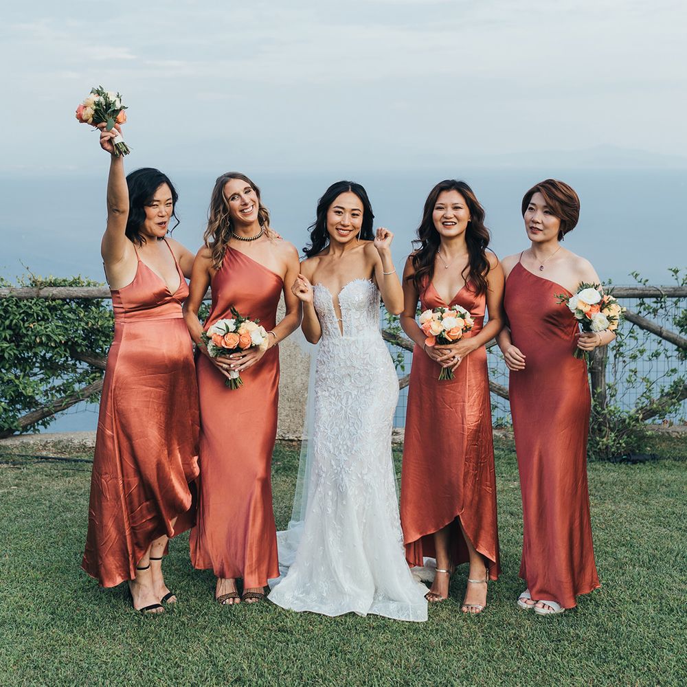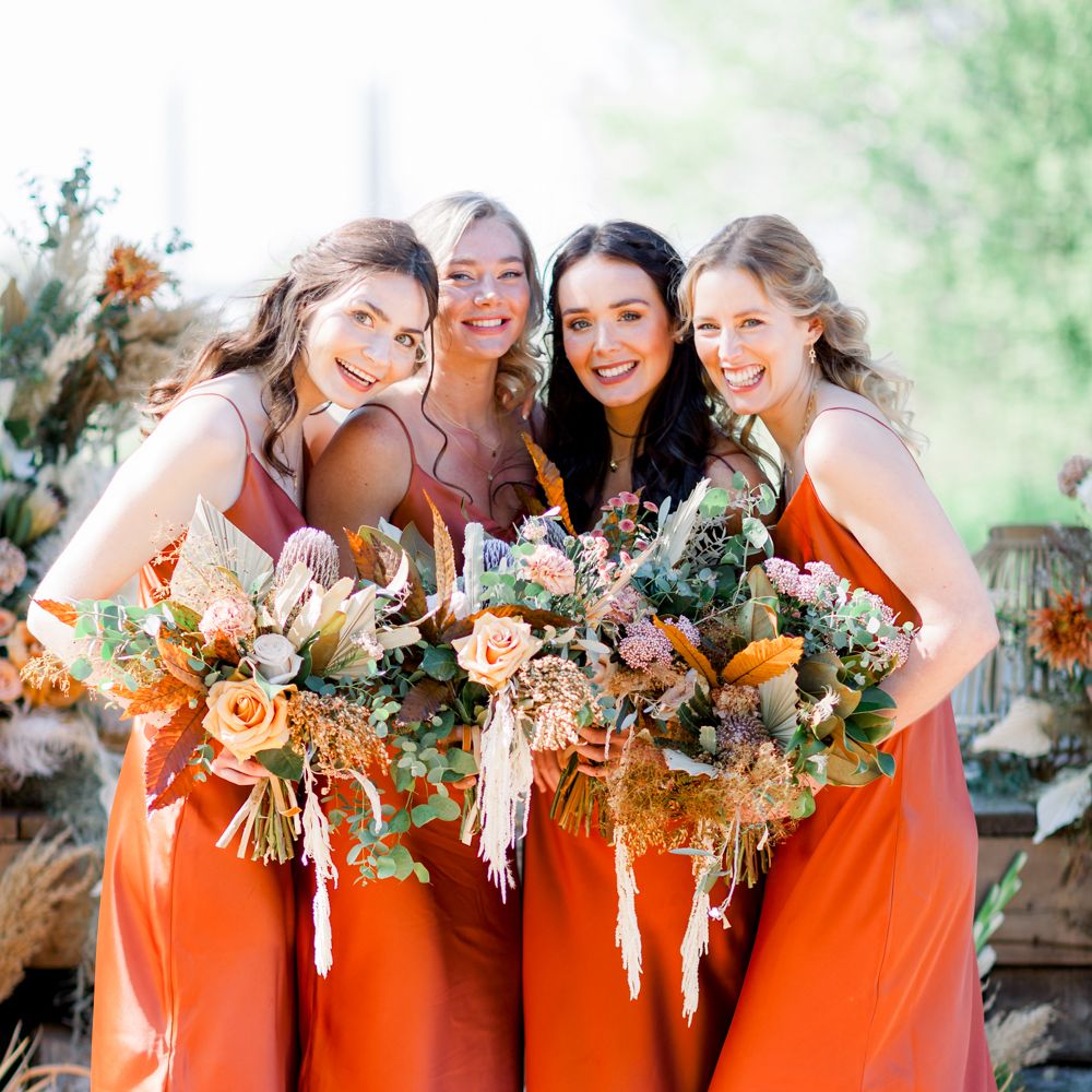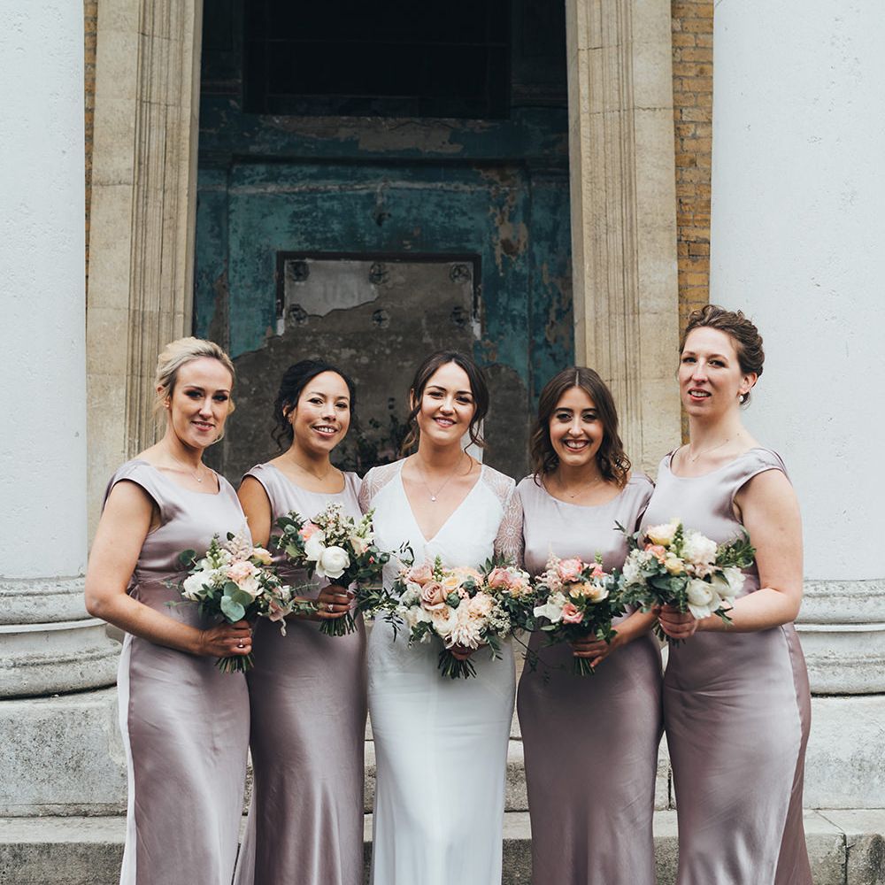 Satin is a type of fabric that typically has a shiny front and matte back, woven with silk, polyester and nylon to give it its luxurious appearance. There are many different types of satin, including slipper satin, duchess satin, charmeuse and more. Each one formed to bring us different satin bridesmaid dress designs including, slinky slips and heavy ball gowns.