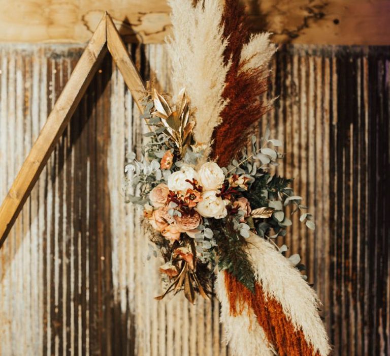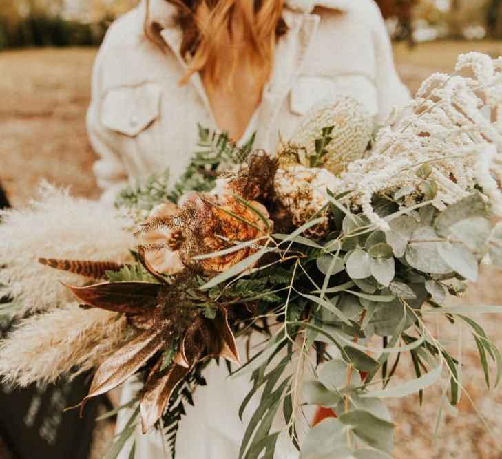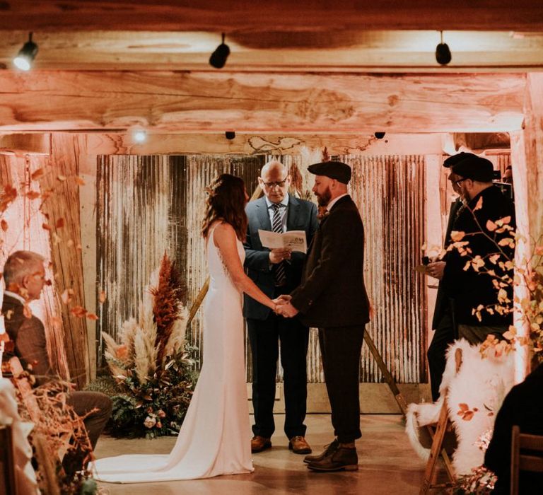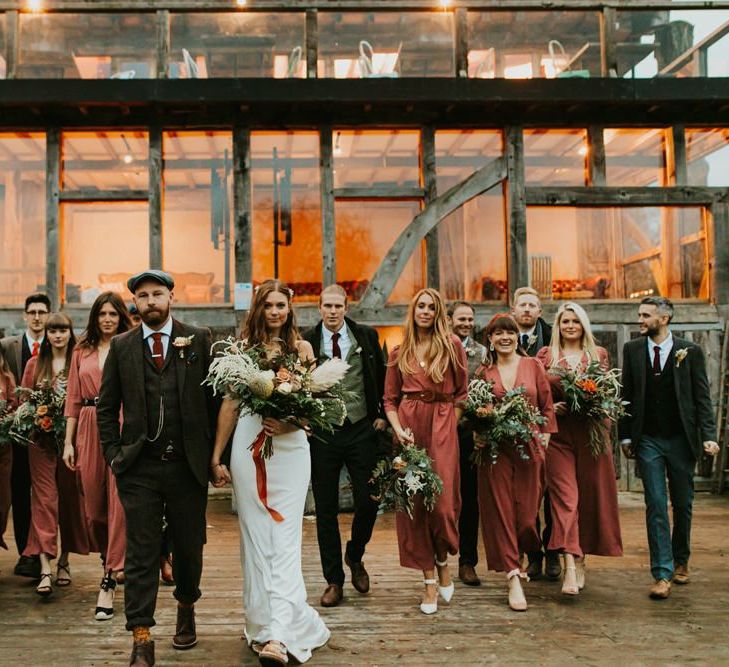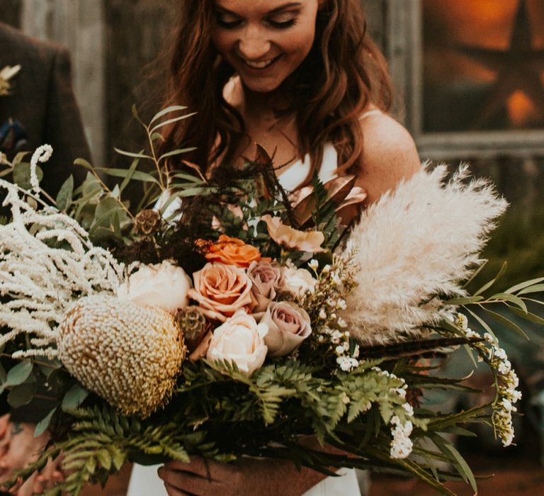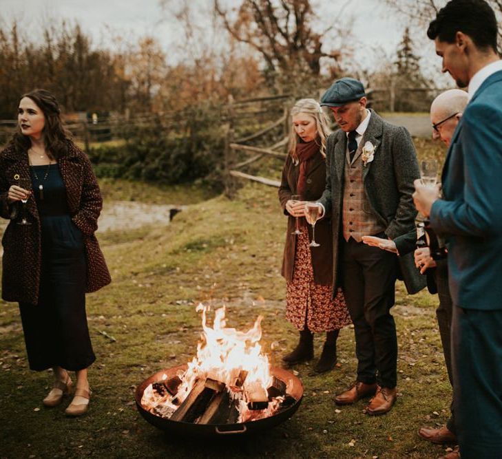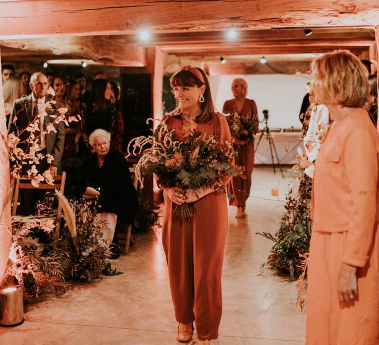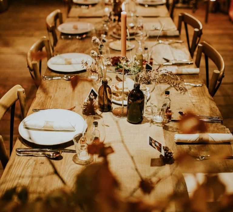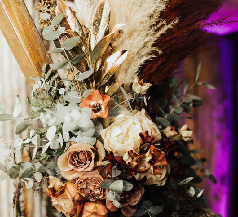Autmnal boho vibes. Tom and I love the travelling boho vibes, we live in a van and travel around and we wanted that style in our wedding. We also love autumn, being a red head and Tom with his red beard the autumn colours are very much in a our pallet. This was brought in through the flowers, the forest veneu, Hoedown, up lit our whole venue with warm orange lights, there was a big open fire in the ceremony. One of our memoires from the ceremony is just this warm hugh over everything it was stunning.