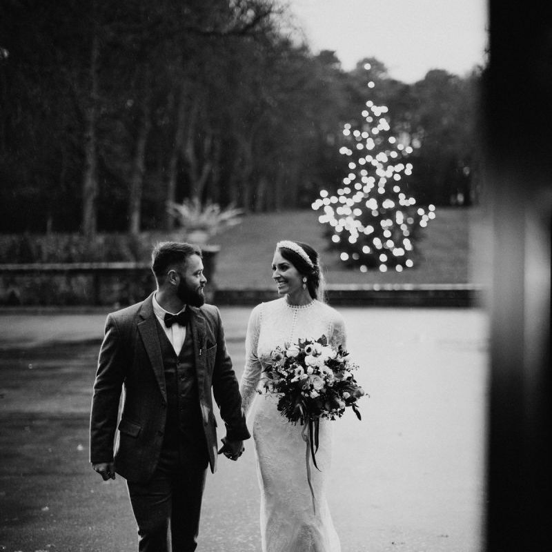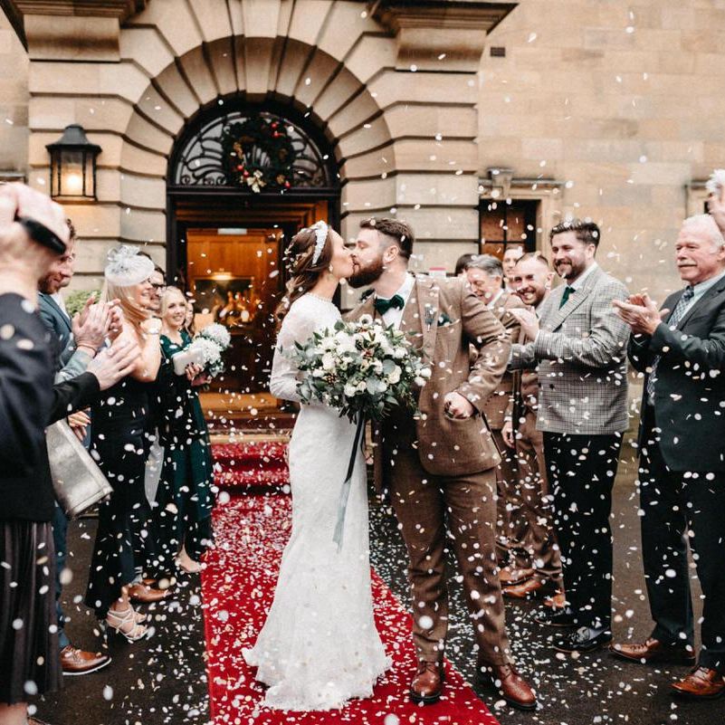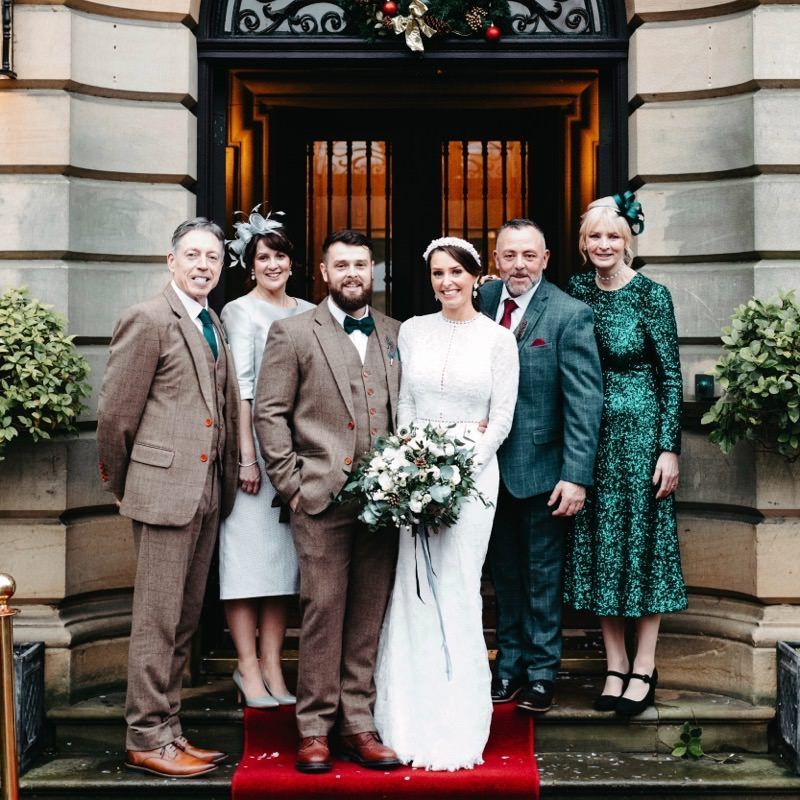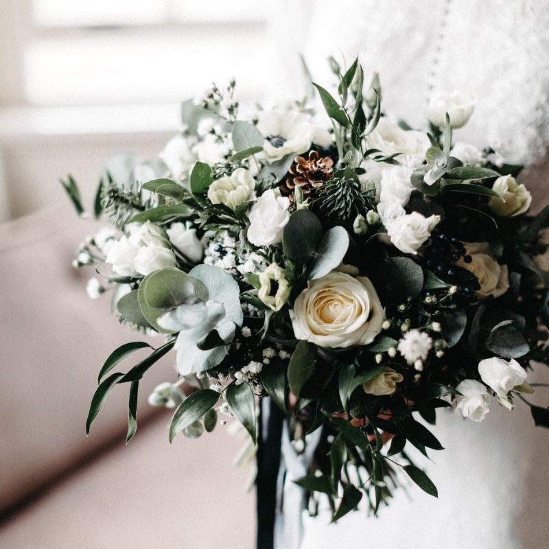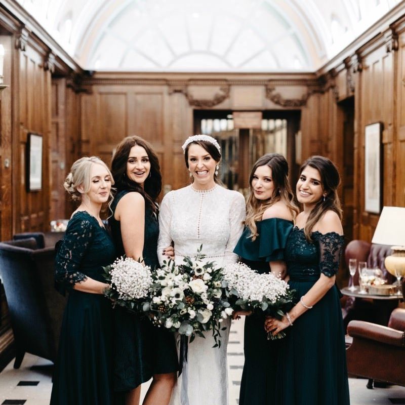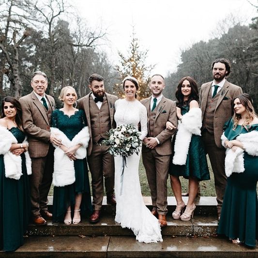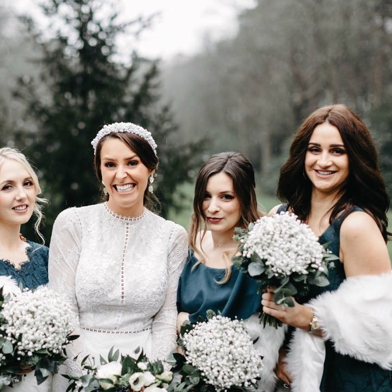 Classic, vintage, with a hint of rock n roll! After meeting in the French Alps, we wanted a Winter wedding to be as close to ski/snow vibes as possible. We both love Christmas and thought this was the perfect time of year to get married, and this set the basis for our styling. We went for whites & Christmas greens for bridesmaid dresses and groomsmen ties/pocket squares and for the flowers - my bouquet was all white and greens with anemones with black centres for the hint of rock n roll, I also had black nails with glitter (since it was Christmas time!)