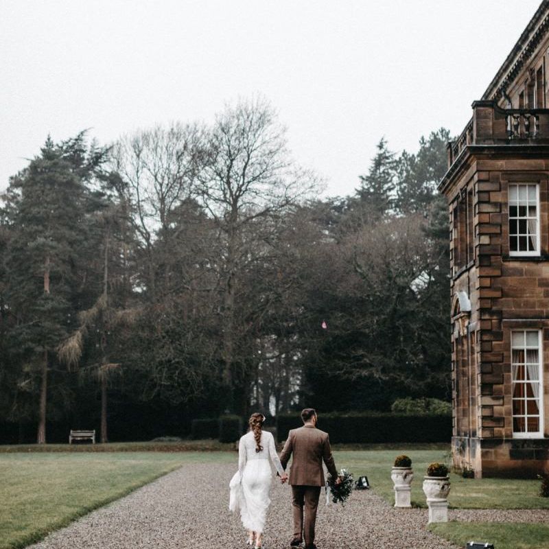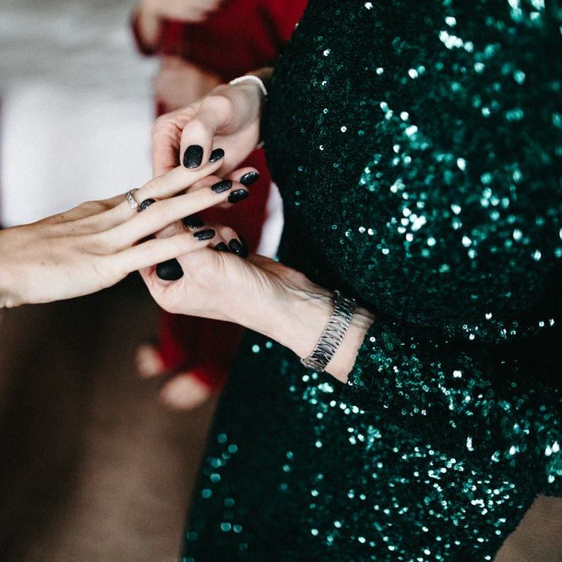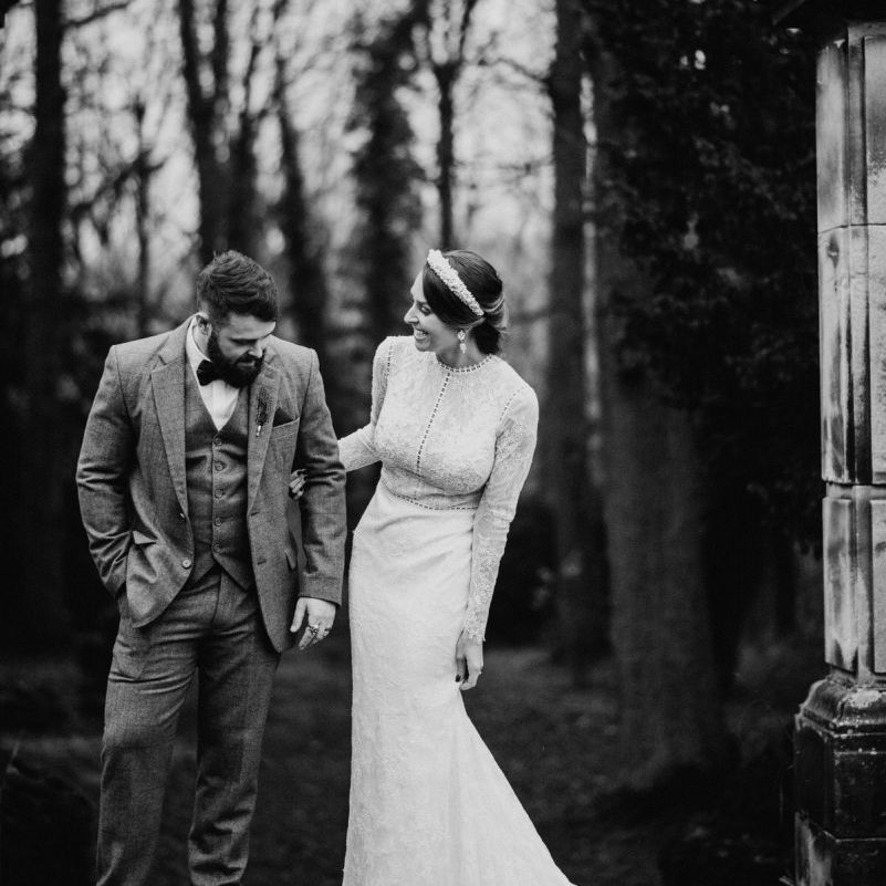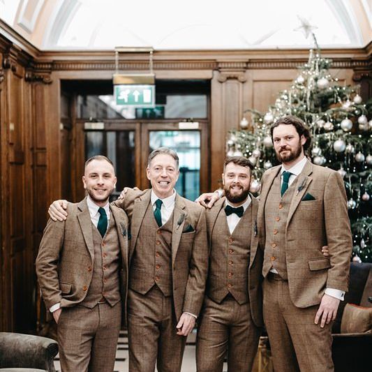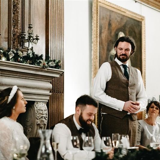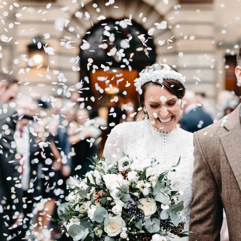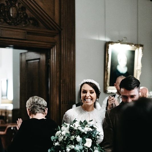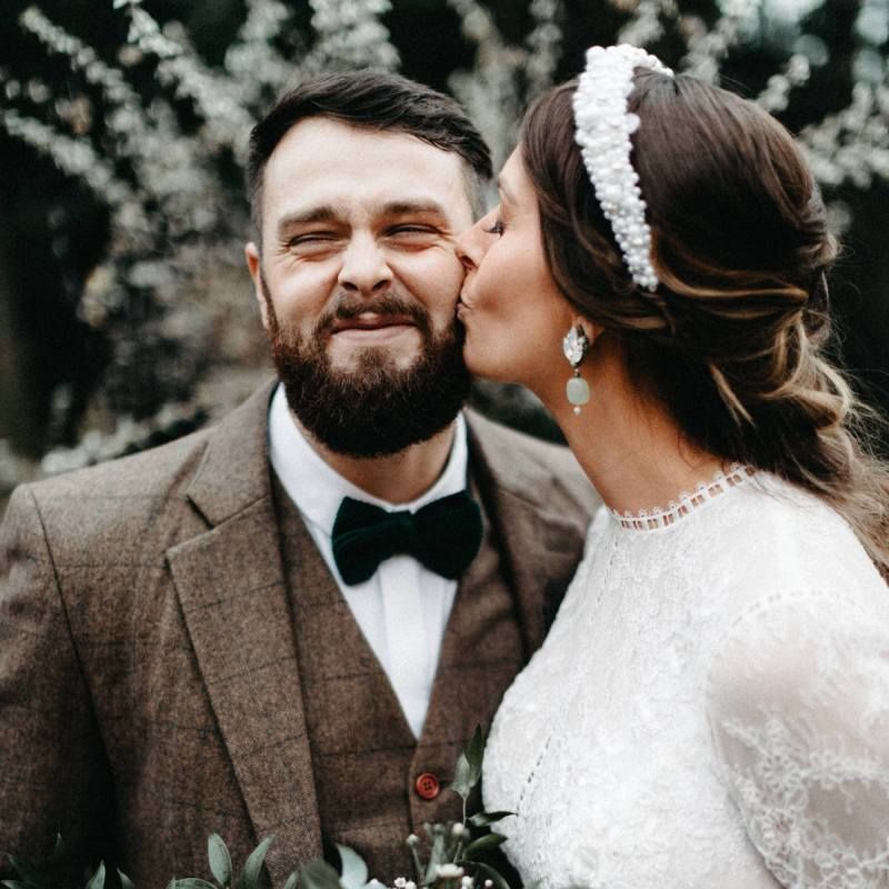 Classic, vintage, with a hint of rock n roll! After meeting in the French Alps, we wanted a Winter wedding to be as close to ski/snow vibes as possible. We both love Christmas and thought this was the perfect time of year to get married, and this set the basis for our styling. We went for whites & Christmas greens for bridesmaid dresses and groomsmen ties/pocket squares and for the flowers - my bouquet was all white and greens with anemones with black centres for the hint of rock n roll, I also had black nails with glitter (since it was Christmas time!)