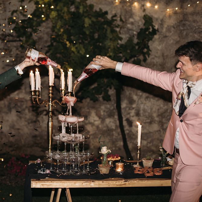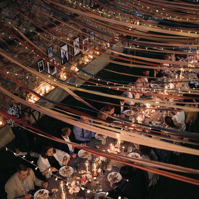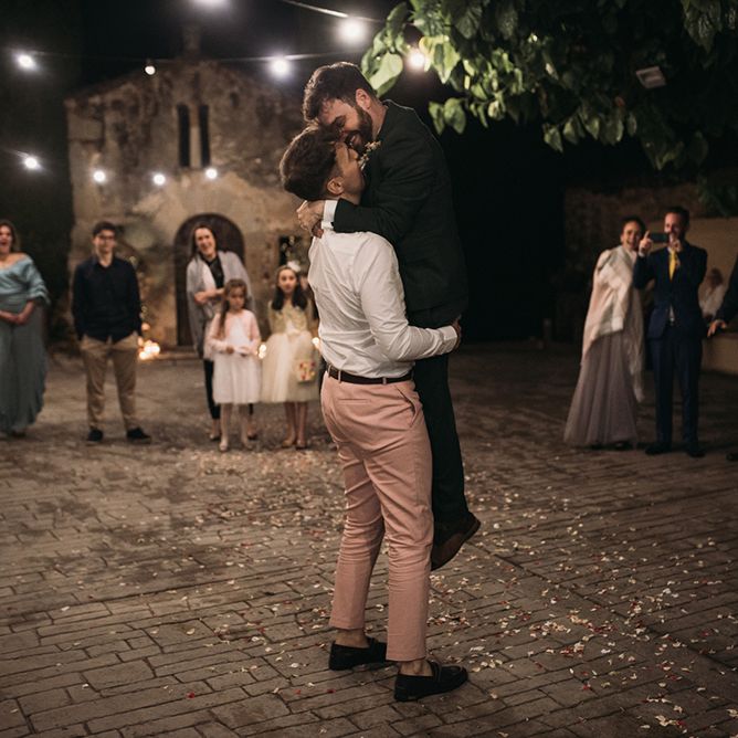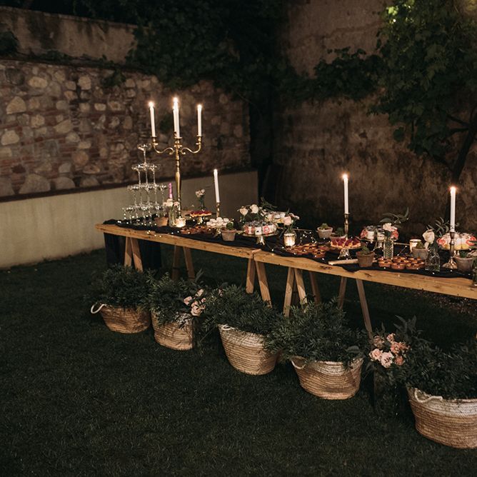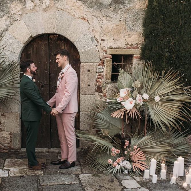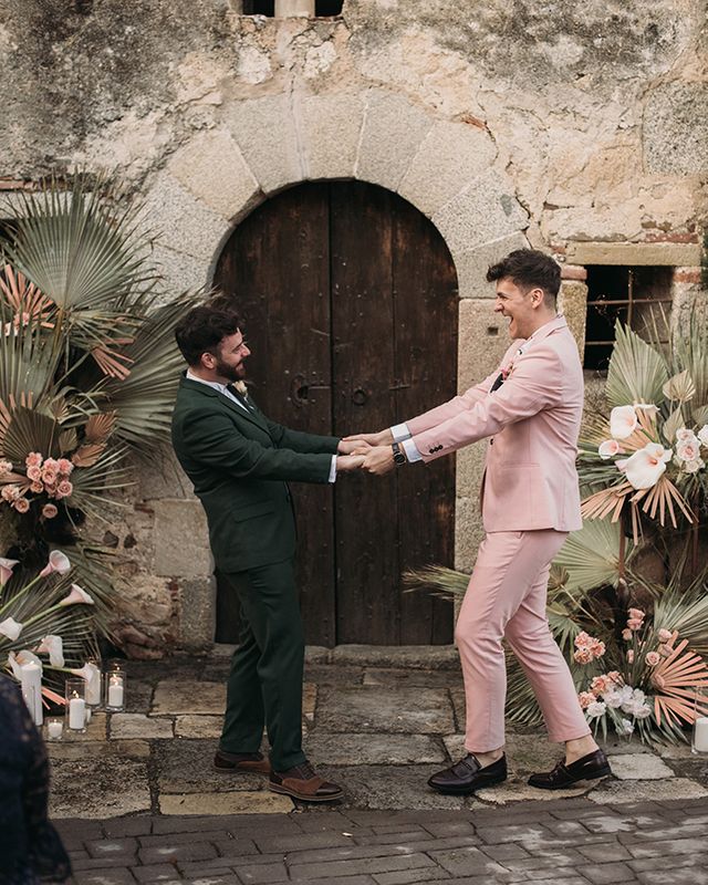 We was inspired by the surrounding architecture and nature. The colour palette was inspired by makeup and beauty beacause Imanol is makeup artist and stylist. Miquel is emotional and wanted lots of candles and live music like in a Tuscan wedding.