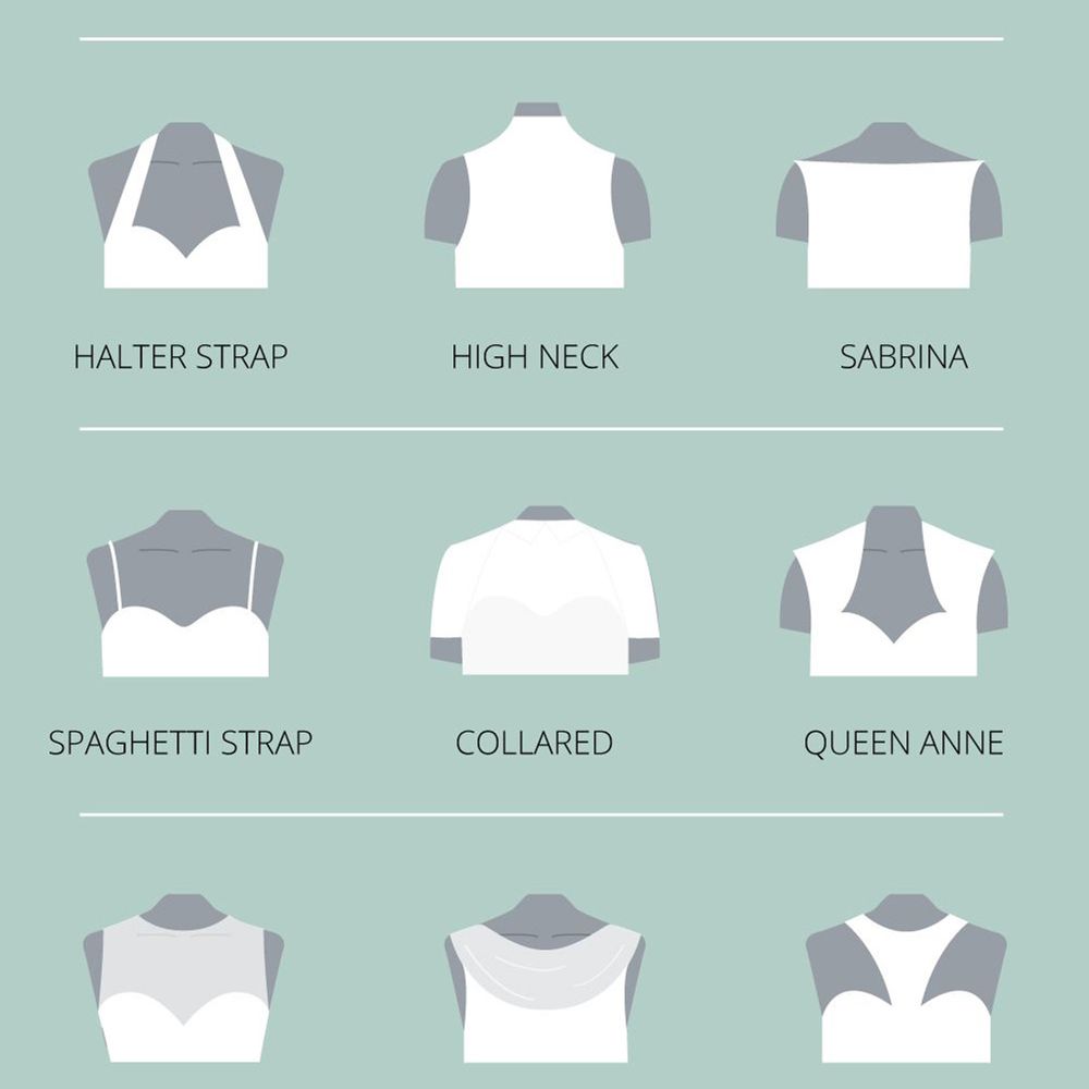 guide to all the different styles of wedding dress necklines, including sweetheart, halter, etc