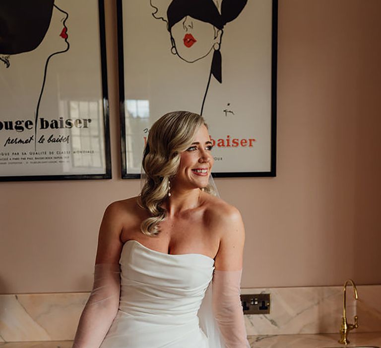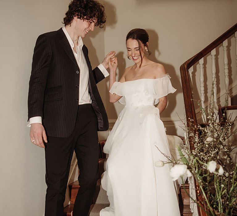 bride coming down the stairs with groom while wearing off-shoulder maxi wedding dress