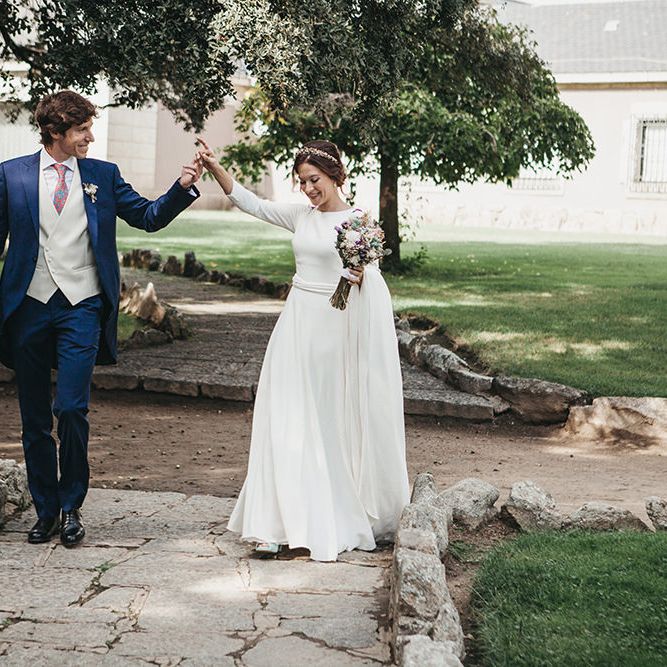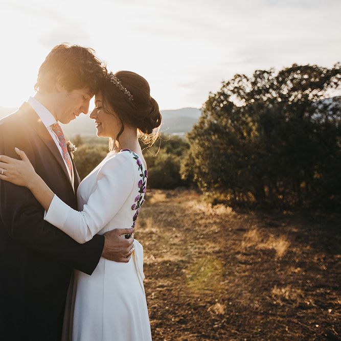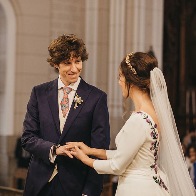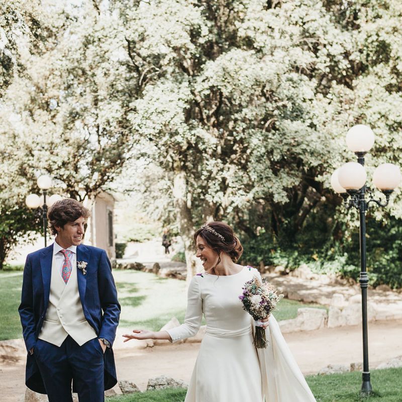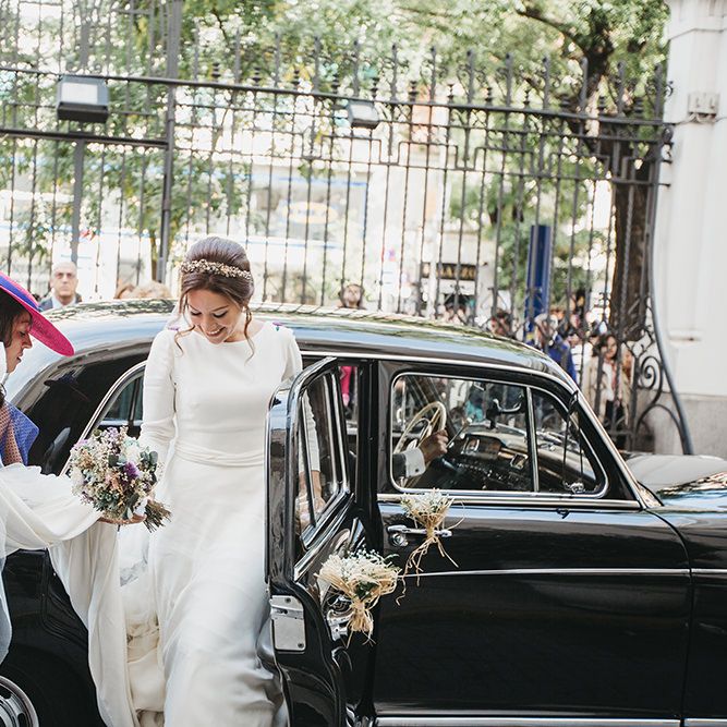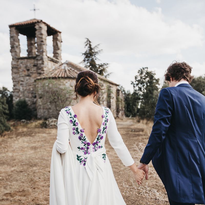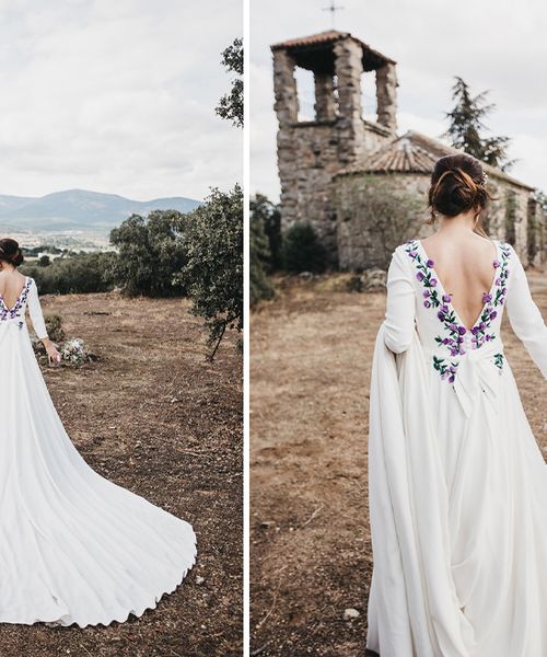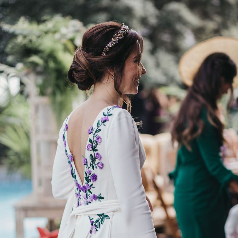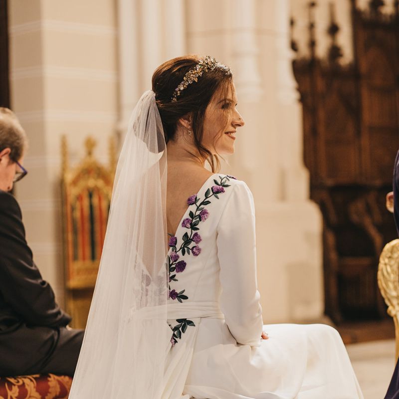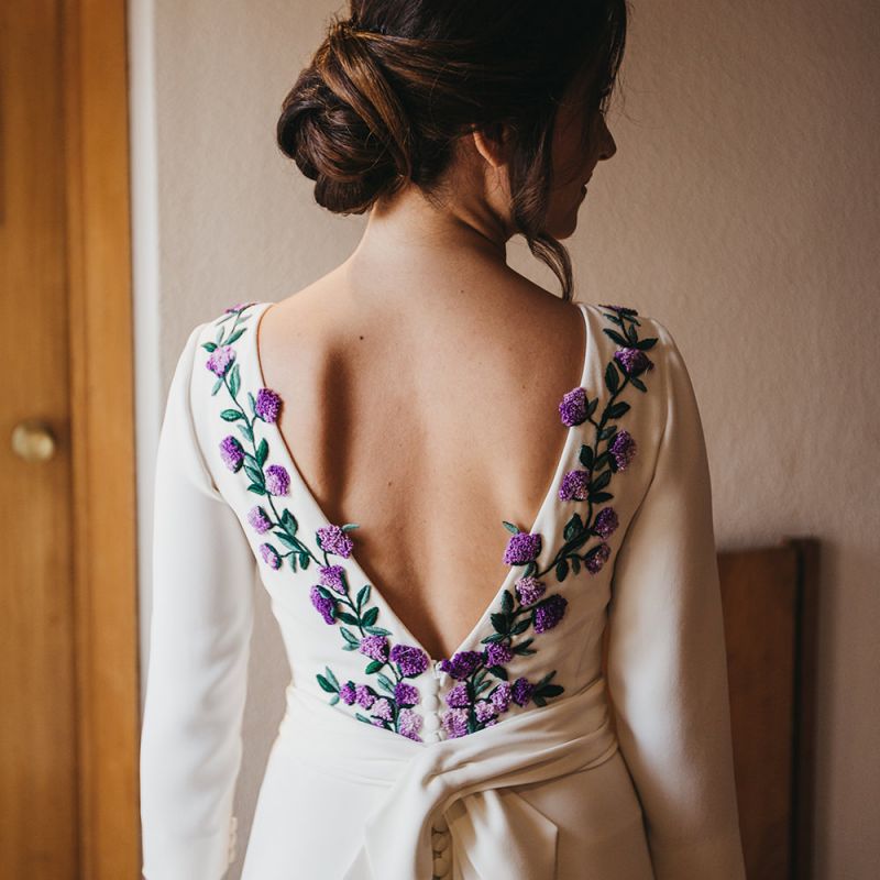 First time I went to Navascues I was fascinated, they were so nice with me and the service was perfect! Their advice, their fabrics, and the embroideries they show me were the key to making such an important decision. I knew what I wanted and I knew that was the place to do it. Since then, the fittings and seeing how the dress was designed … was a dream! The dress was made in a white Crepe Georgette, with a French sleeve, and a V-neckline, surrounded by embroidery with a French knot of violet flowers and green leaves.