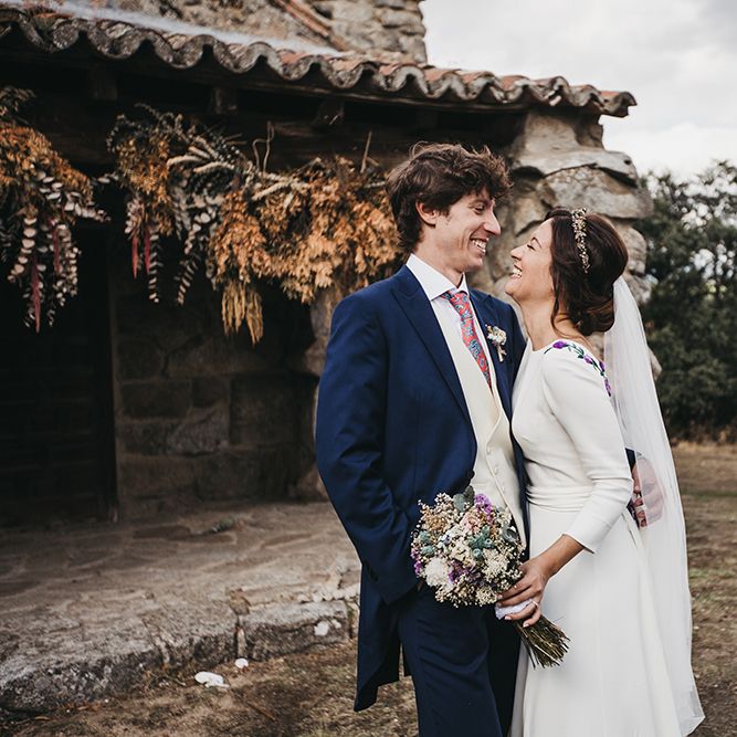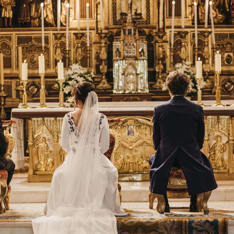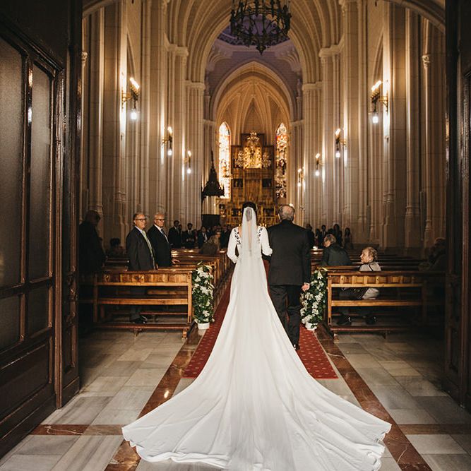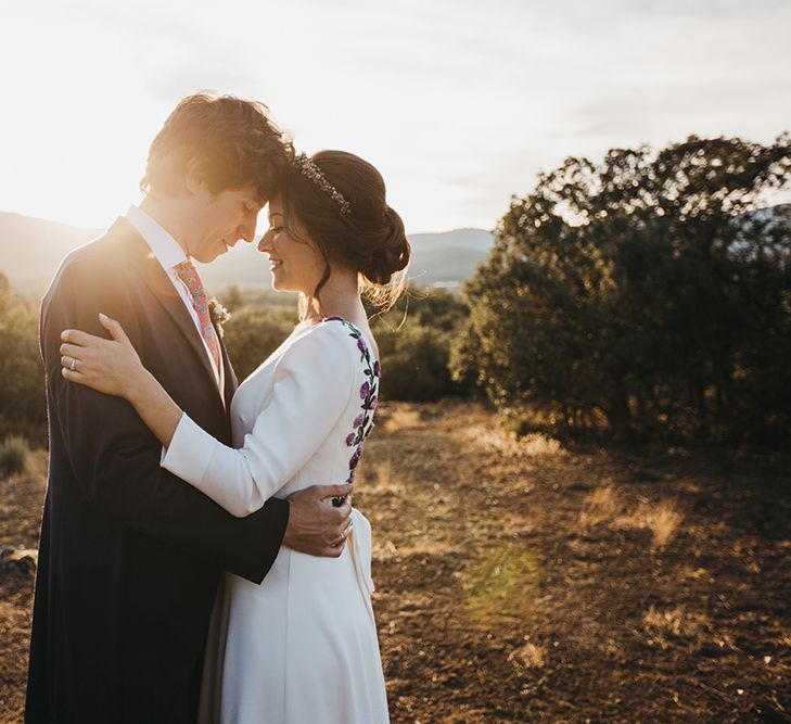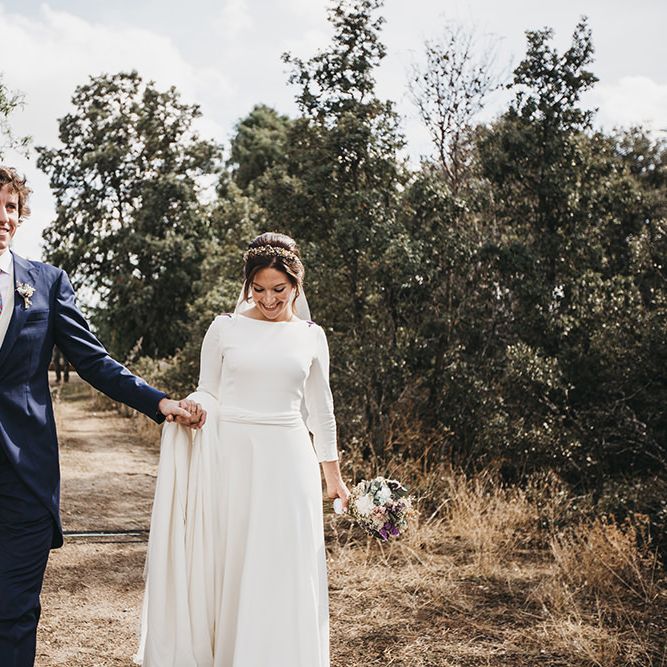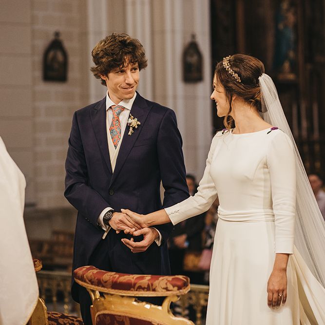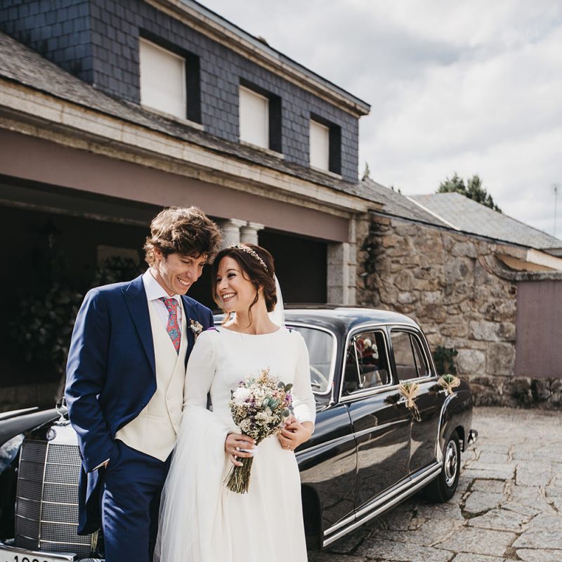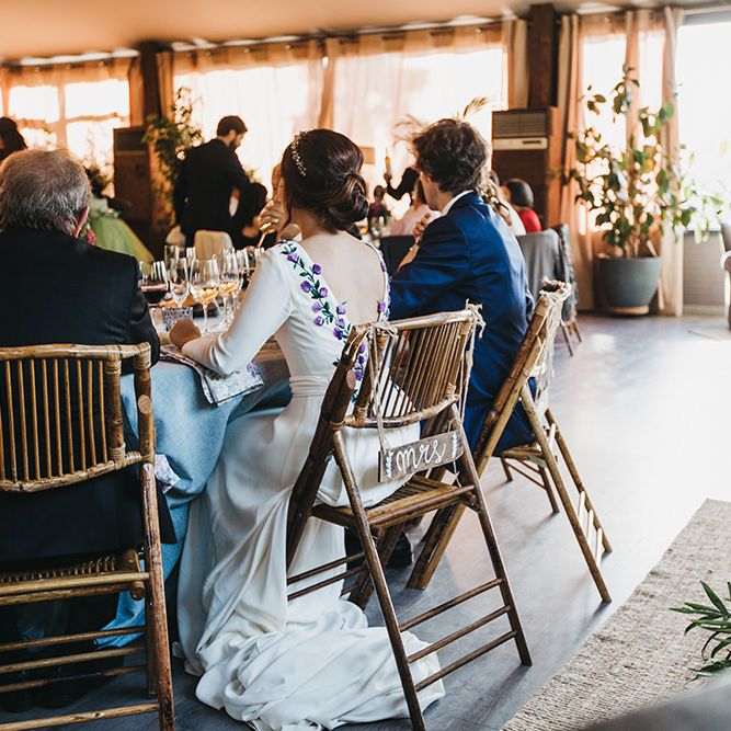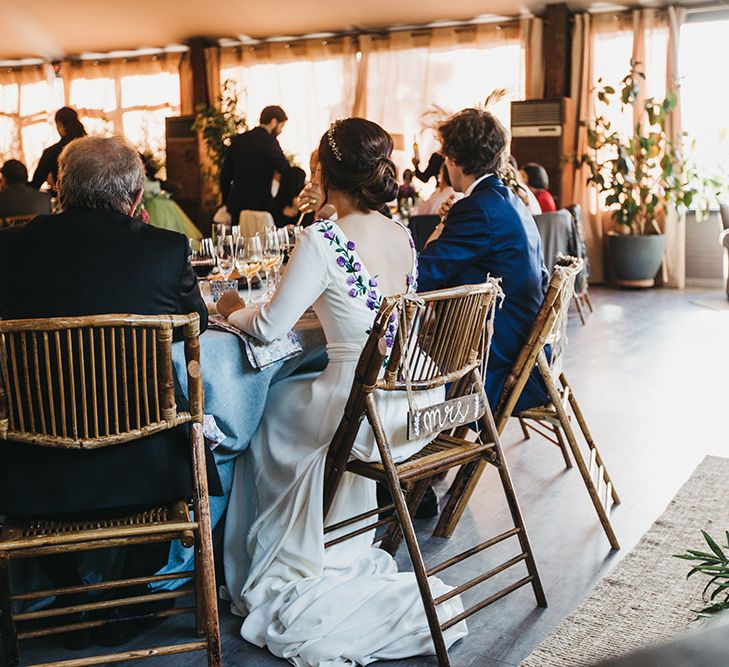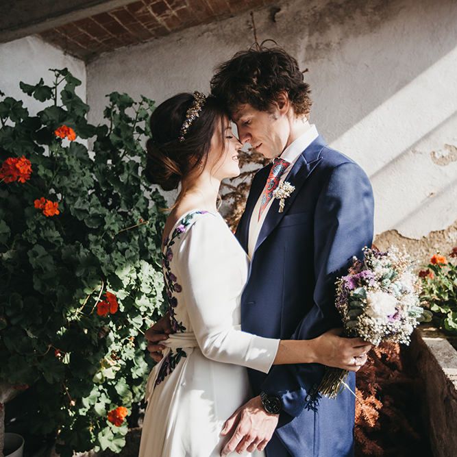 First time I went to Navascues I was fascinated, they were so nice with me and the service was perfect! Their advice, their fabrics, and the embroideries they show me were the key to making such an important decision. I knew what I wanted and I knew that was the place to do it. Since then, the fittings and seeing how the dress was designed … was a dream! The dress was made in a white Crepe Georgette, with a French sleeve, and a V-neckline, surrounded by embroidery with a French knot of violet flowers and green leaves.