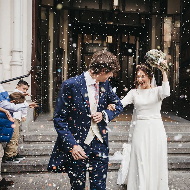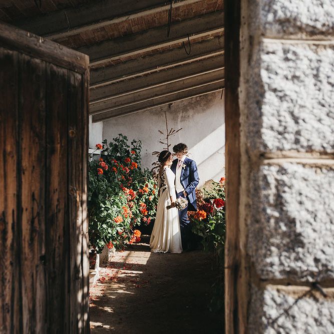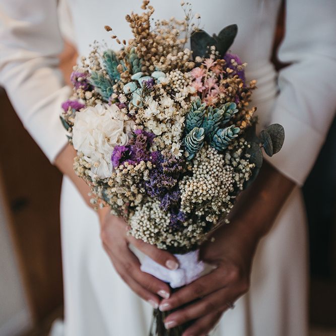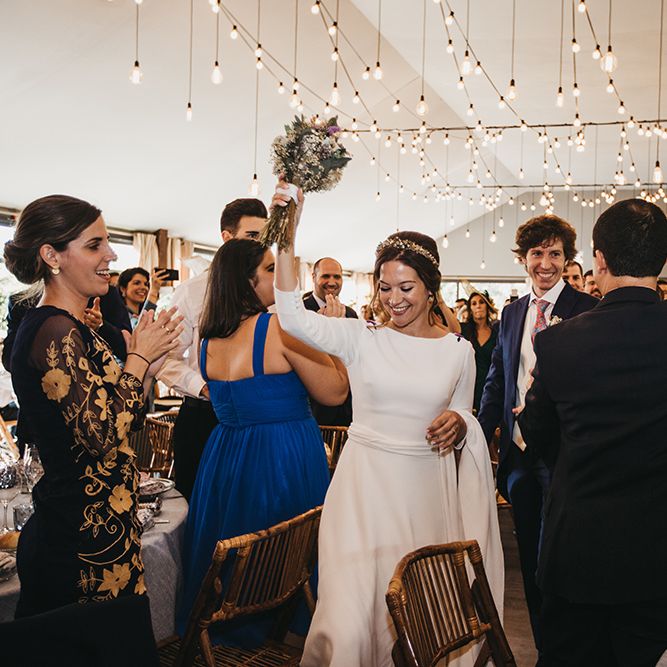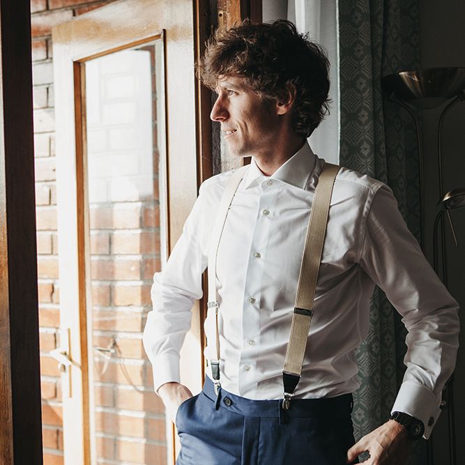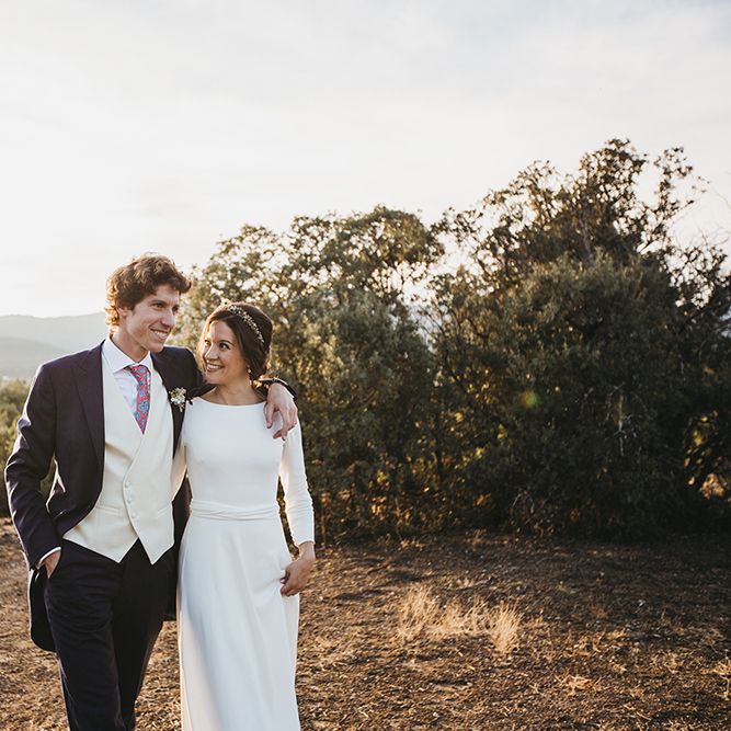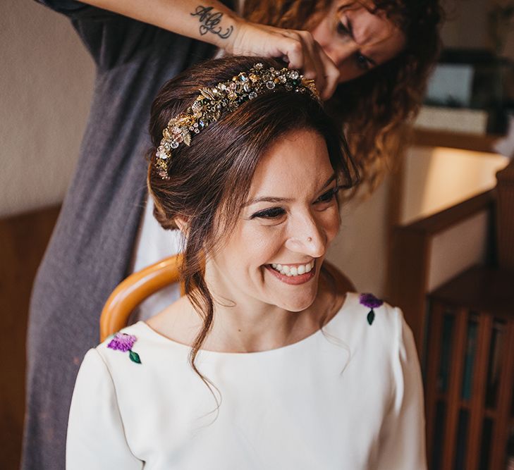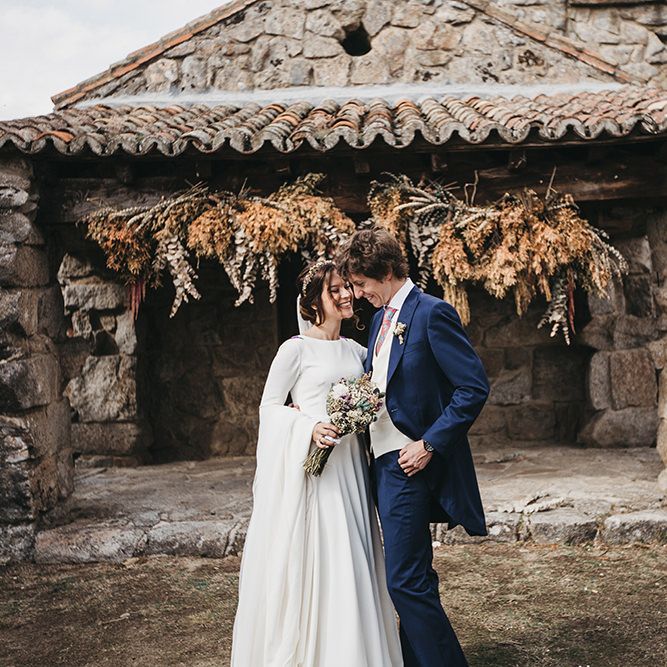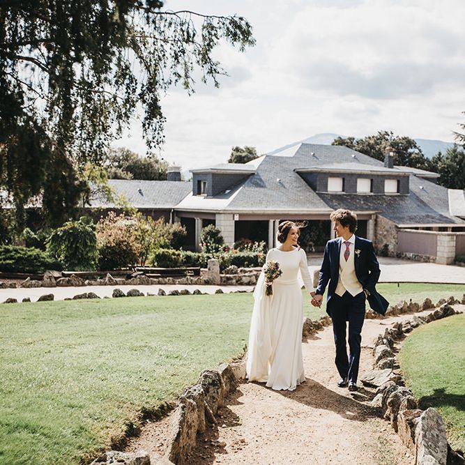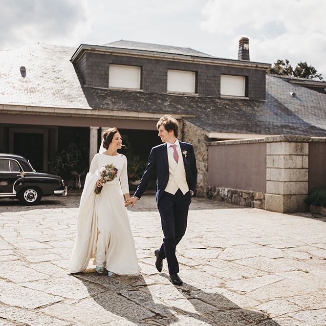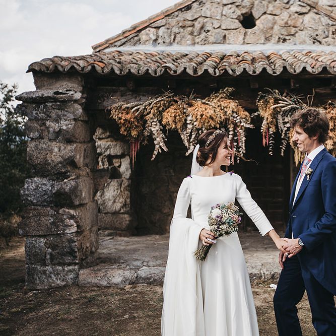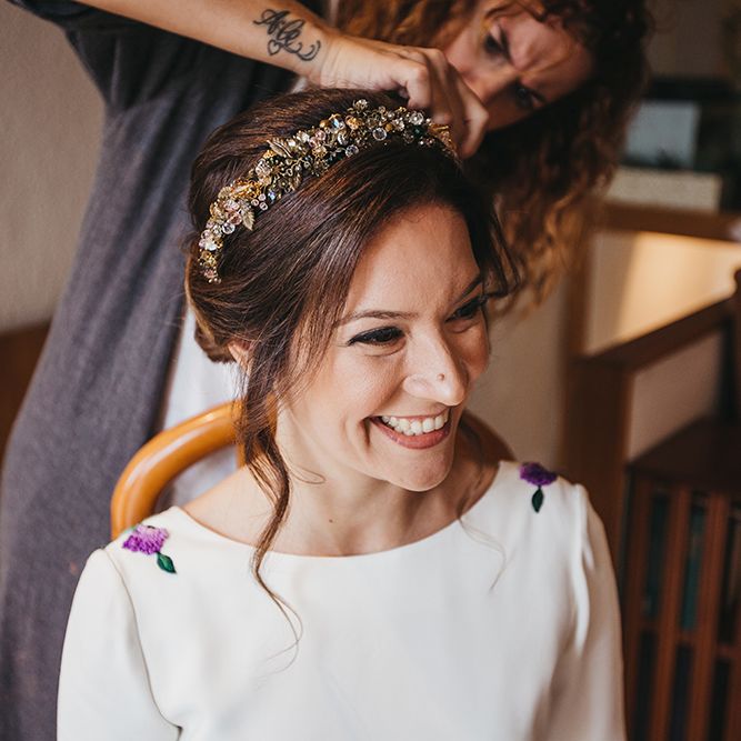 First time I went to Navascues I was fascinated, they were so nice with me and the service was perfect! Their advice, their fabrics, and the embroideries they show me were the key to making such an important decision. I knew what I wanted and I knew that was the place to do it. Since then, the fittings and seeing how the dress was designed … was a dream! The dress was made in a white Crepe Georgette, with a French sleeve, and a V-neckline, surrounded by embroidery with a French knot of violet flowers and green leaves.