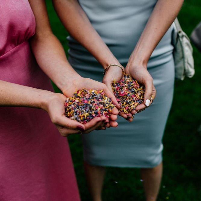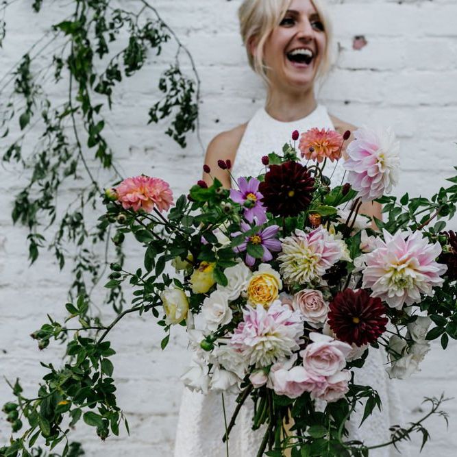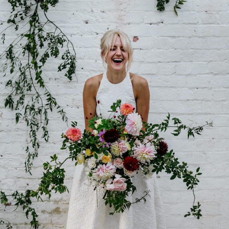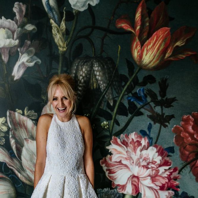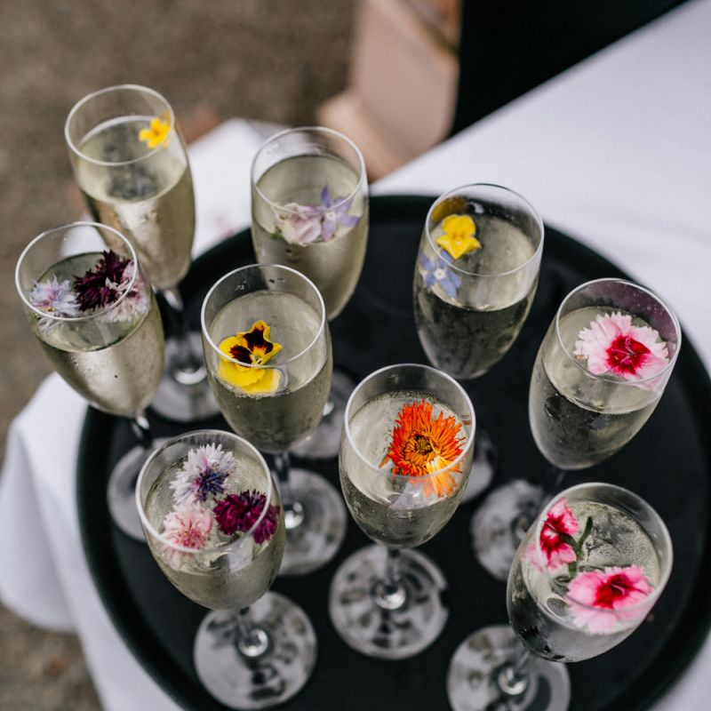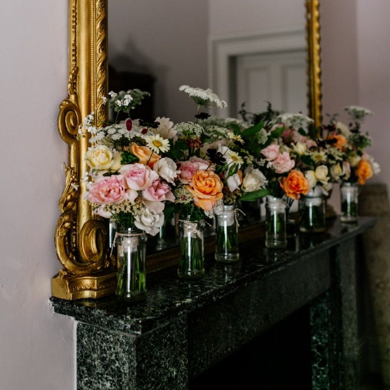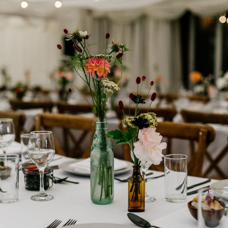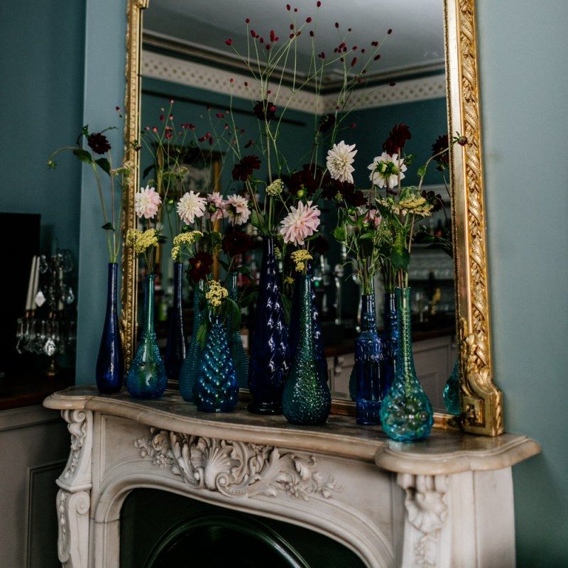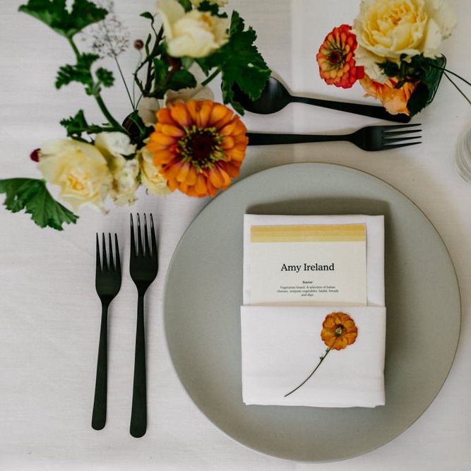 We both have exactly the same taste, which always comes back to a modernist aesthetic, so that influenced the table styling which we wanted to feel clean and modern. Black cutlery with grey and black plates on crisp white table cloths. I do a lot of work with pressed flowers at JamJar Edit, so each guest had a single pressed flower on their napkin. Table flowers were in vintage bottles, all amber and aqua glass, including my favourite little ink bottles from our bottle filled window at JamJar, and one of my favourite JamJar Edit pieces - a flower-filled Rose Globe on the top table.
