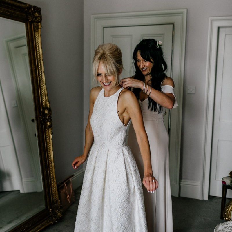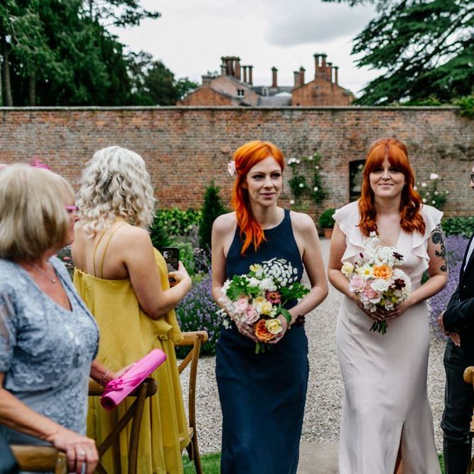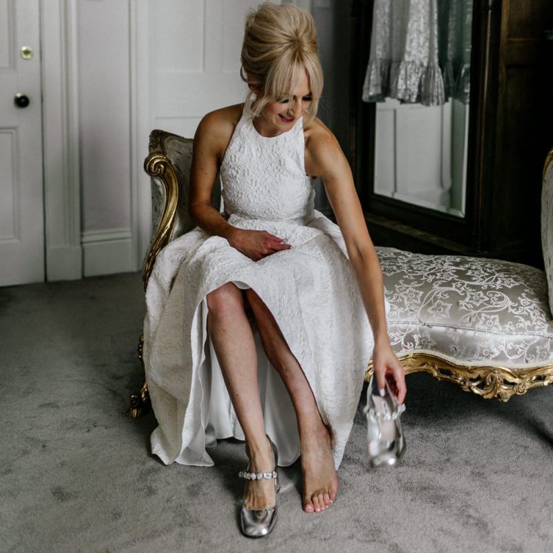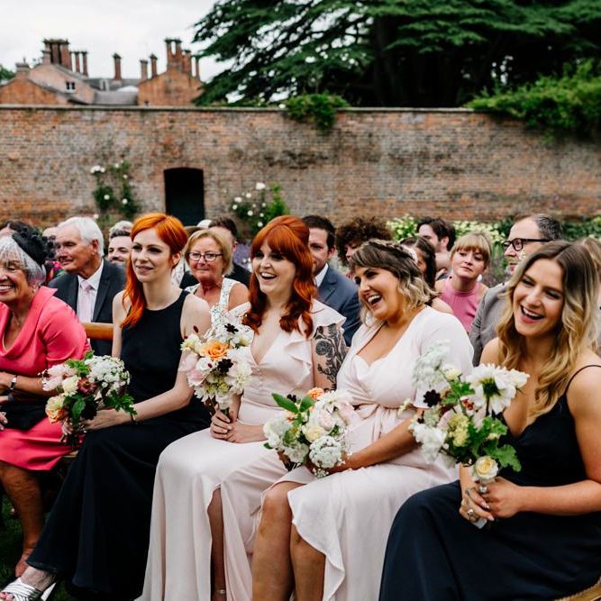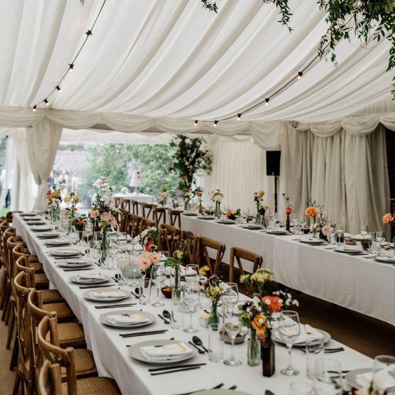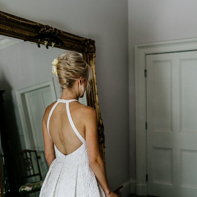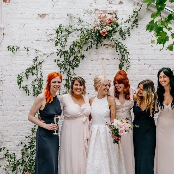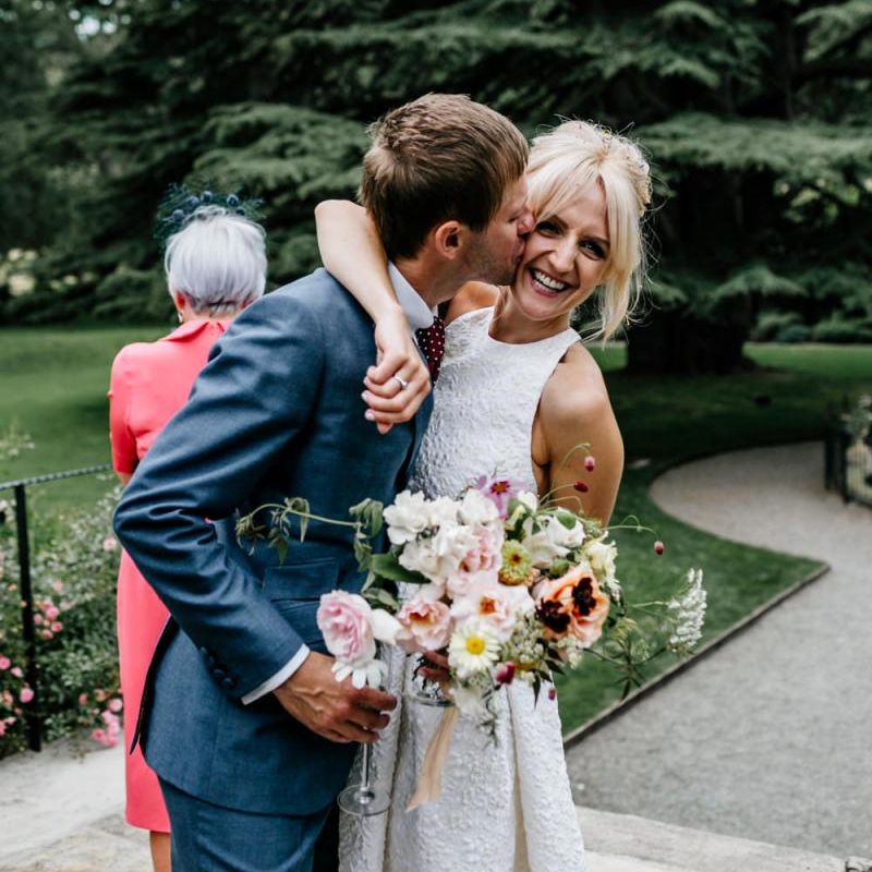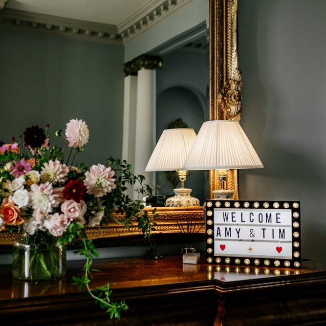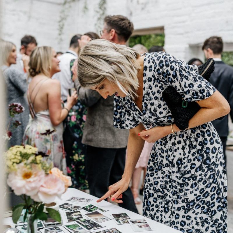 We both have exactly the same taste, which always comes back to a modernist aesthetic, so that influenced the table styling which we wanted to feel clean and modern. Black cutlery with grey and black plates on crisp white table cloths. I do a lot of work with pressed flowers at JamJar Edit, so each guest had a single pressed flower on their napkin. Table flowers were in vintage bottles, all amber and aqua glass, including my favourite little ink bottles from our bottle filled window at JamJar, and one of my favourite JamJar Edit pieces - a flower-filled Rose Globe on the top table.
