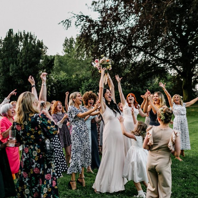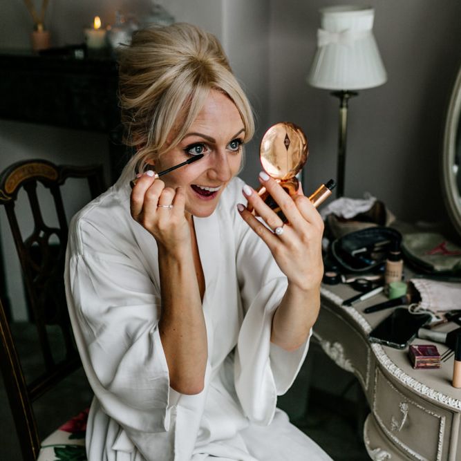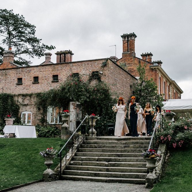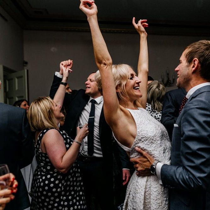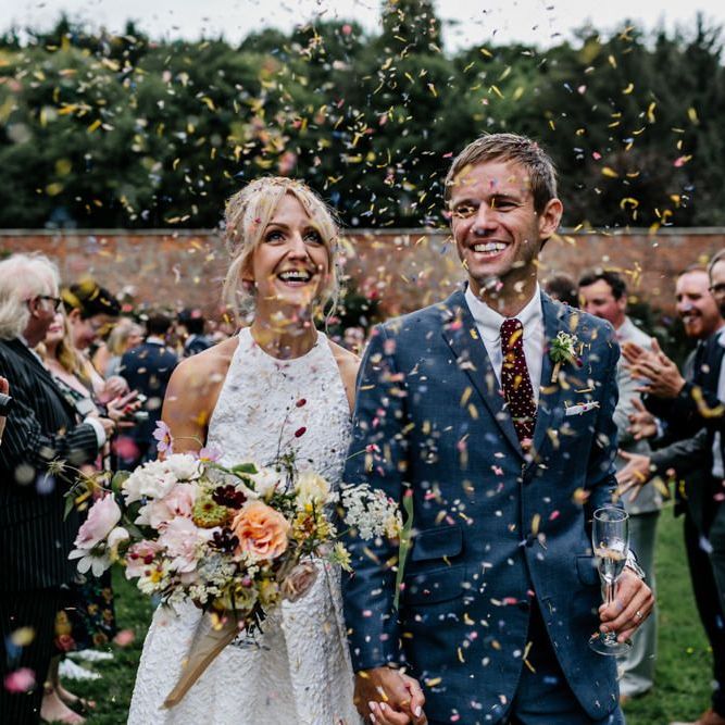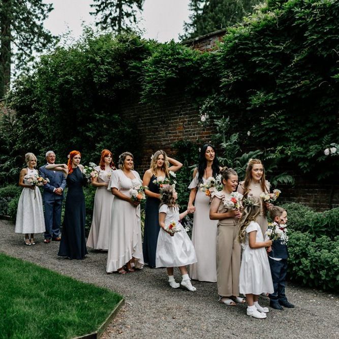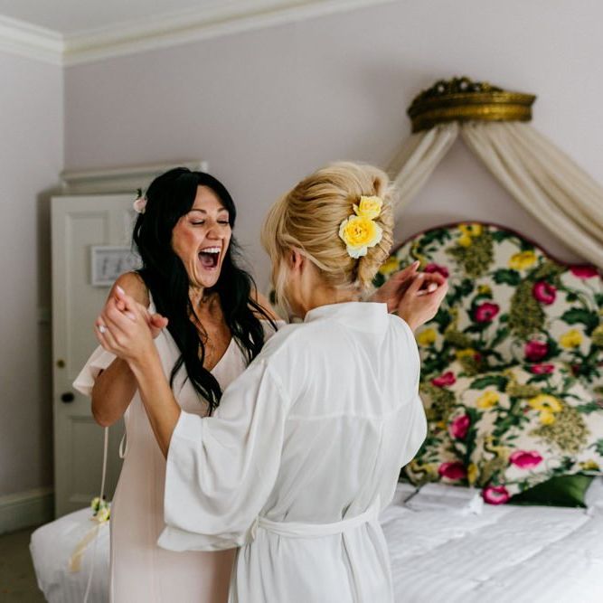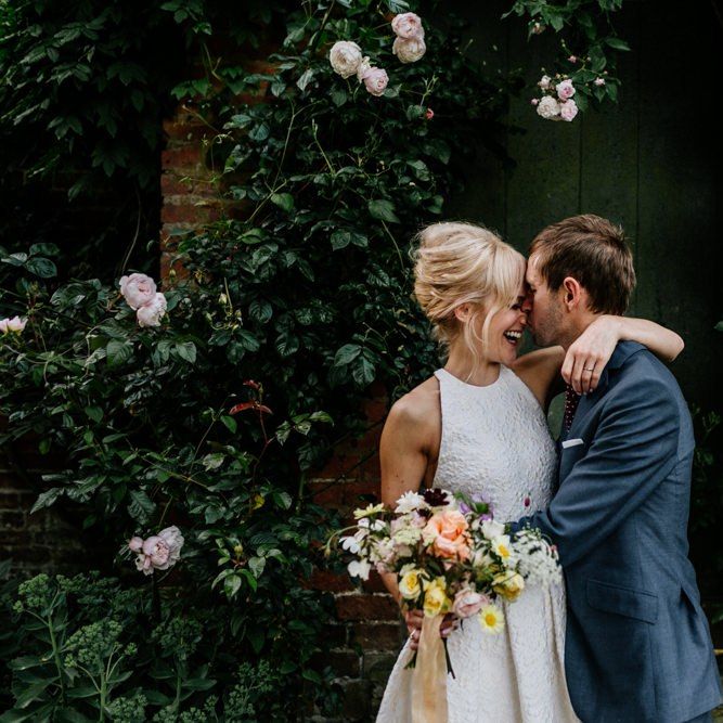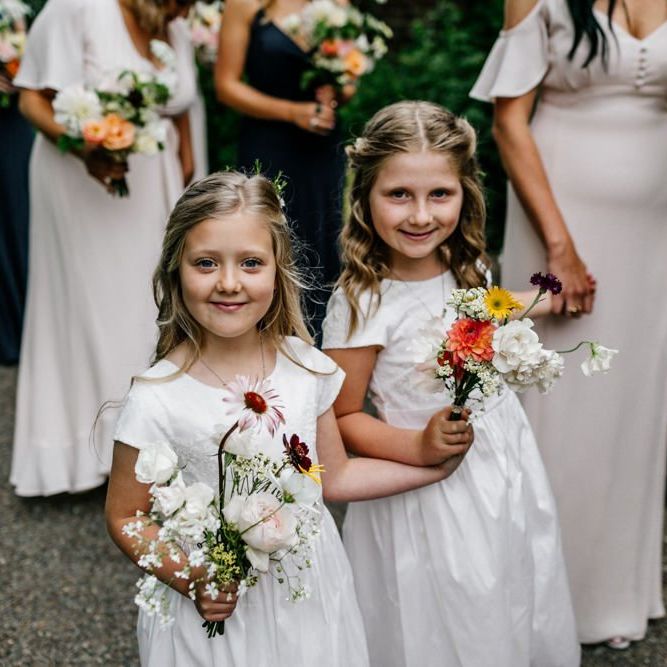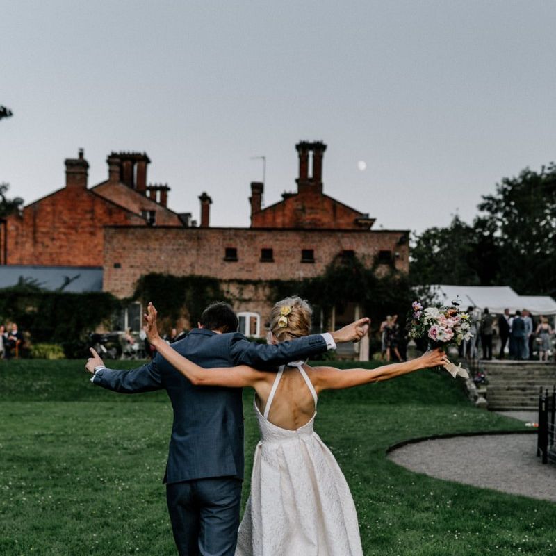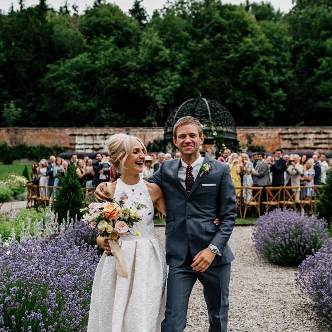 We both have exactly the same taste, which always comes back to a modernist aesthetic, so that influenced the table styling which we wanted to feel clean and modern. Black cutlery with grey and black plates on crisp white table cloths. I do a lot of work with pressed flowers at JamJar Edit, so each guest had a single pressed flower on their napkin. Table flowers were in vintage bottles, all amber and aqua glass, including my favourite little ink bottles from our bottle filled window at JamJar, and one of my favourite JamJar Edit pieces - a flower-filled Rose Globe on the top table.