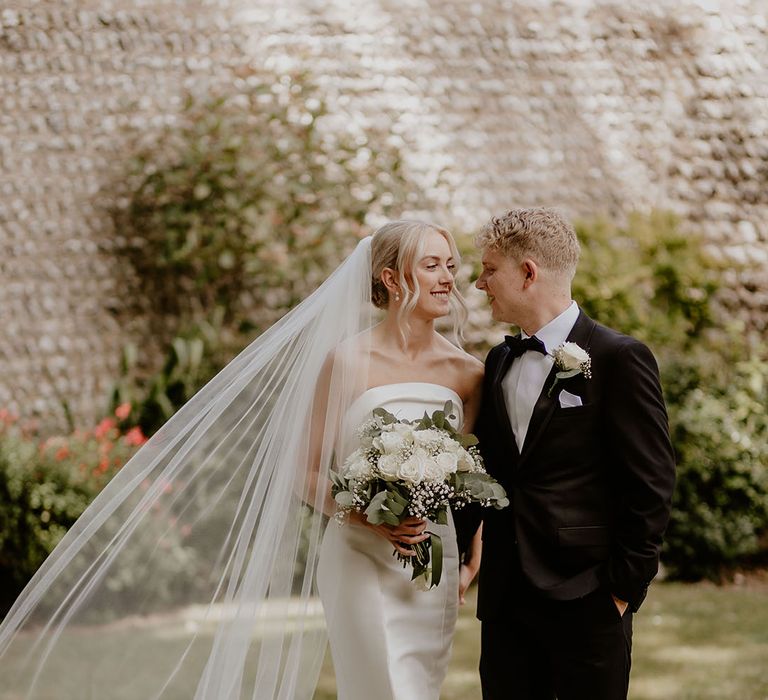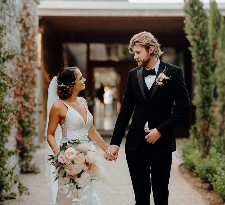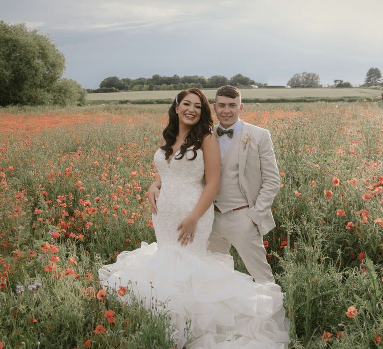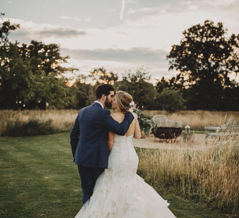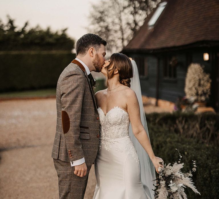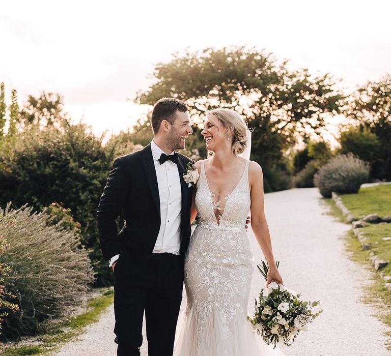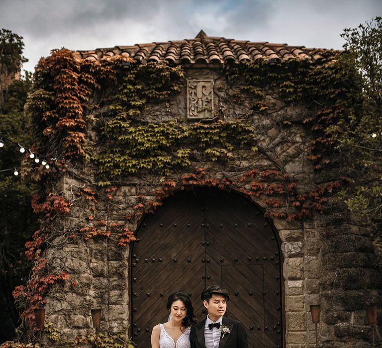 Mermaid wedding dress worn by the bride standing with groom in black tux