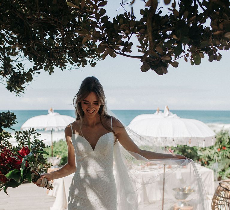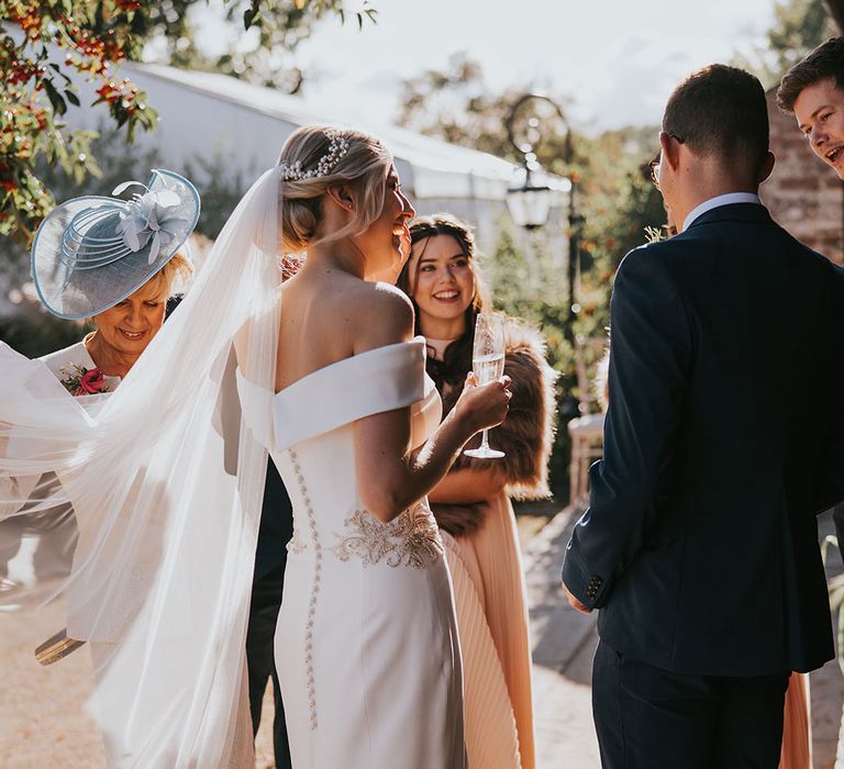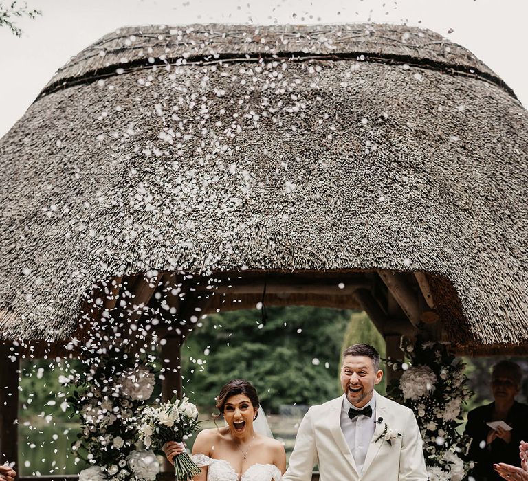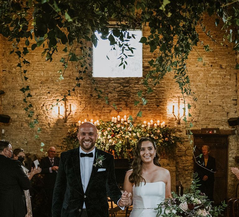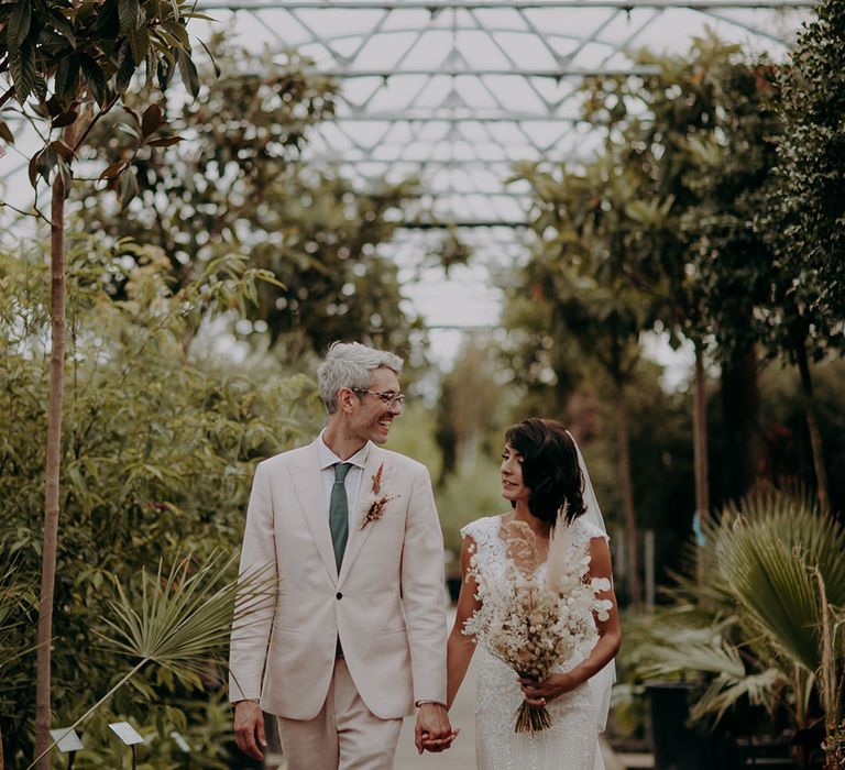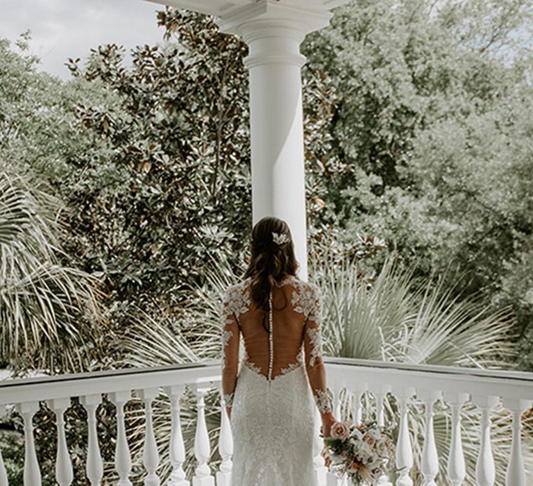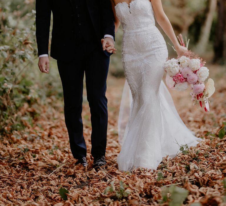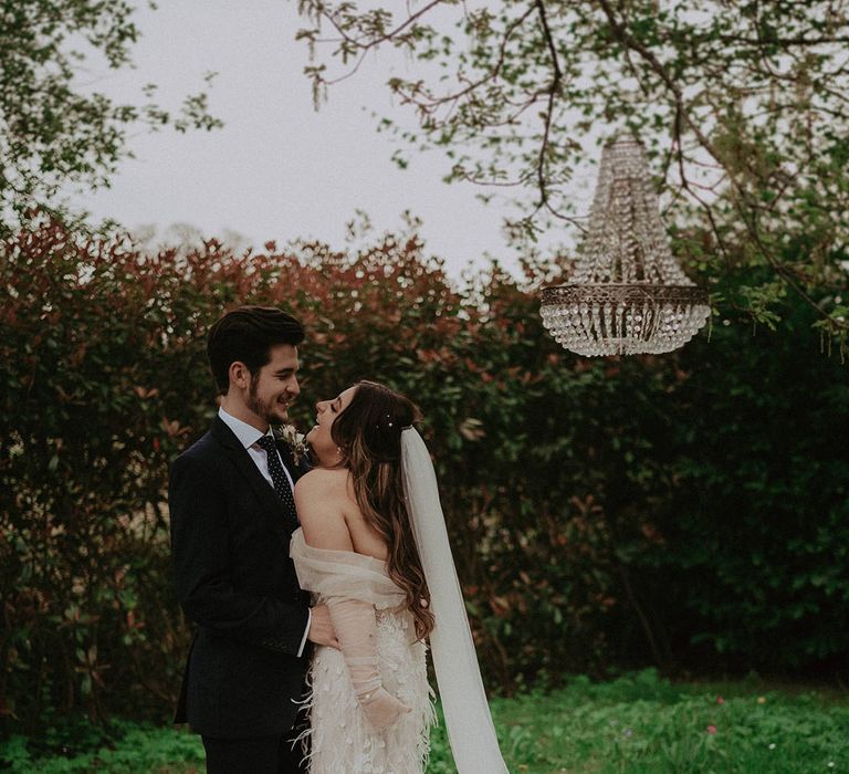 Mermaid wedding dress worn by the bride standing with groom in black tux