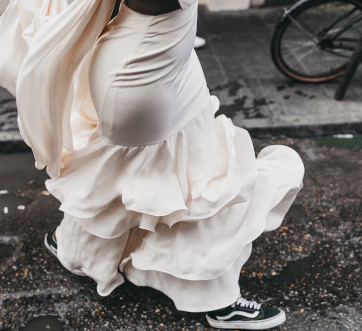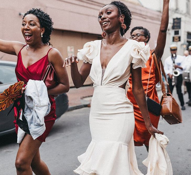 The overall vibe of the day was super chill with wild dancing! We wanted guests to feel comfortable, so there was no strict dress code. We kept the fact that there would be a Second-line procession, a secret from our guests. But I did explain that comfortable footwear was a must. I myself changed out of my wedding shoes and into my Vans trainers, as soon as possible, so I could dance for the entire night. One of my favourite parts of the day was the vow exchange, between Saul and I. It really did feel incredibly intimate. Another moment that springs to mind is our amazing after dinner rain dance. All-day we had been treated to beautiful sunshine, and then as soon as the plates and glassware were cleared away, the heavens opened up. Rather than retreating inside, everyone ran out and the brass band kept playing. We all got soaked dancing in the rain, and I’m not sure I’ve ever been happier.