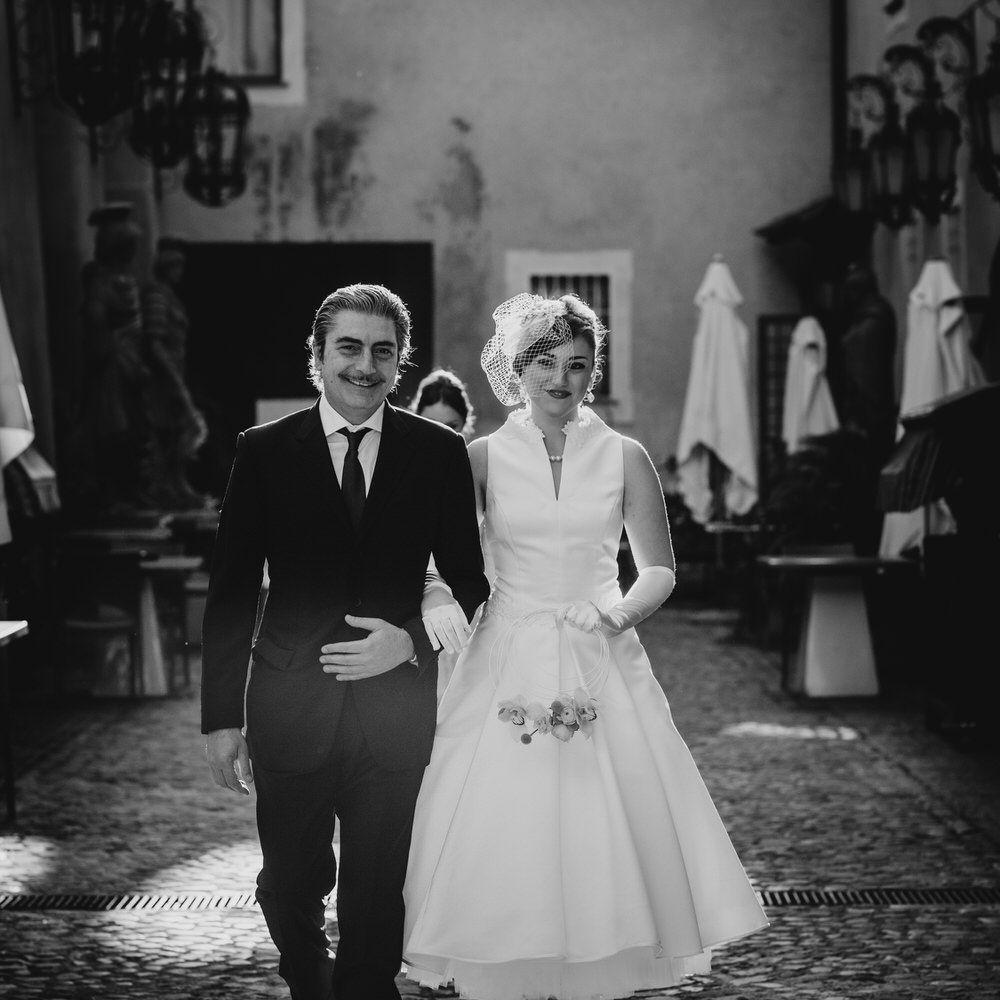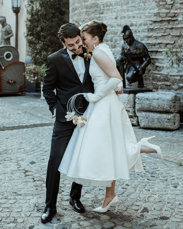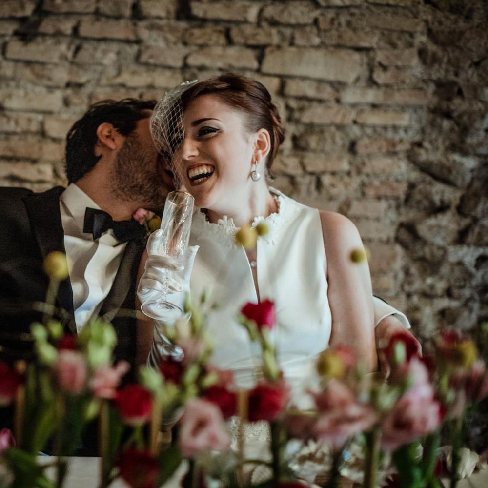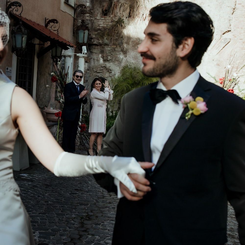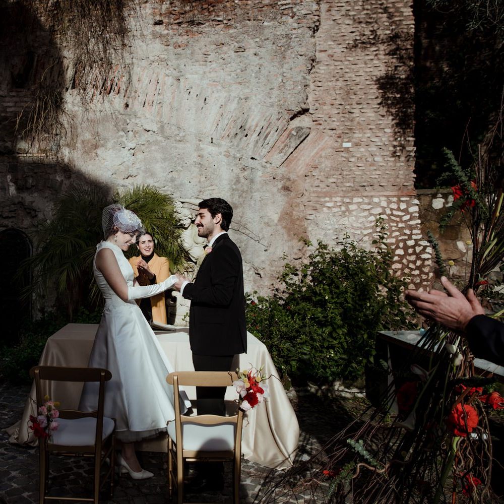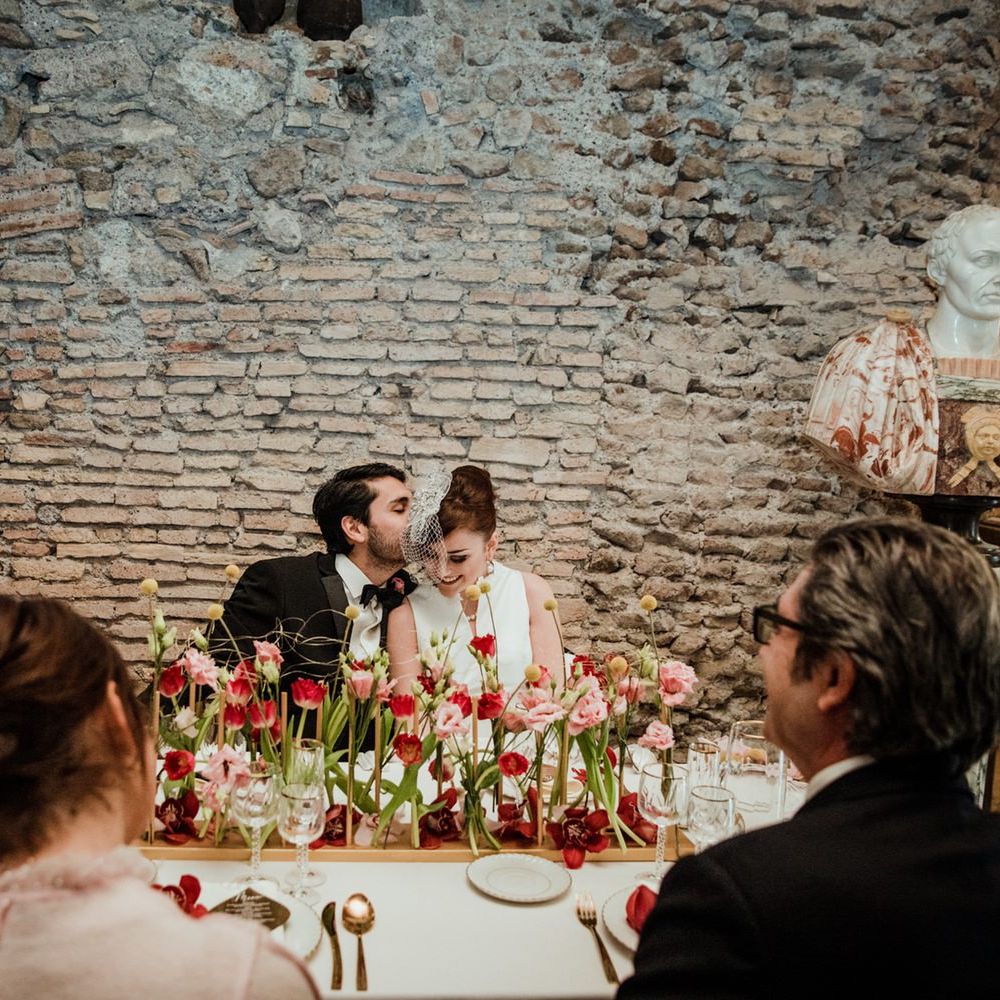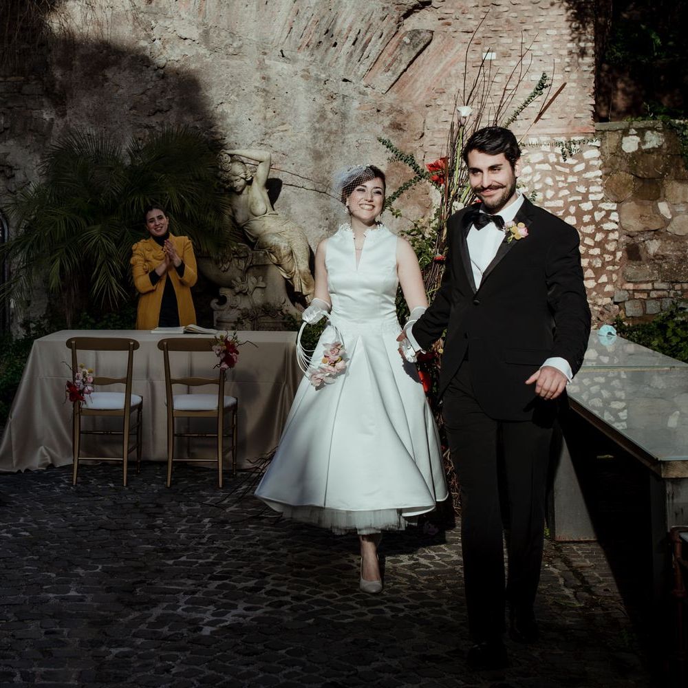 We found the photographer thanks to your vendors list, and decided to use all local vendors because we lived in Rome for our studies. Rome was also the city where Lucas proposed to me. From our invitations to our wedding dinner, everything was create exclusively for us. We loved sharing our vision with our suppliers. Maya of Missprint immeditately understood our needs and created the most beautiful stationery and favours for us and our guests. Our photographer Rosapaola was our perfect match because of her fun attitude and beautiful portfolio. Daniela at La Vie en Blanc Atelier had the perfect 60s vintage style wedding dress I wanted. Once she understood my vision she took care everything, choosing my elegant bridal shoes, gloves and hat with a veil. For our flowers, I loved the way Viviana took care of each detail. The asymmetrical wedding décor during the ceremony and the flowers on our dinner table were truly original.