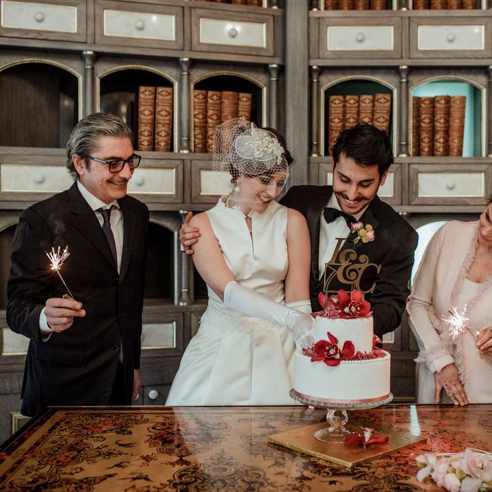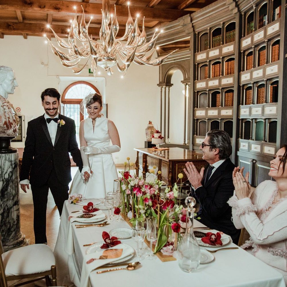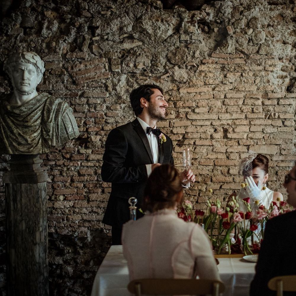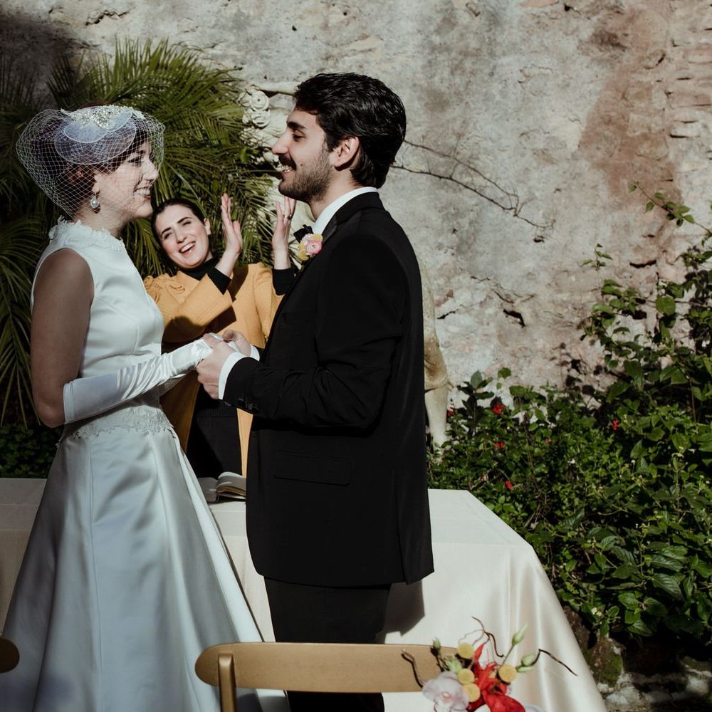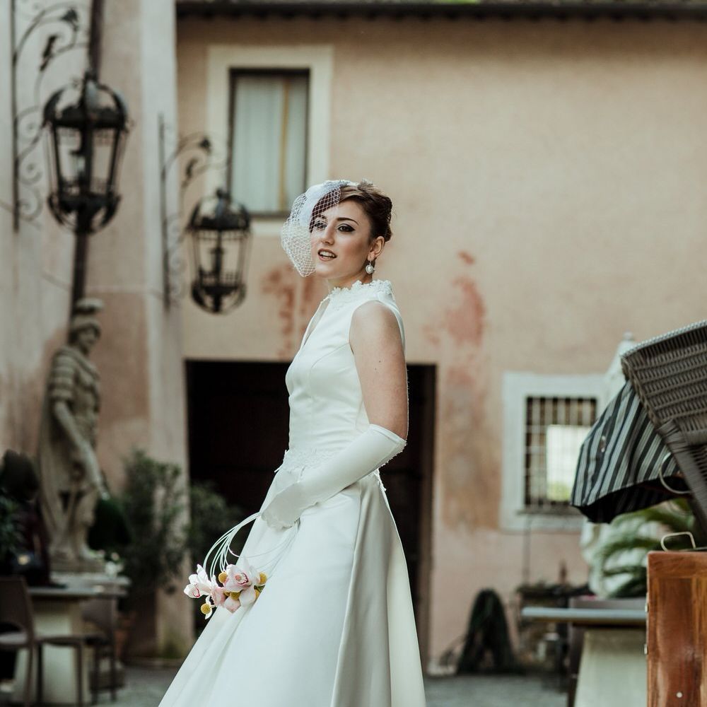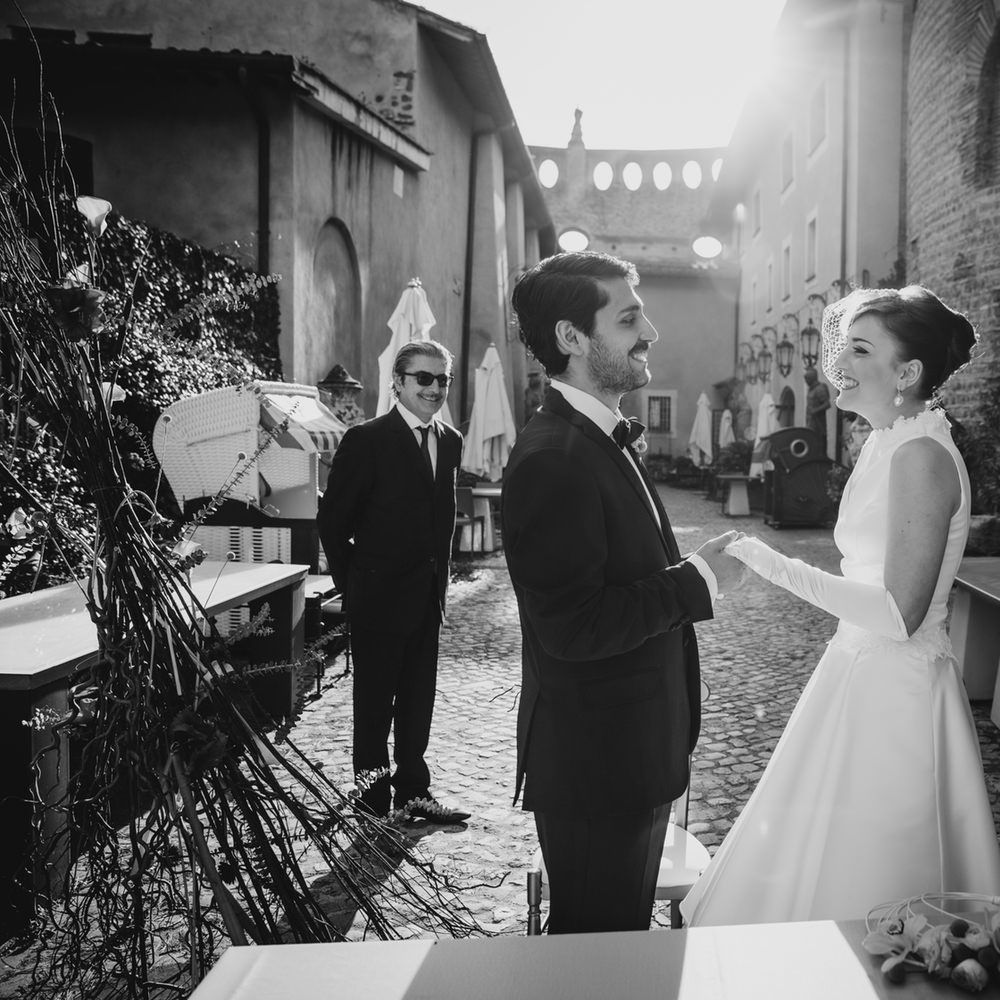 We found the photographer thanks to your vendors list, and decided to use all local vendors because we lived in Rome for our studies. Rome was also the city where Lucas proposed to me. From our invitations to our wedding dinner, everything was create exclusively for us. We loved sharing our vision with our suppliers. Maya of Missprint immeditately understood our needs and created the most beautiful stationery and favours for us and our guests. Our photographer Rosapaola was our perfect match because of her fun attitude and beautiful portfolio. Daniela at La Vie en Blanc Atelier had the perfect 60s vintage style wedding dress I wanted. Once she understood my vision she took care everything, choosing my elegant bridal shoes, gloves and hat with a veil. For our flowers, I loved the way Viviana took care of each detail. The asymmetrical wedding décor during the ceremony and the flowers on our dinner table were truly original.